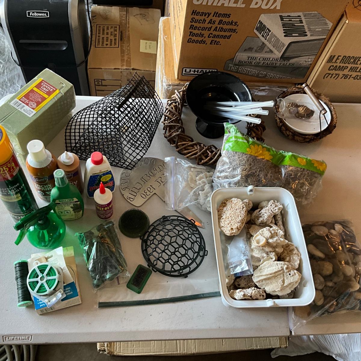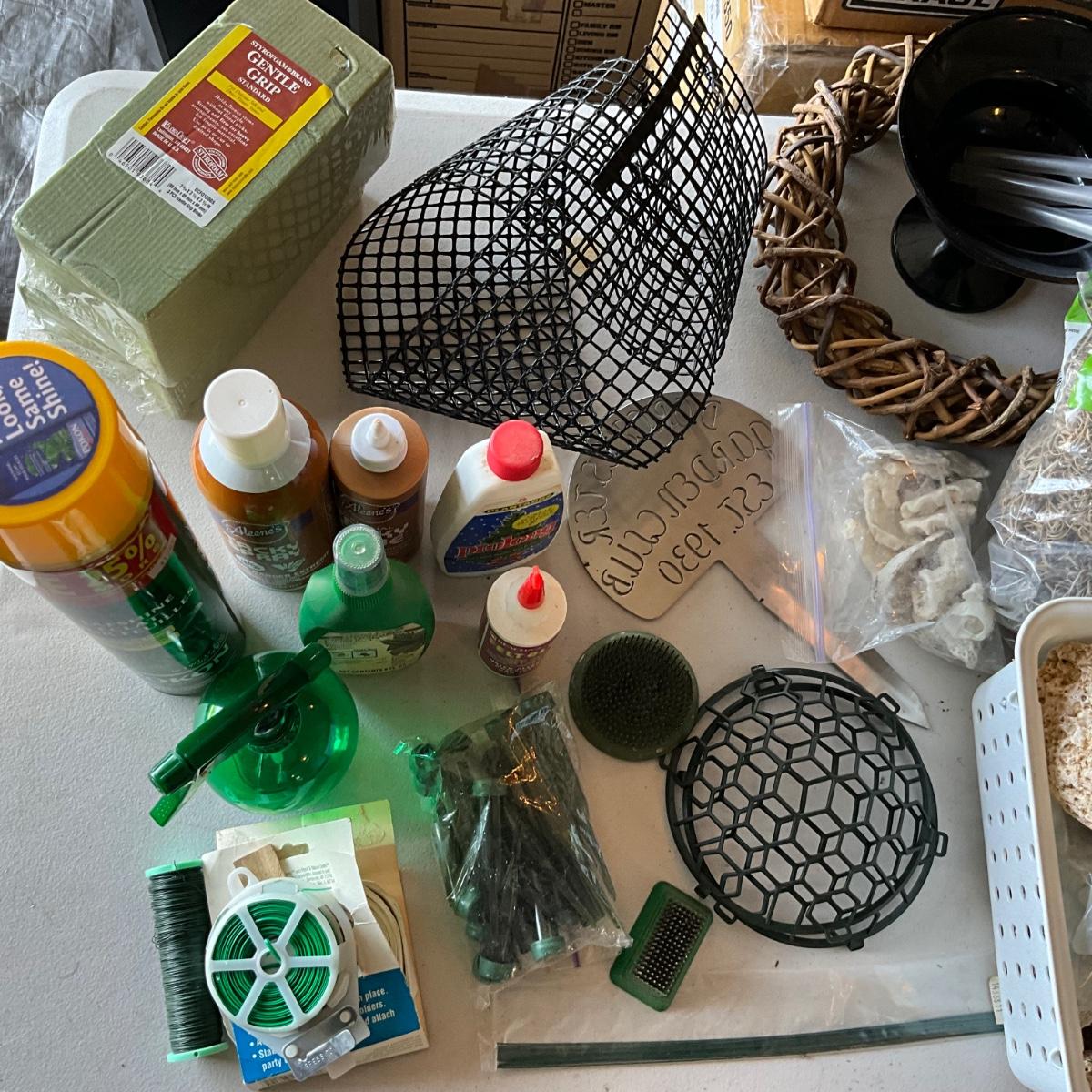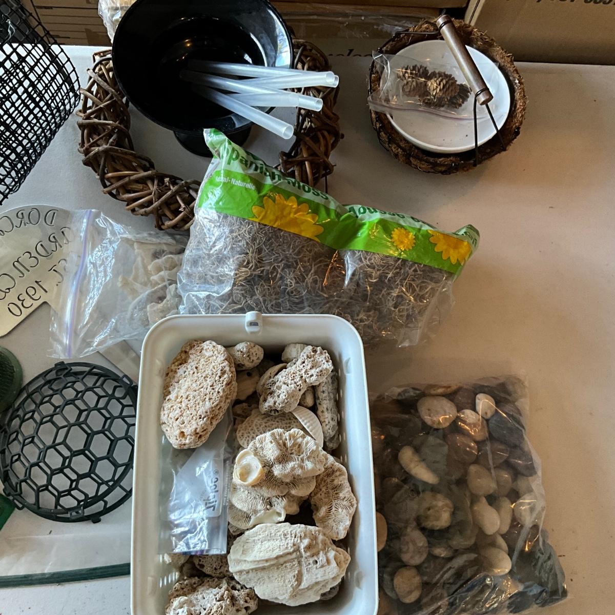 Various tools for making dried flower arrangements, with shells and rocks, wire and more