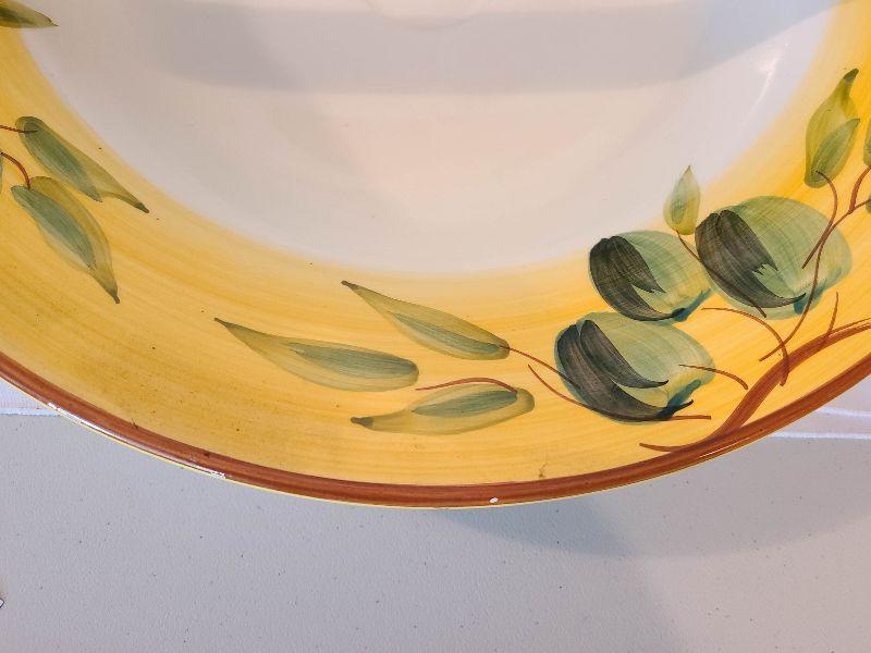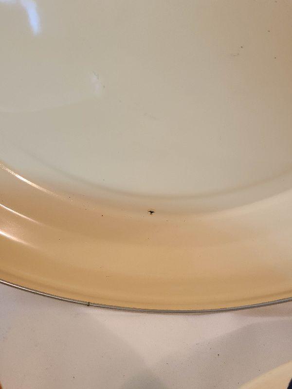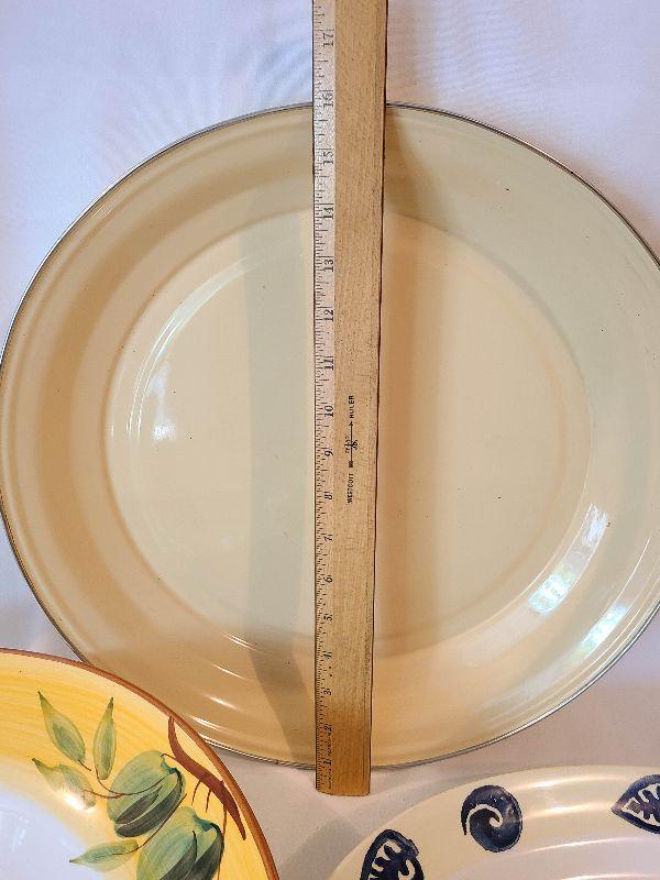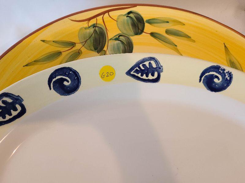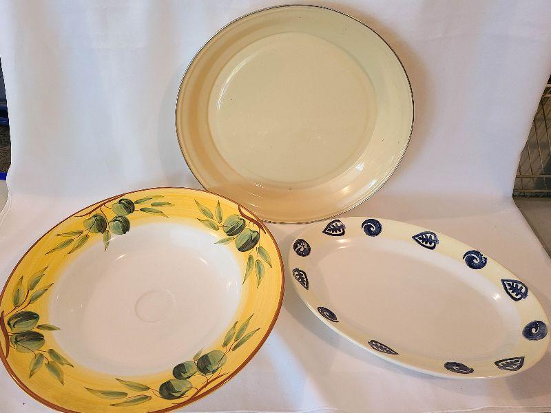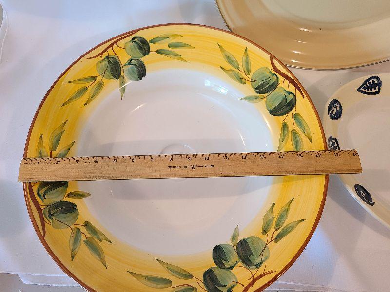 Please see pictures for content/condition of the lot. Plain Round yellow is metal for outdoor serving and others are ceramic. Good luck and happy bidding.