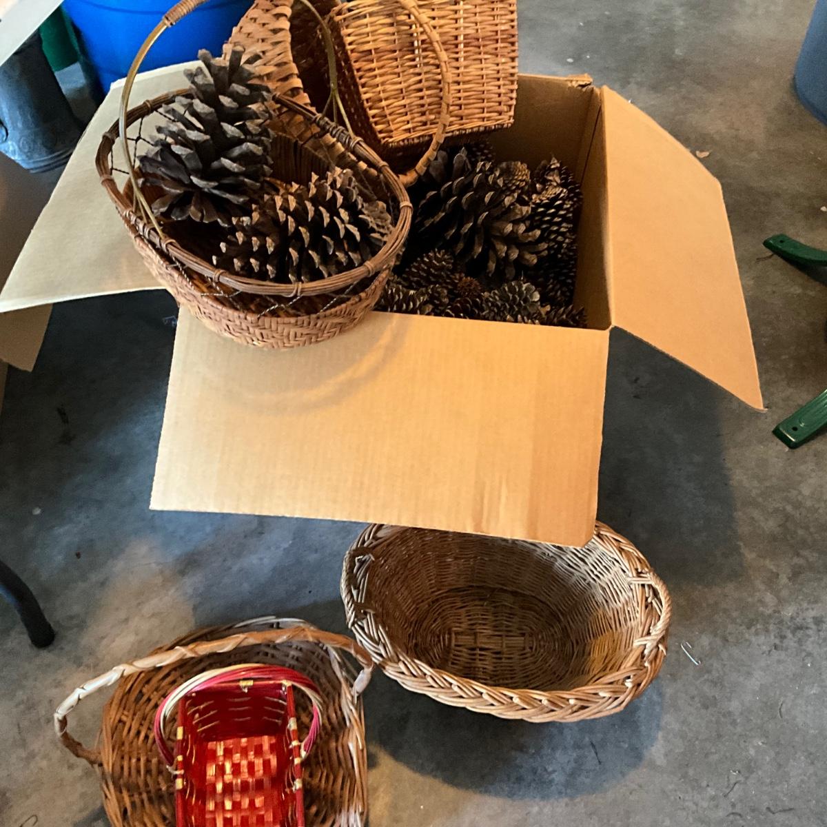 Large 18 x 18 x 16 full of pinecones with various baskets
