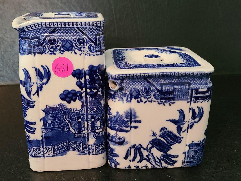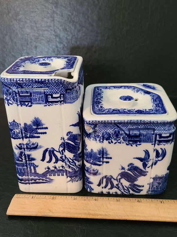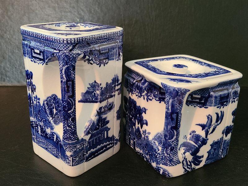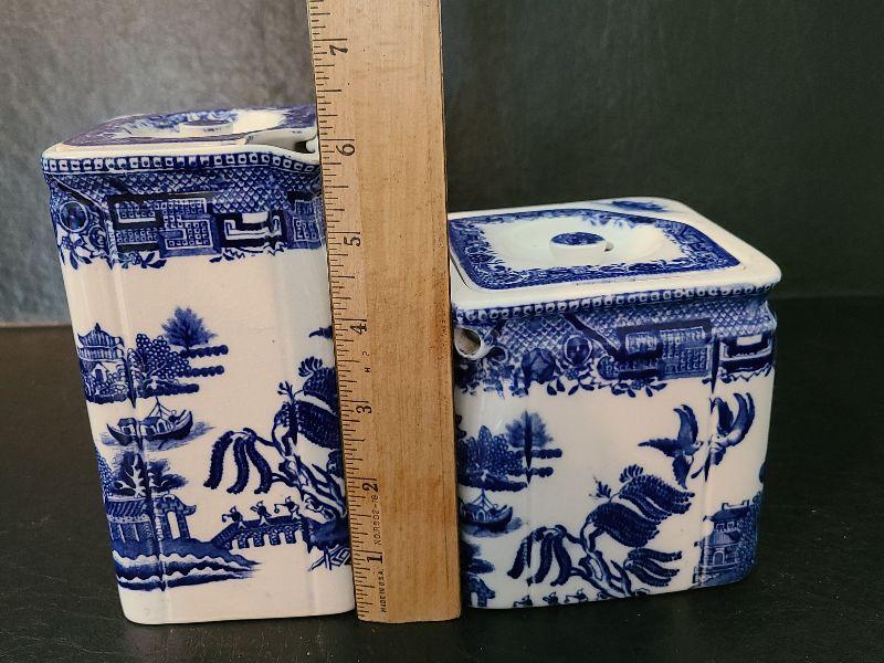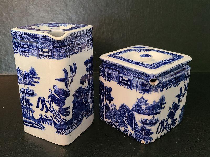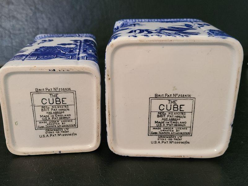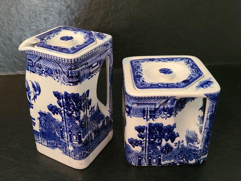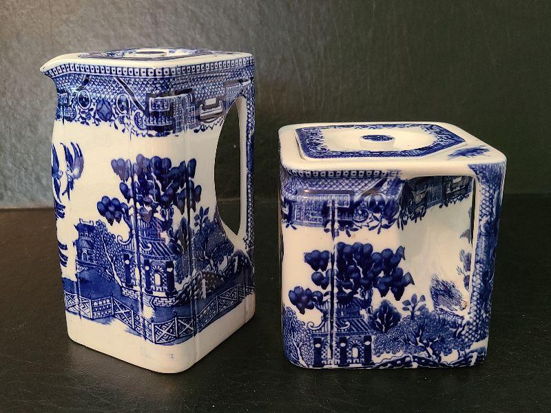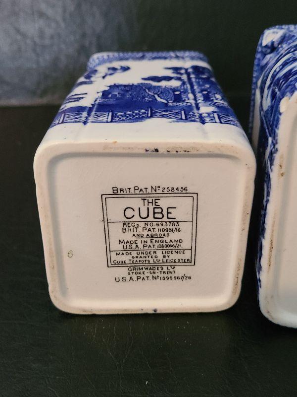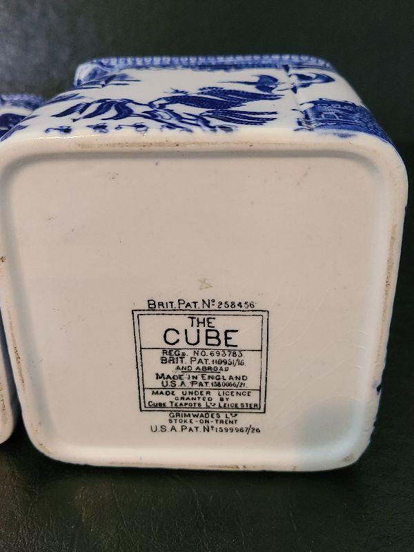 "The Cube Tea Pot" Made in England. Blue Willow design. Please see all pictures for exact contents of the lot, condition of the items, and if measurements if taken. Thank you for looking and have fun bidding.