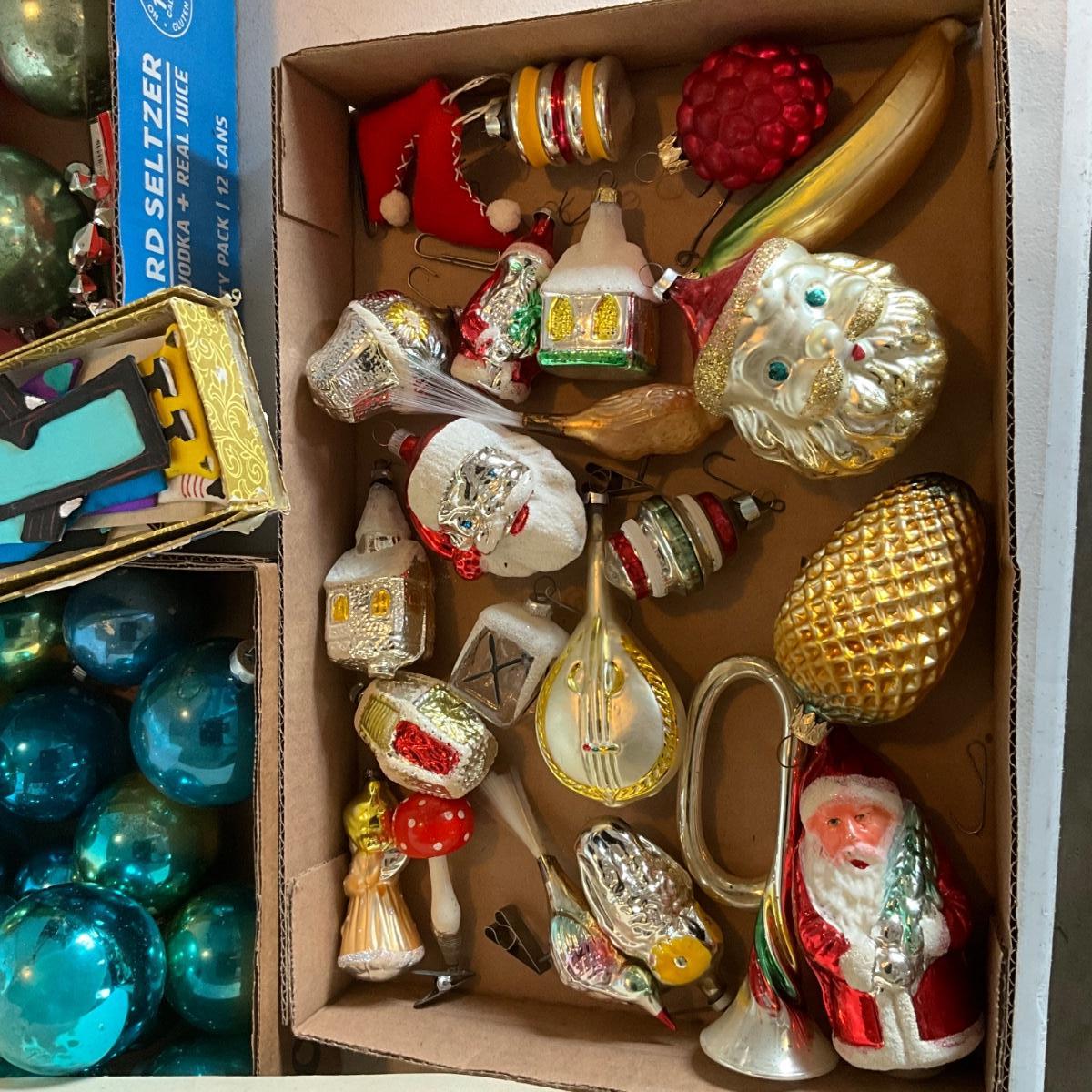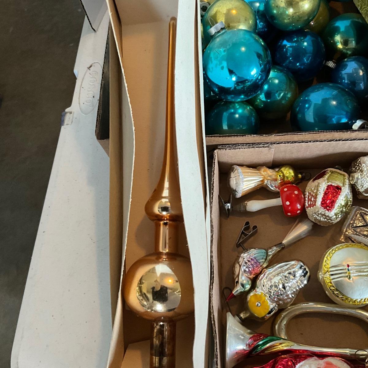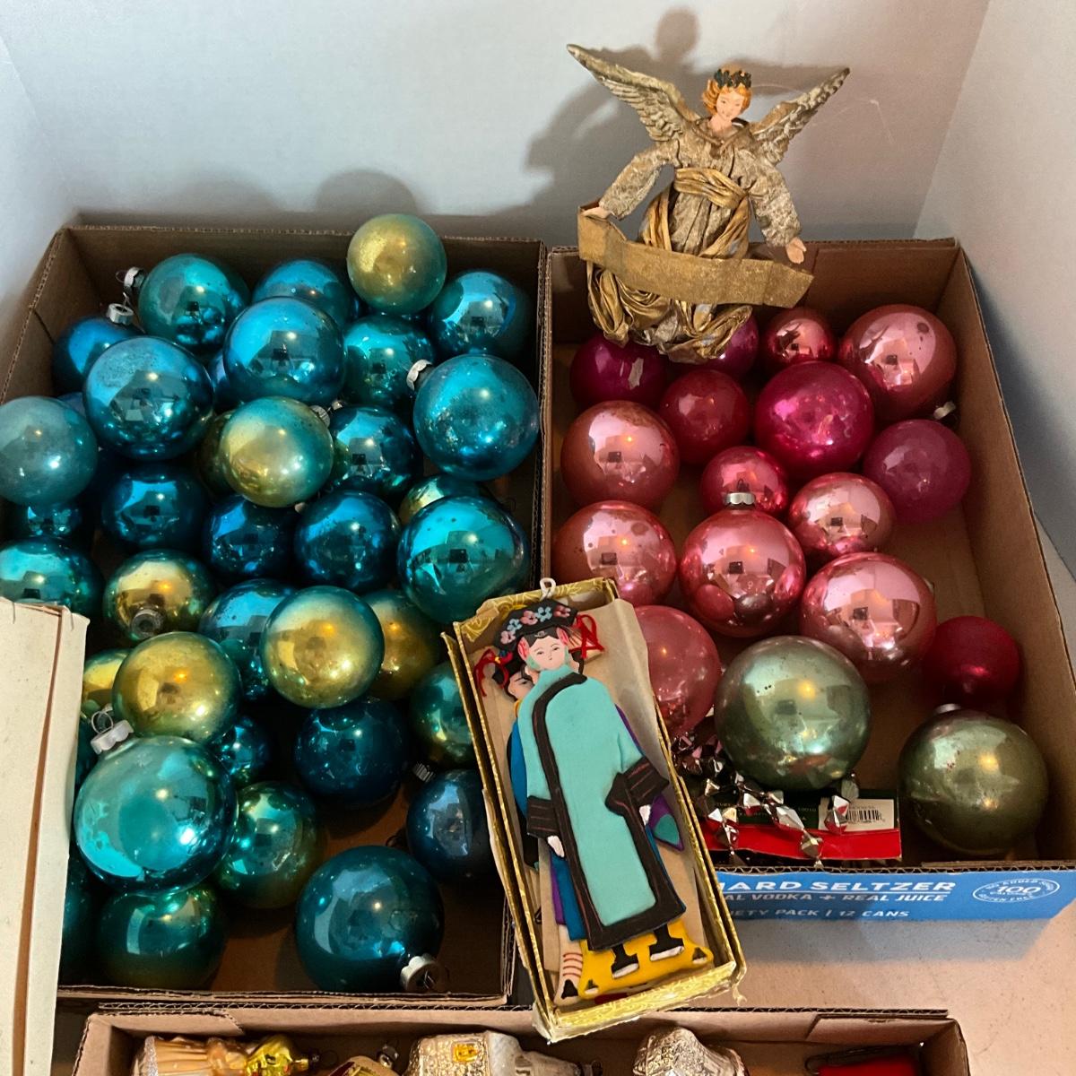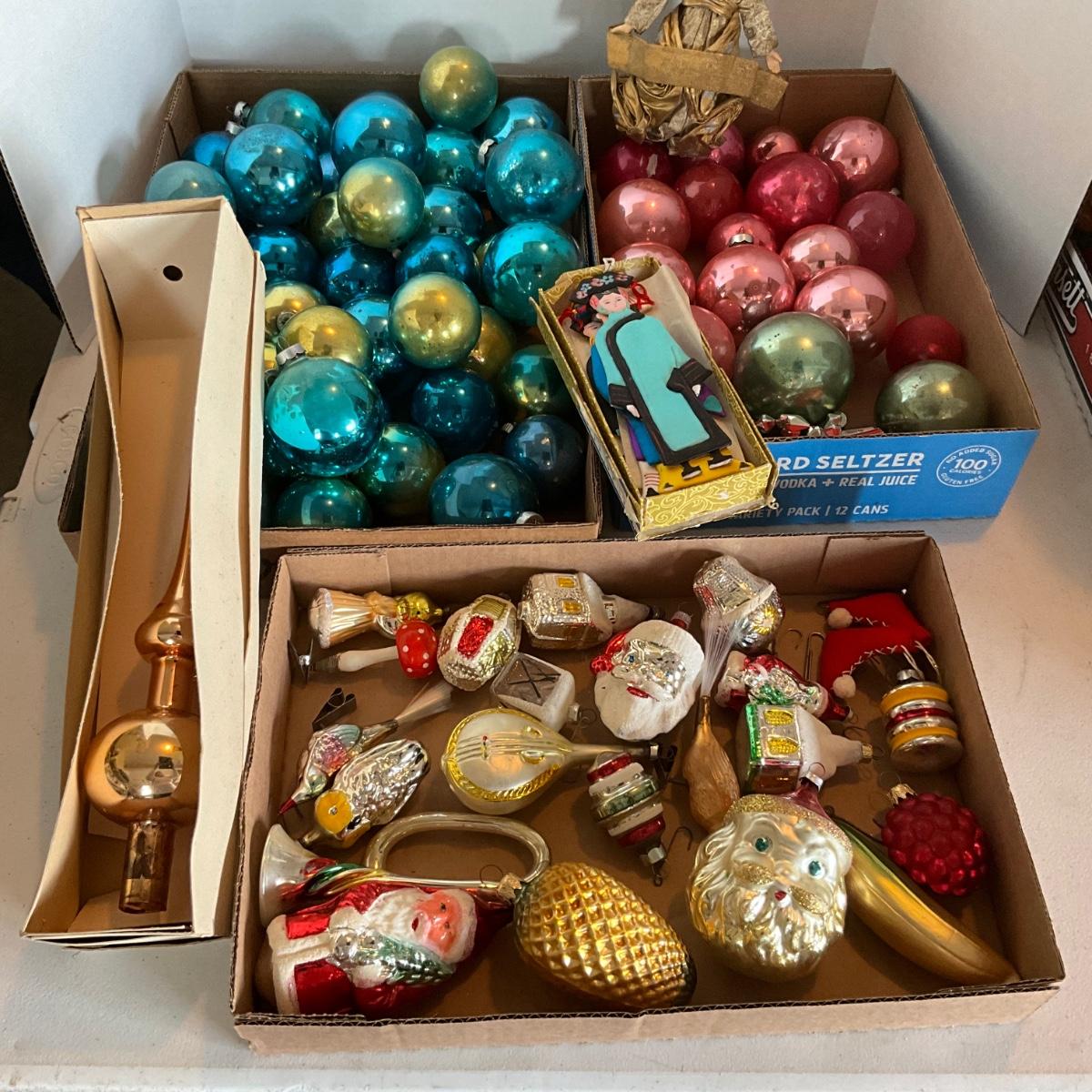 G2193 Three Flats of Vintage Glass Pink and Blue Balls with Figural Glass Ornaments