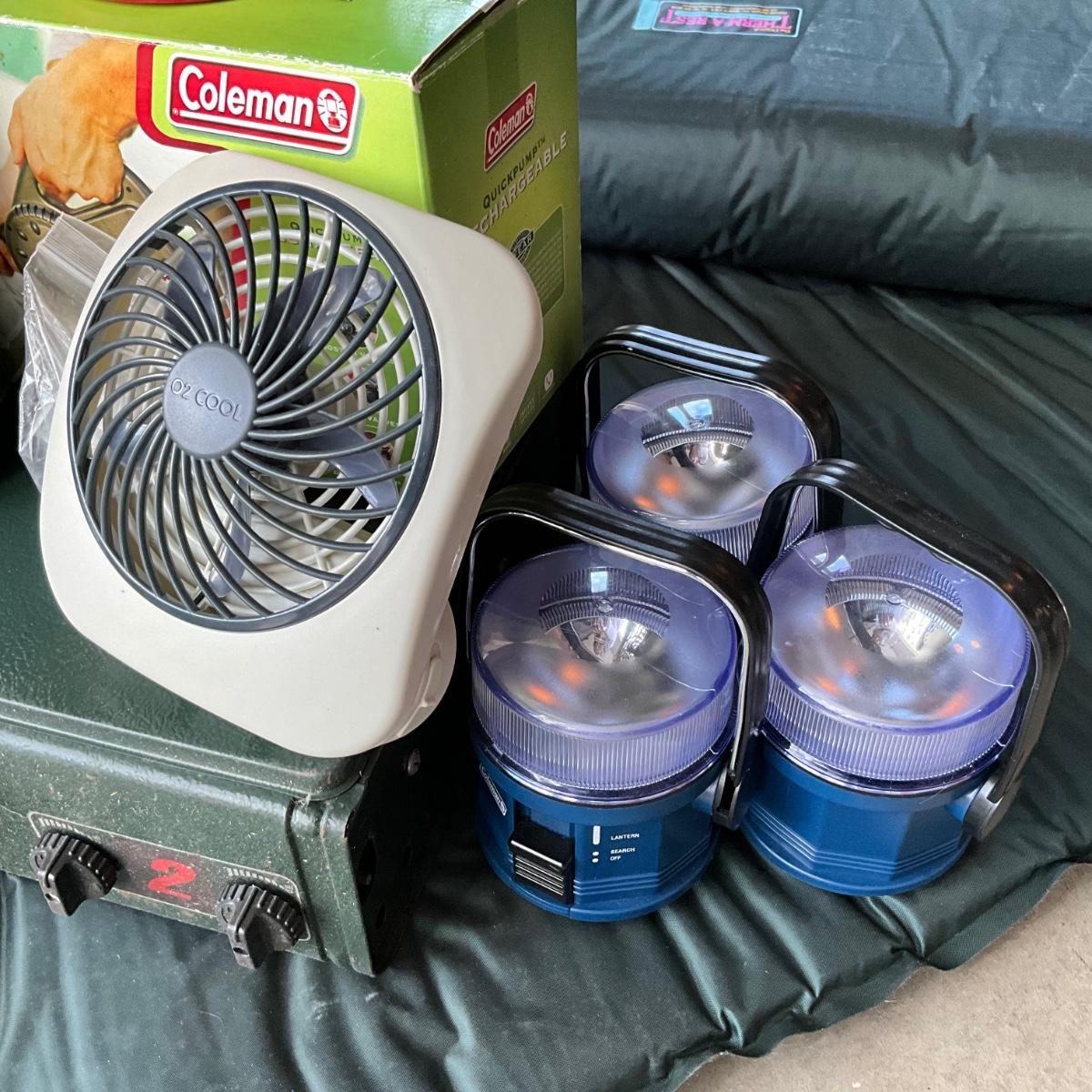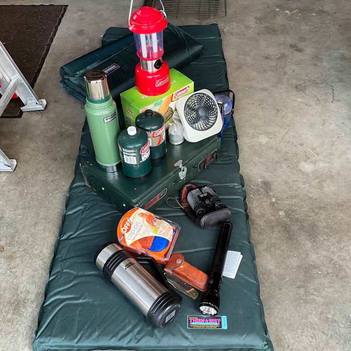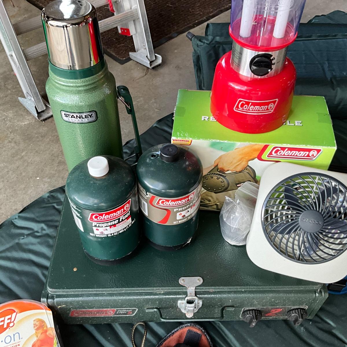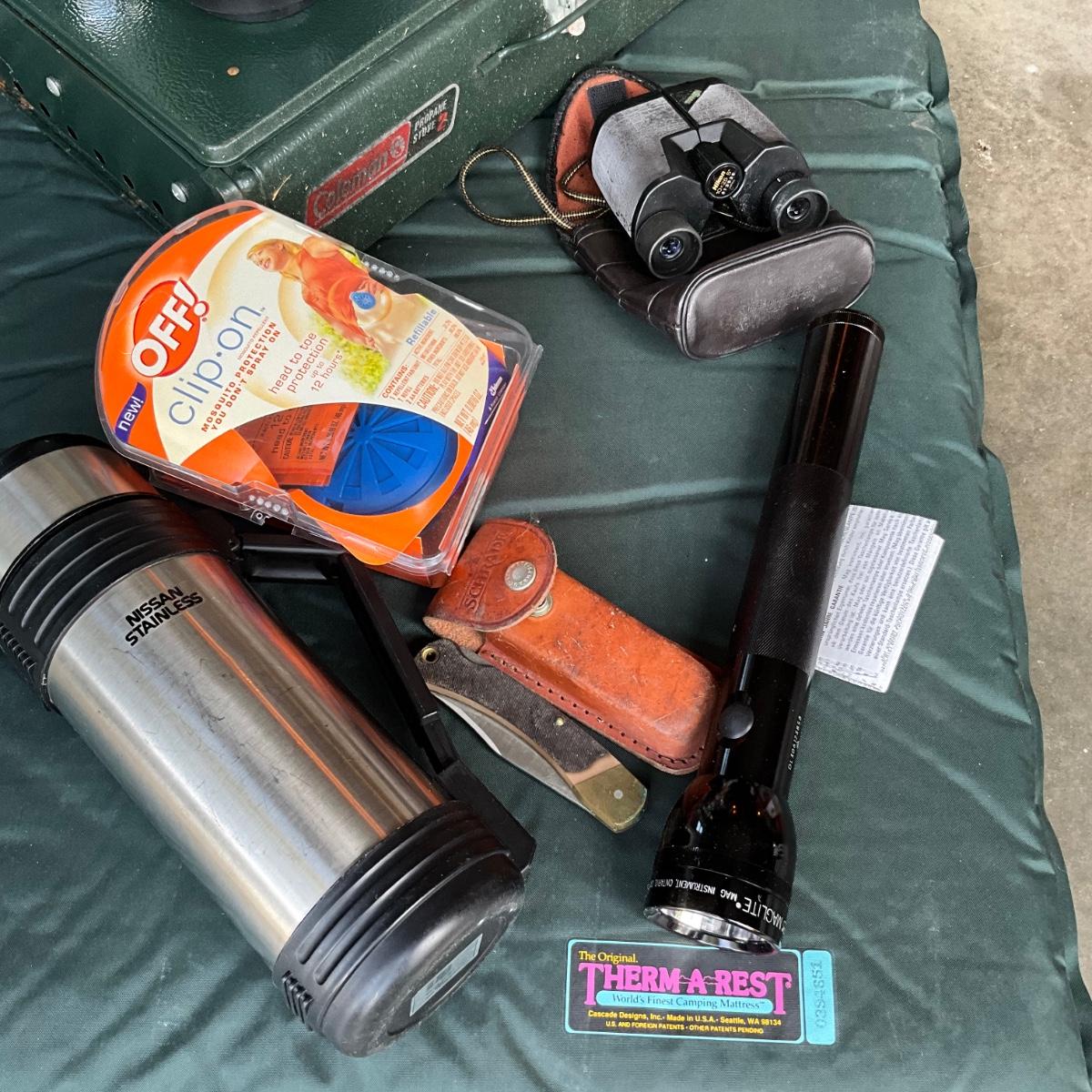 Coleman Two Stove , lanterns, thermos, off, binoculars, knife and more