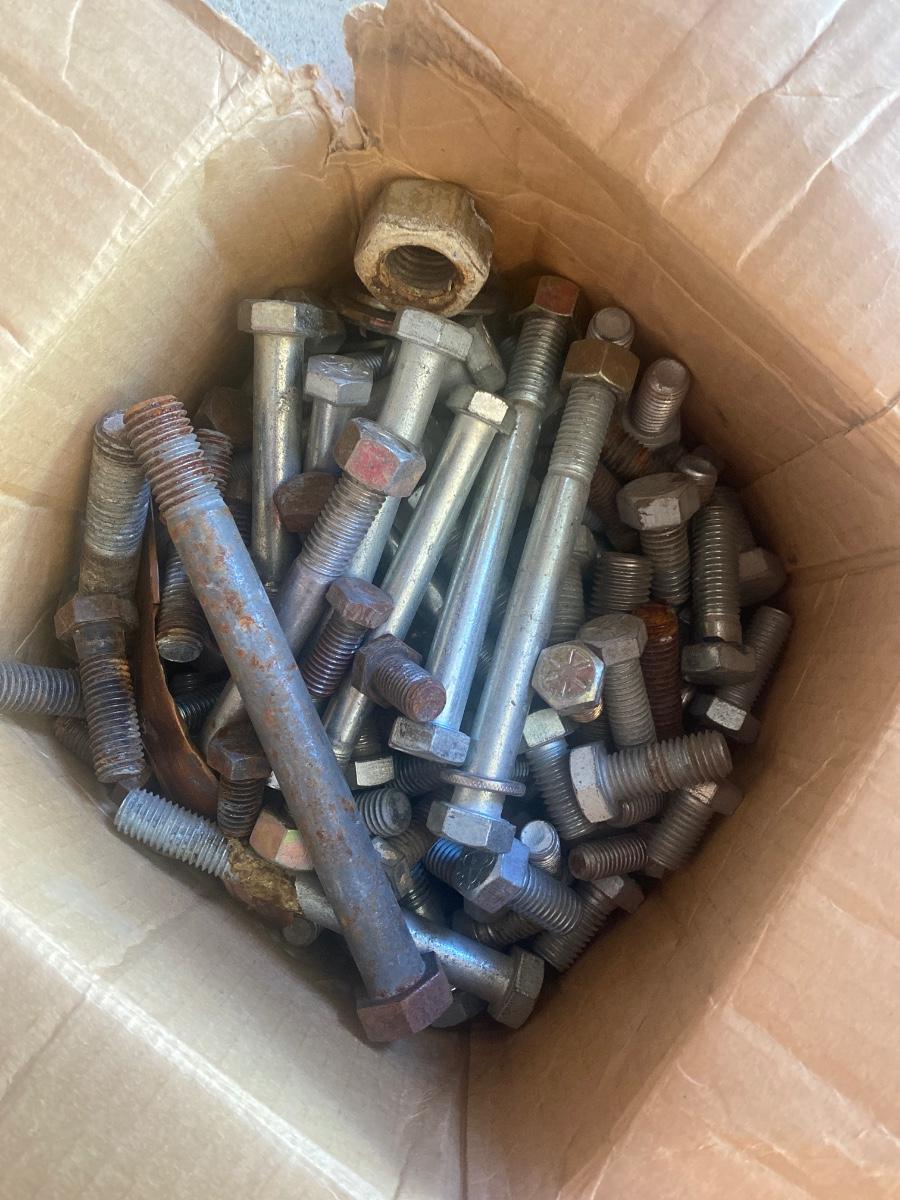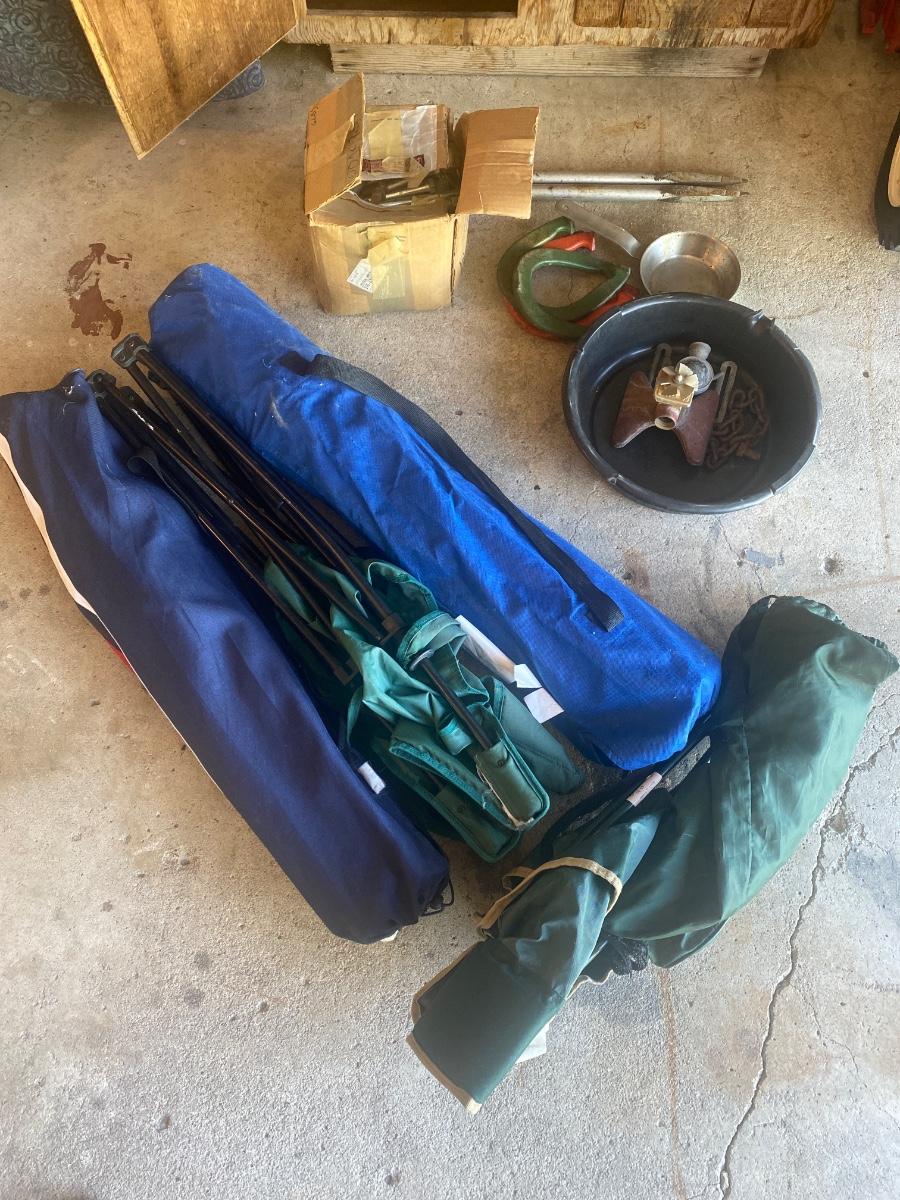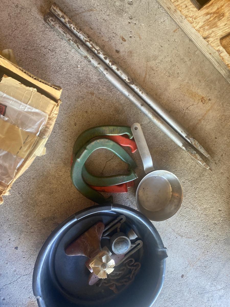 G3 Misc, horseshoes, sprinkler, large bolts, and 4 outdoor chairs.