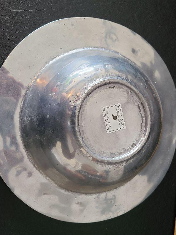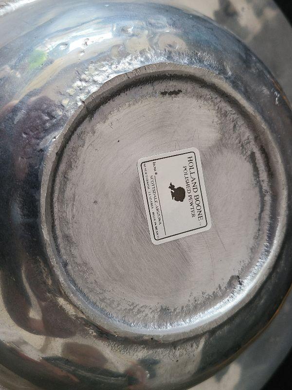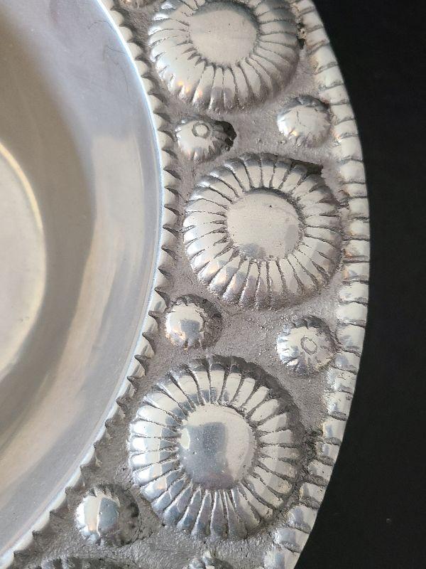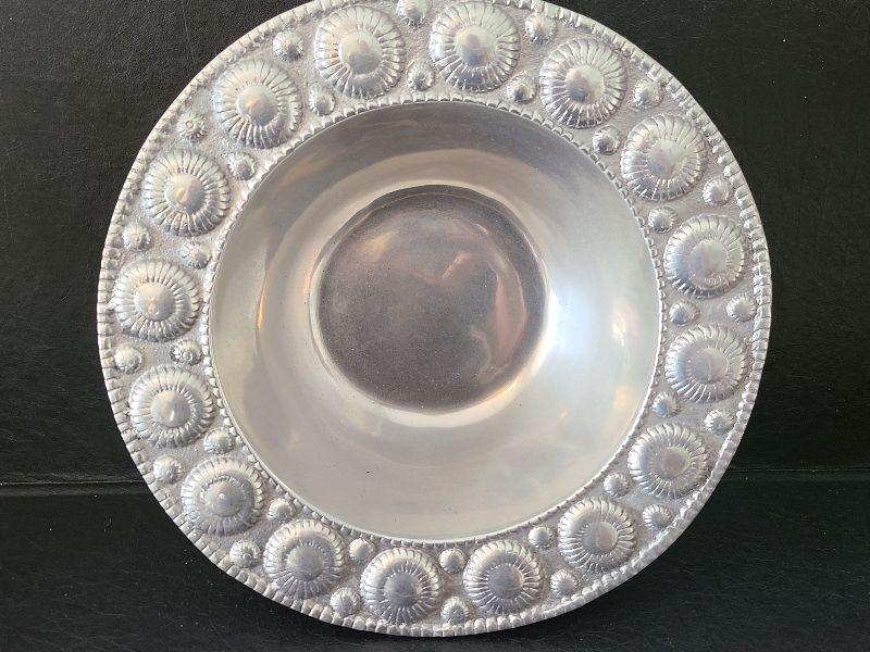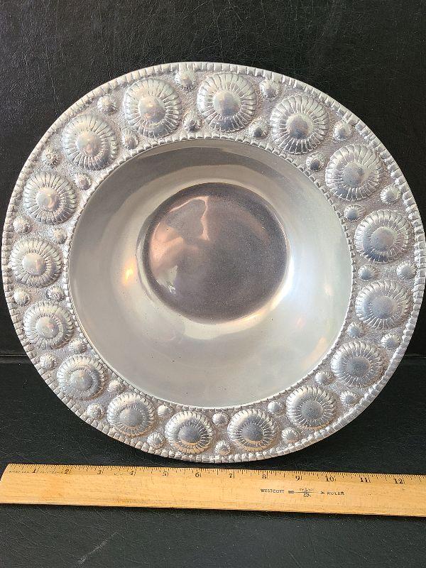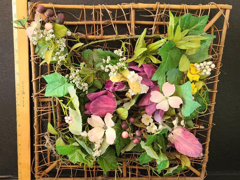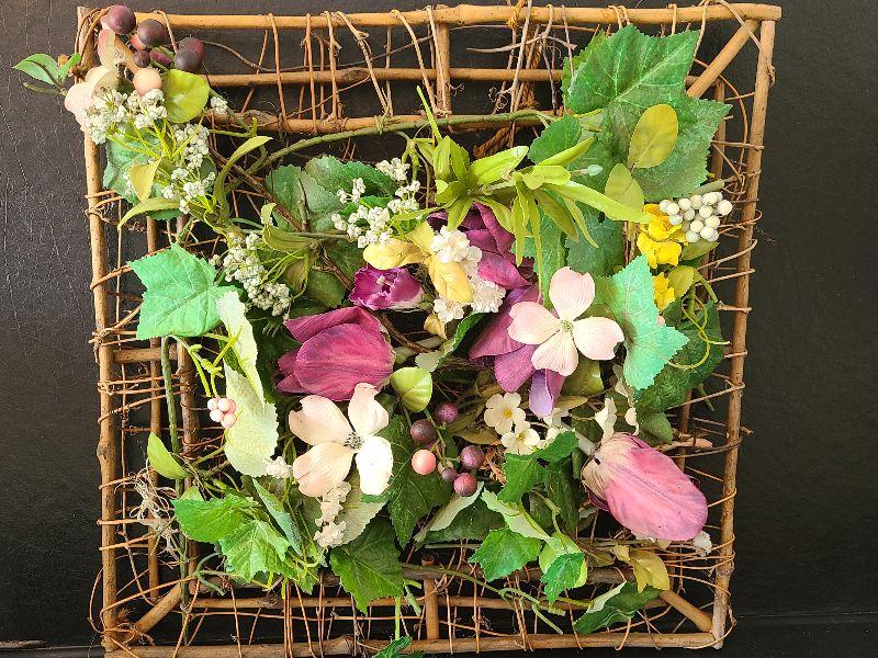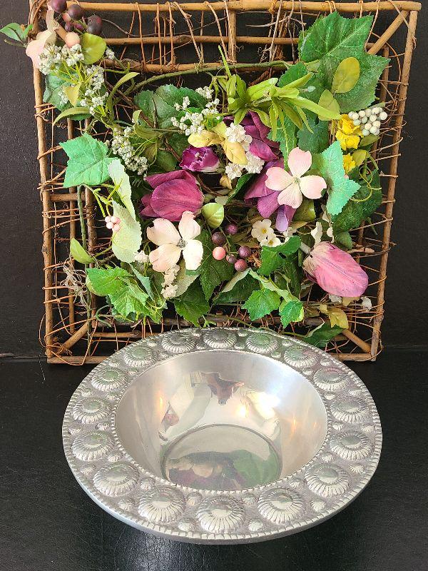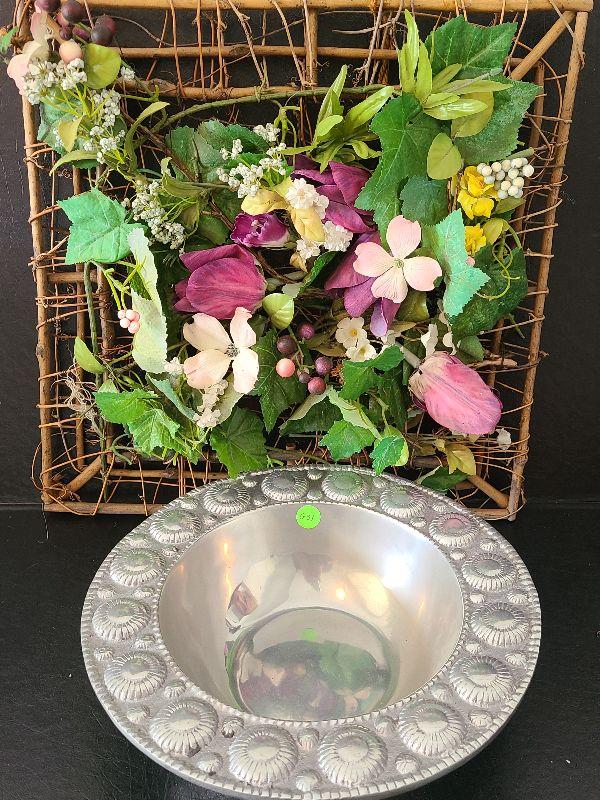 Pewter bowl with raised designs on the rim, and a square wreath with colorful flowers.