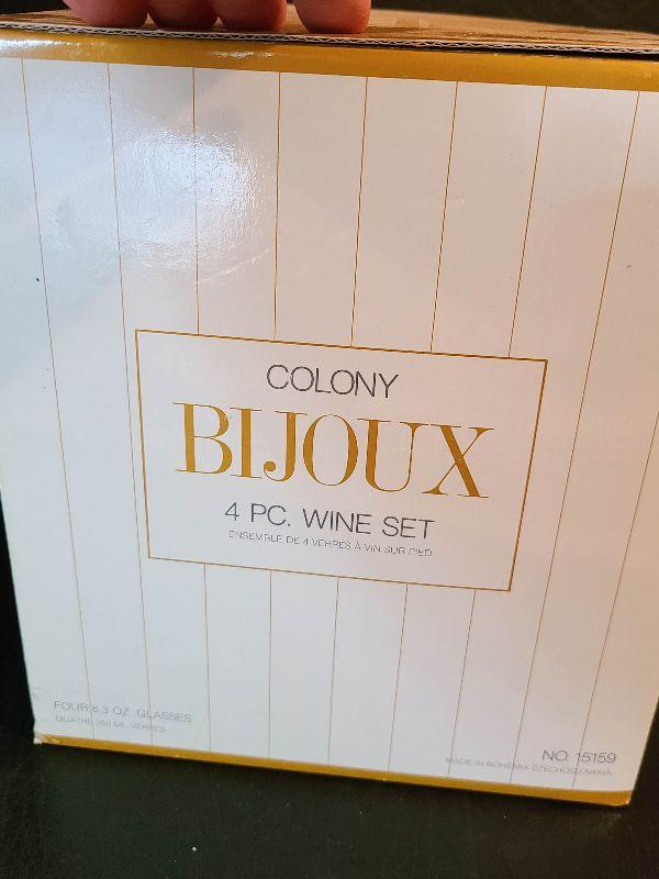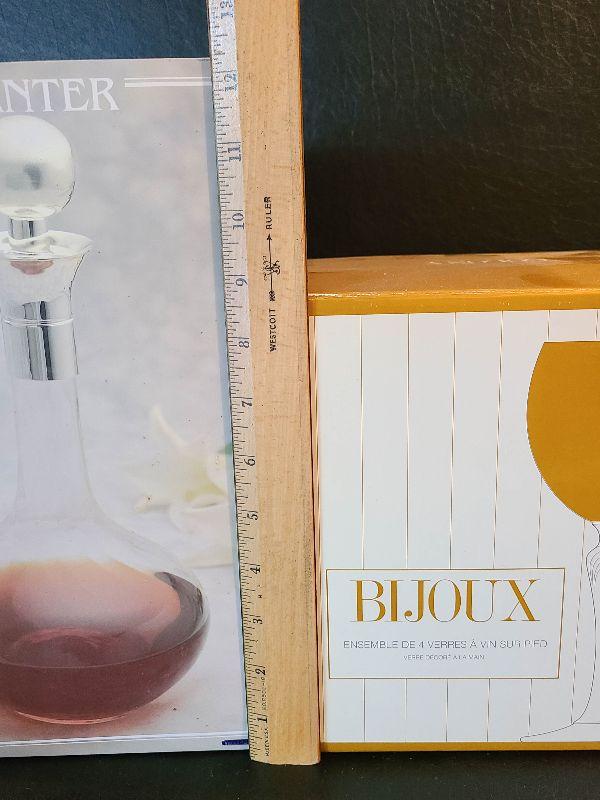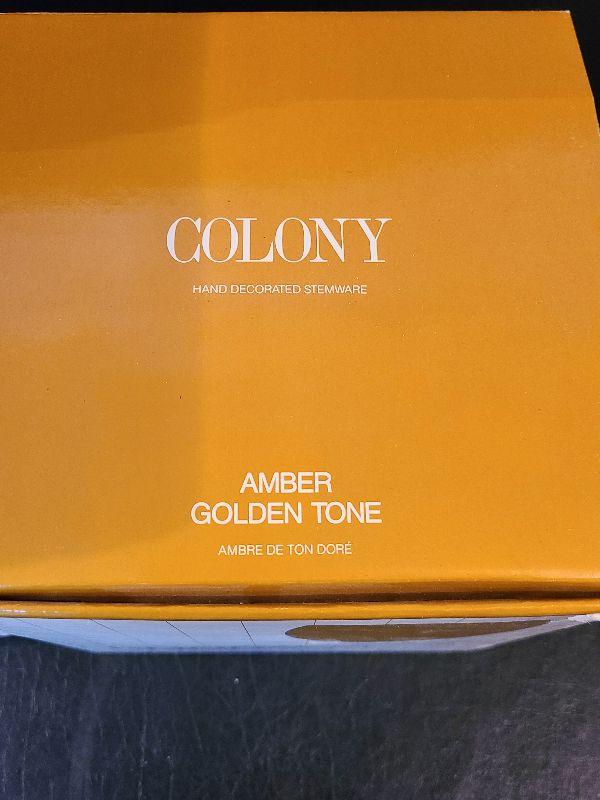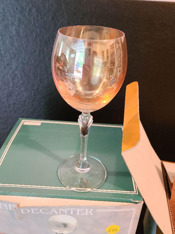 New in the box. Clear decanter, and gold luster glasses. Please see pics for details, contents of the lot.