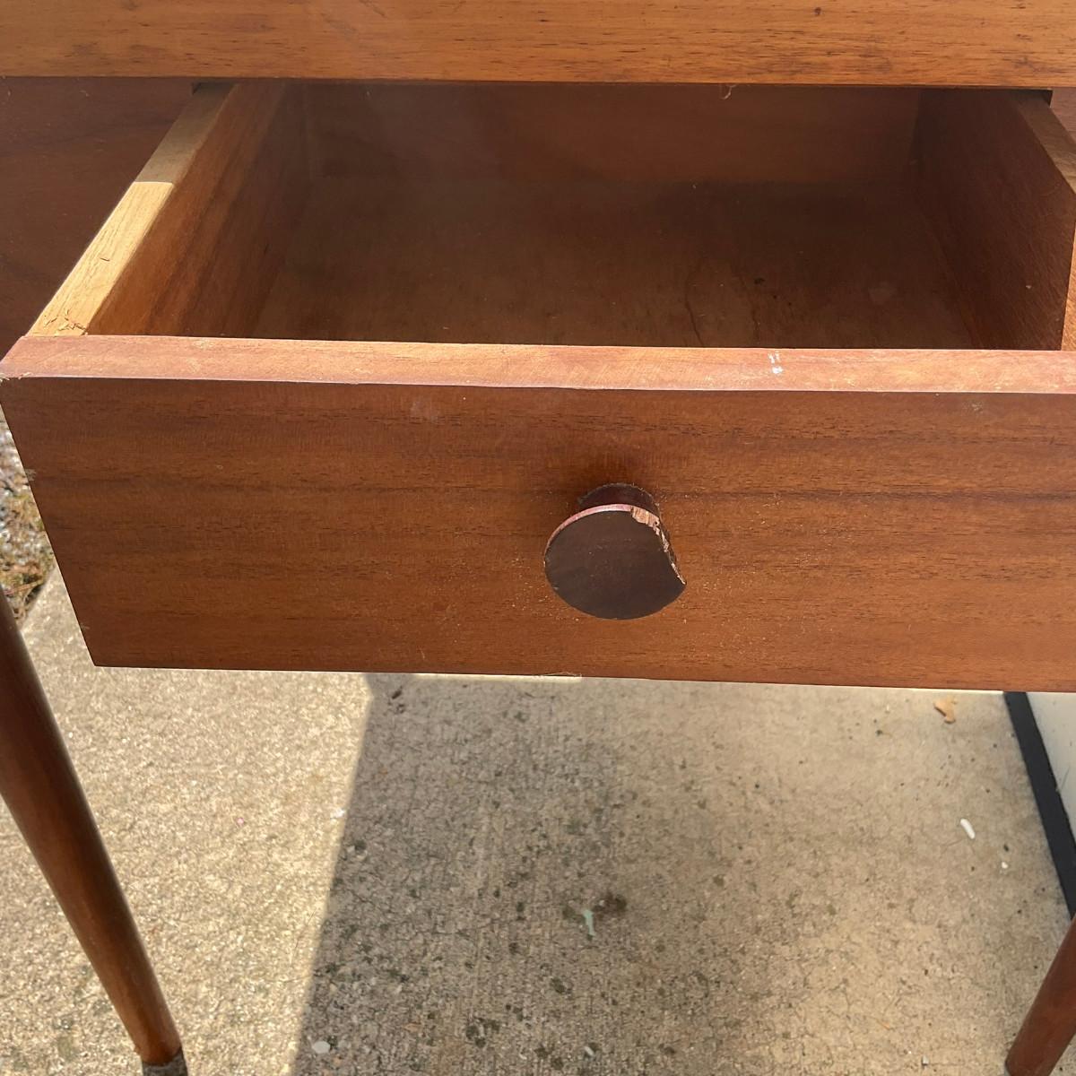 Tapered legs, two drawers, top not fully screwed in, double sided top, stained top