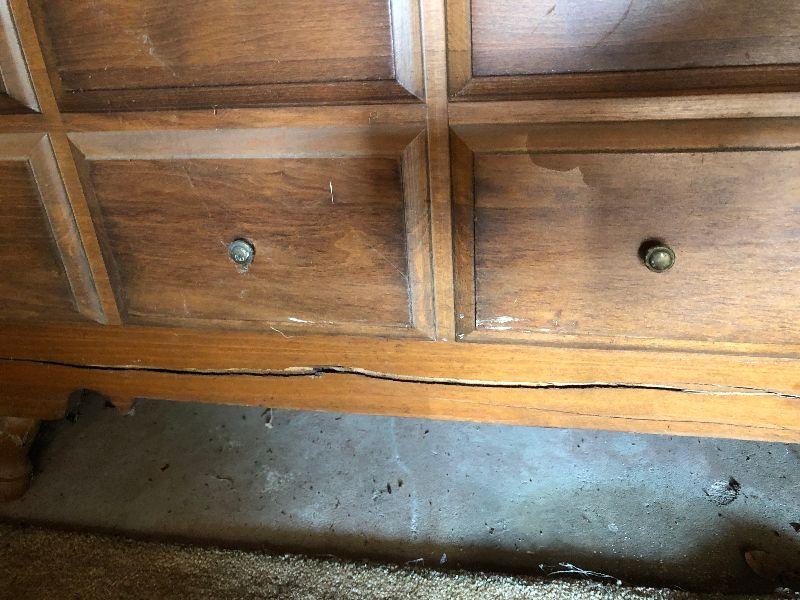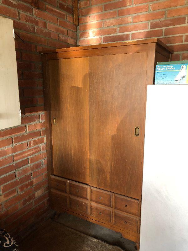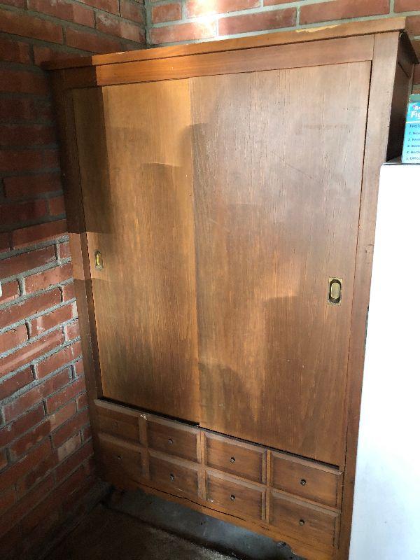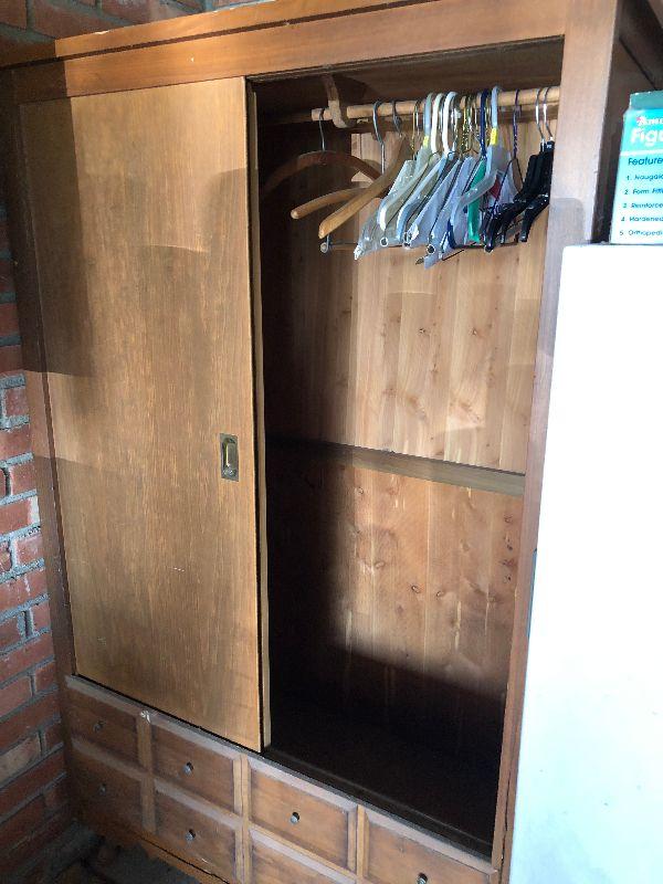 This cedar-lined wardrobe is from the 1960's. There is some damage at the bottom and some veneer damage. This would make a great project piece!