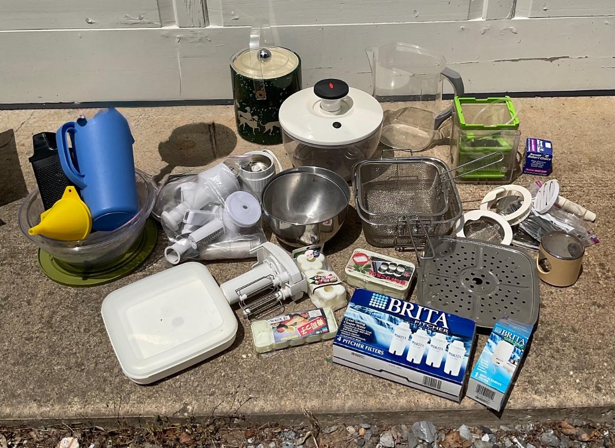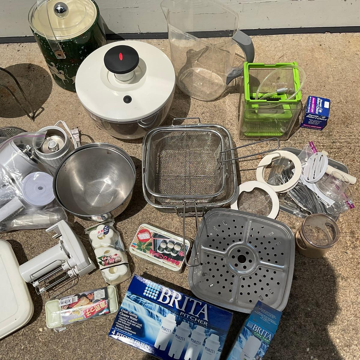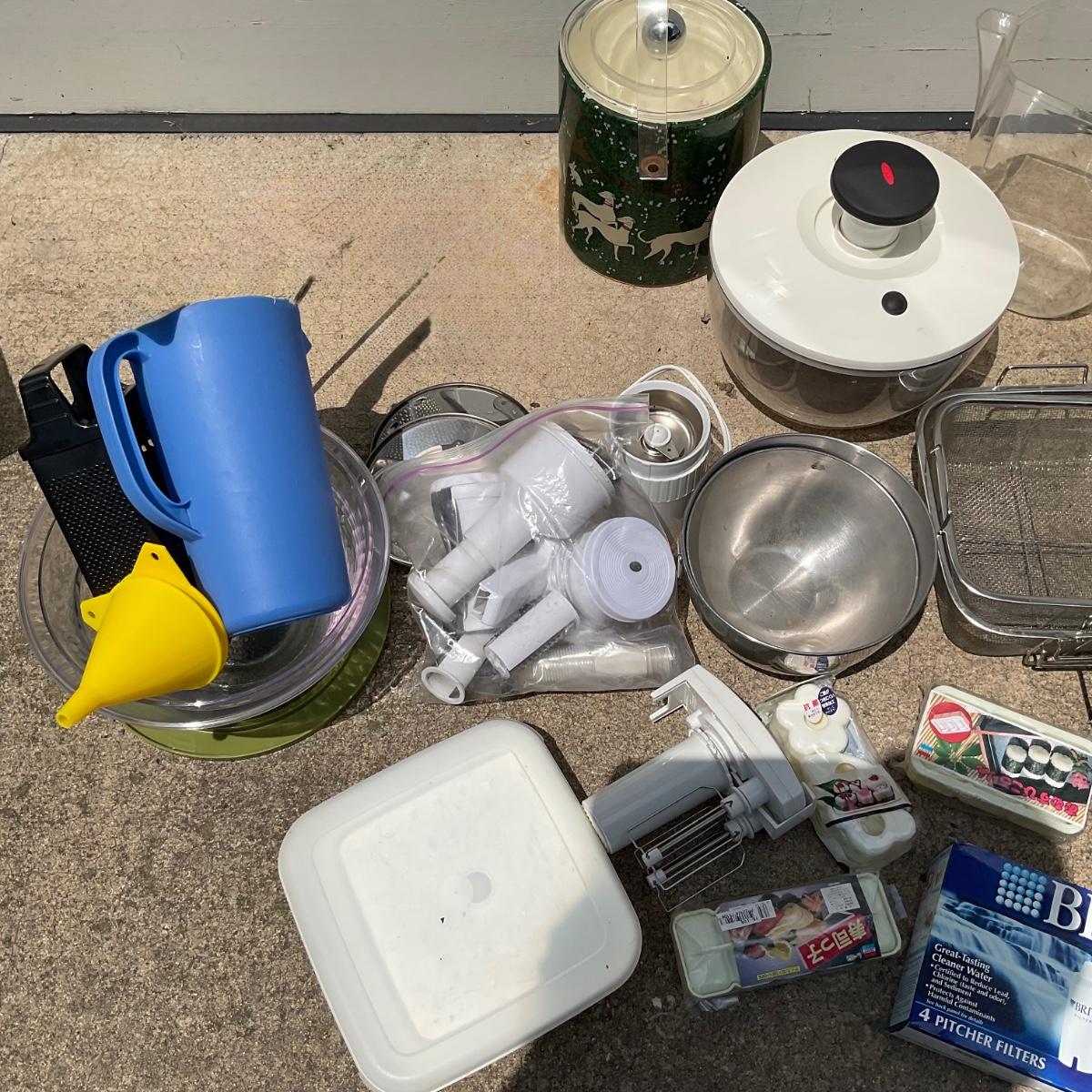 Britta With Filters but no lid, bowls, salad mixer bowl, ice bucket, chopping tools, frying tools, utensils