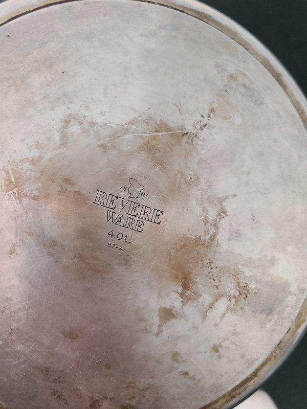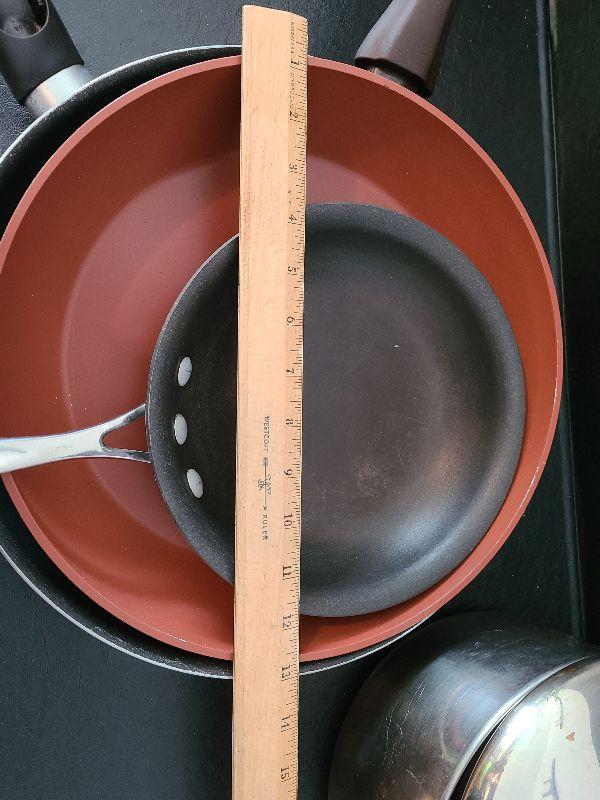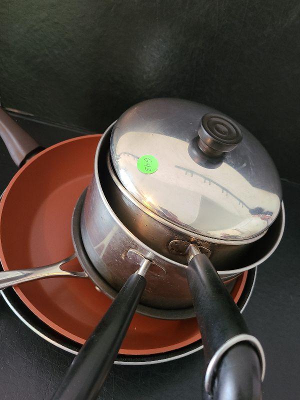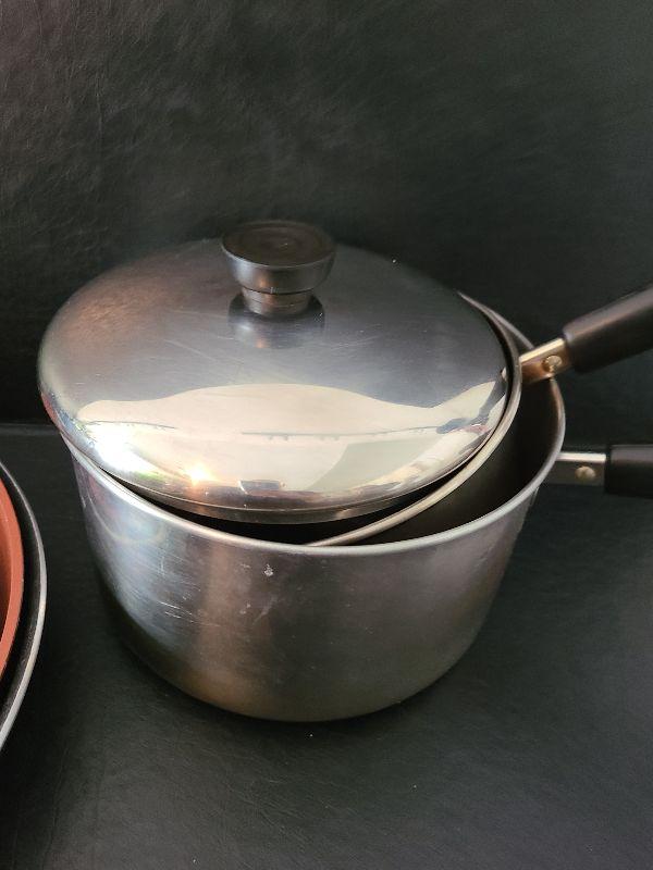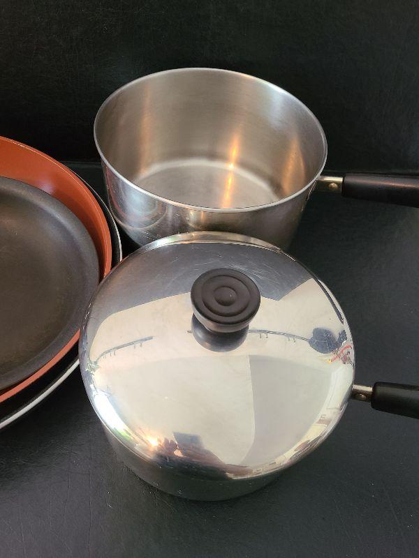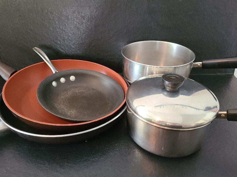 Revere and Biialltti sauce pans and frying pans.