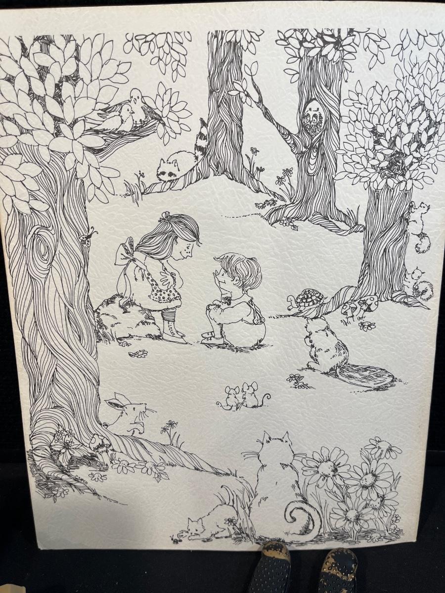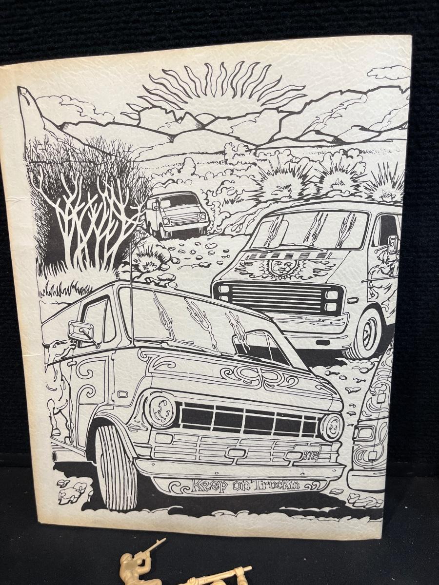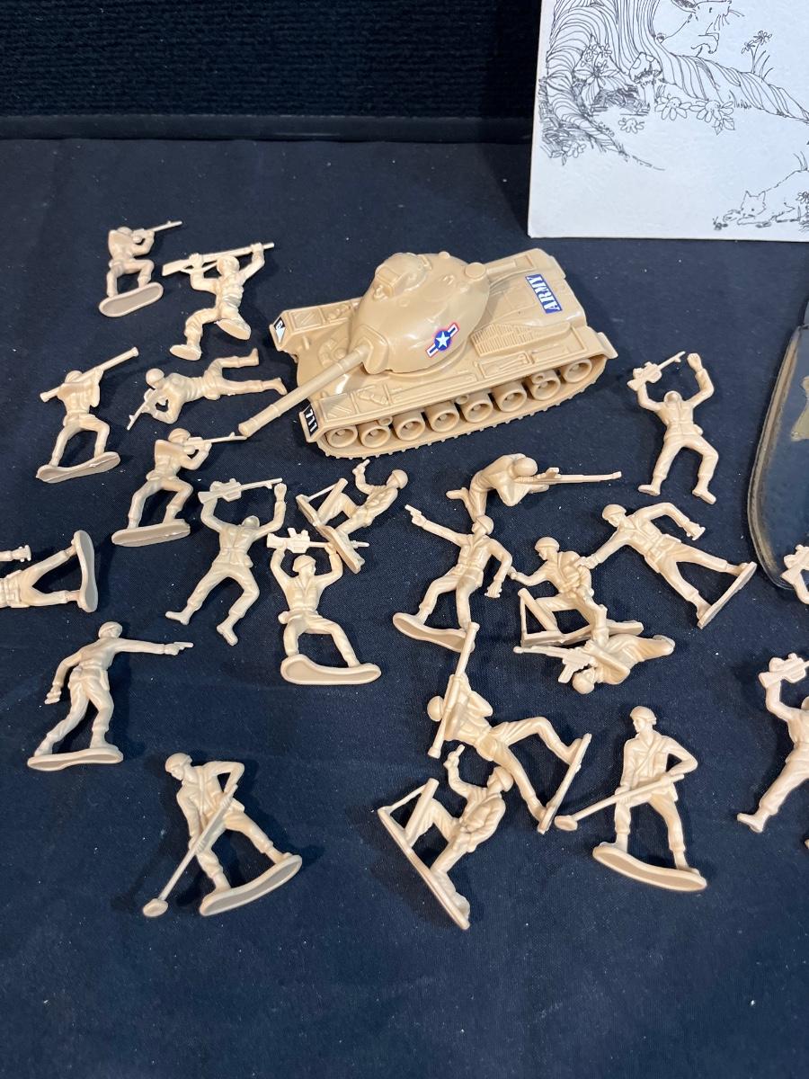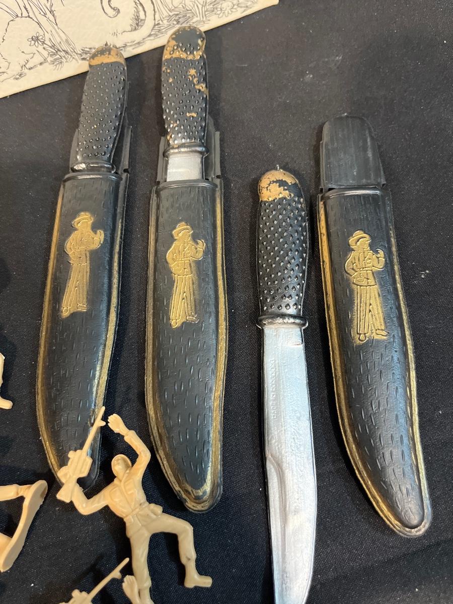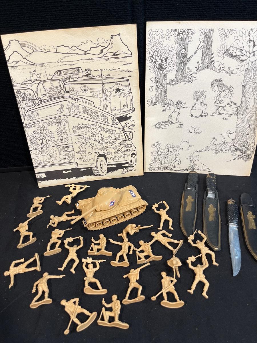 See pics. Plastic knives w/sheaths, army figures & tank. Scribbler folders (some discoloration on edge)