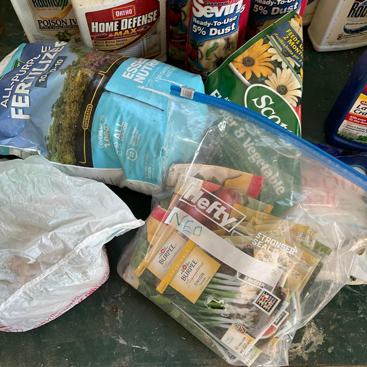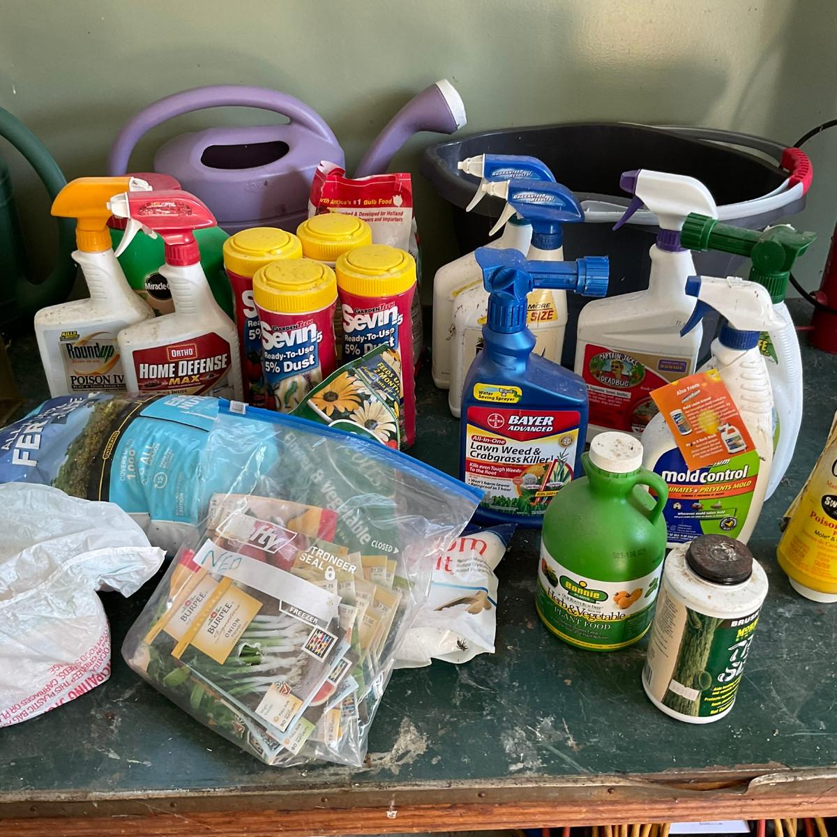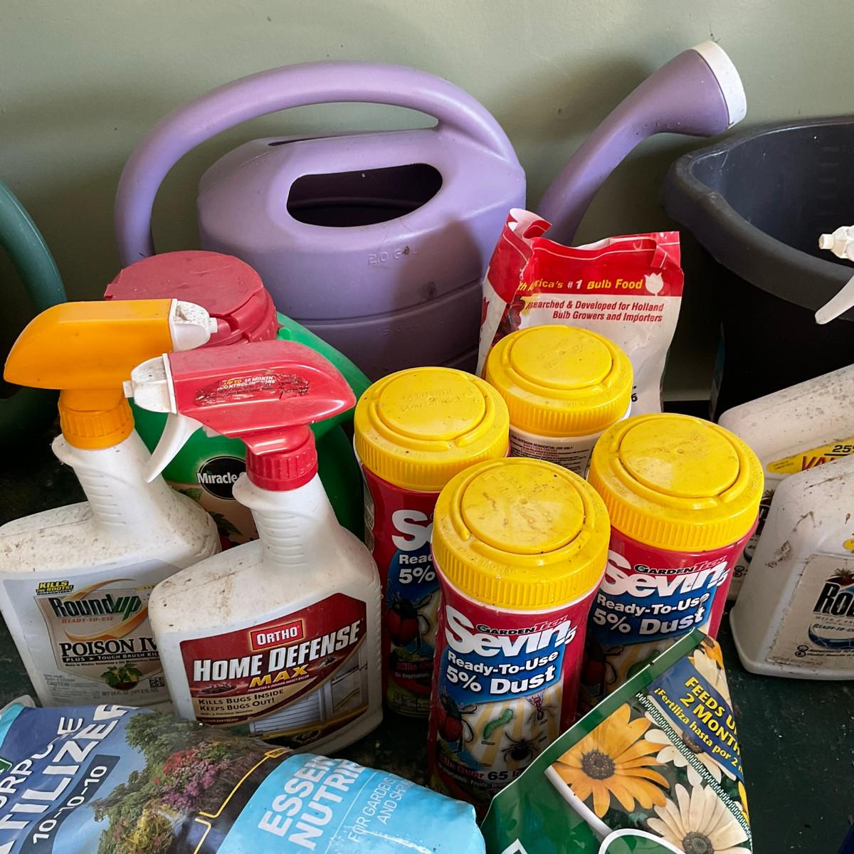 Round up, sevin, seeds, miracle-gro, bucket, plastic watering can