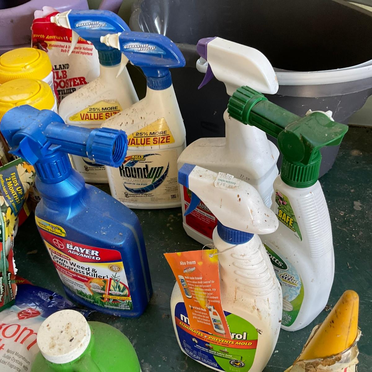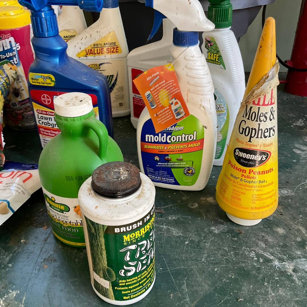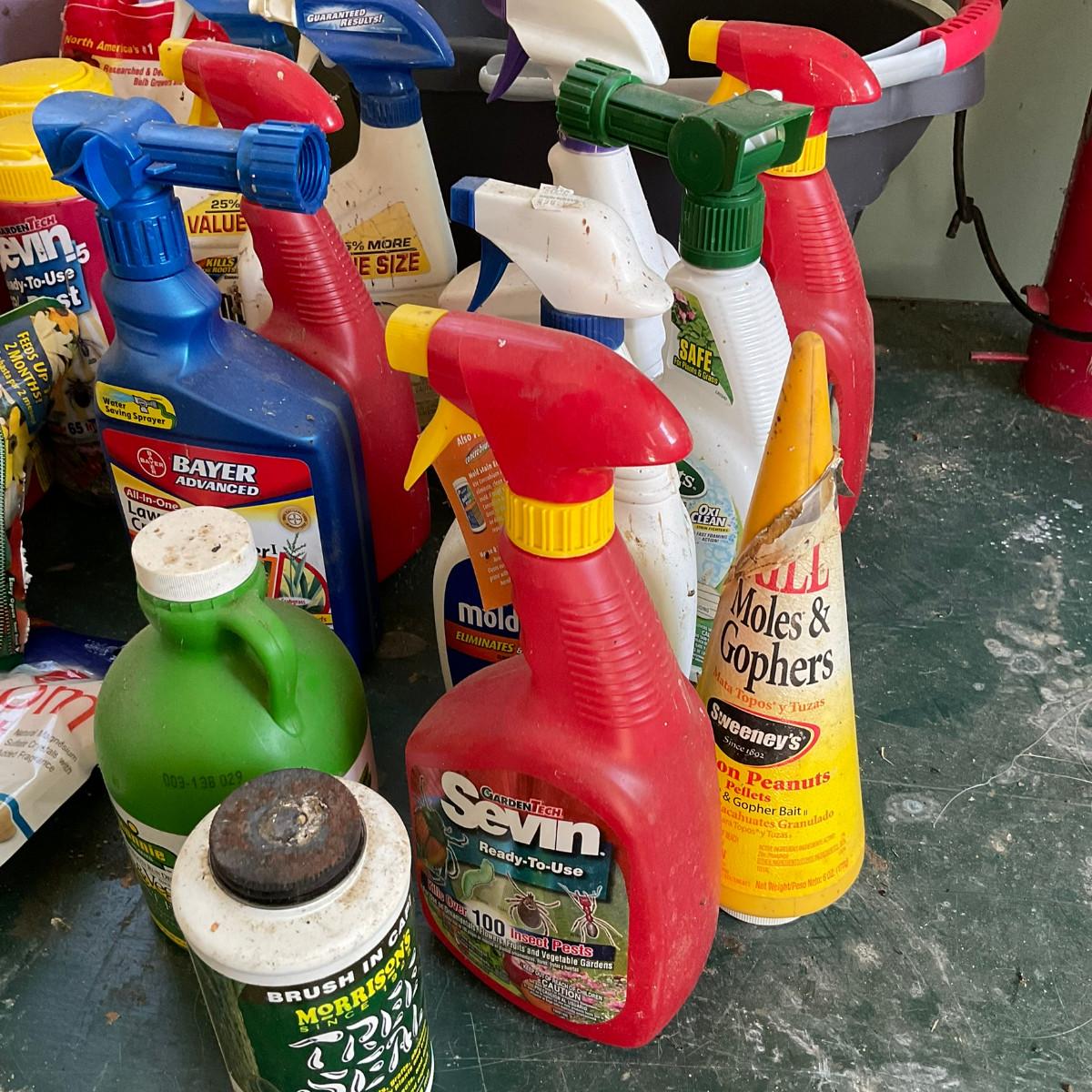 Round up, sevin, seeds, miracle-gro, bucket, plastic watering can