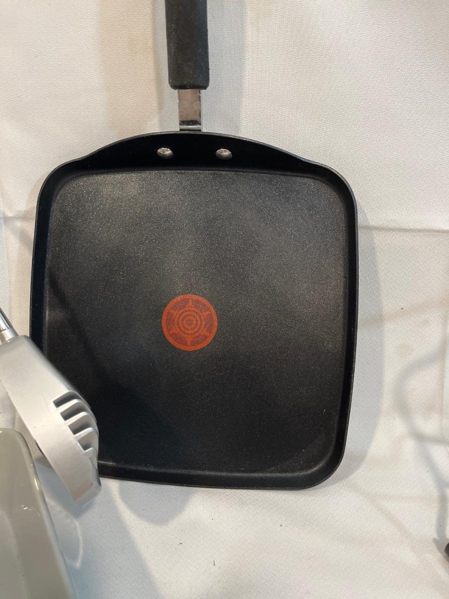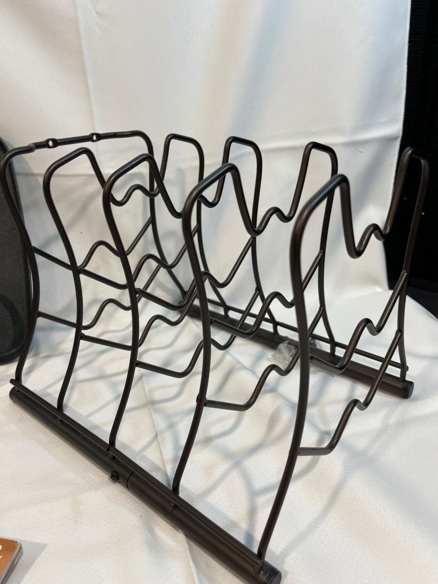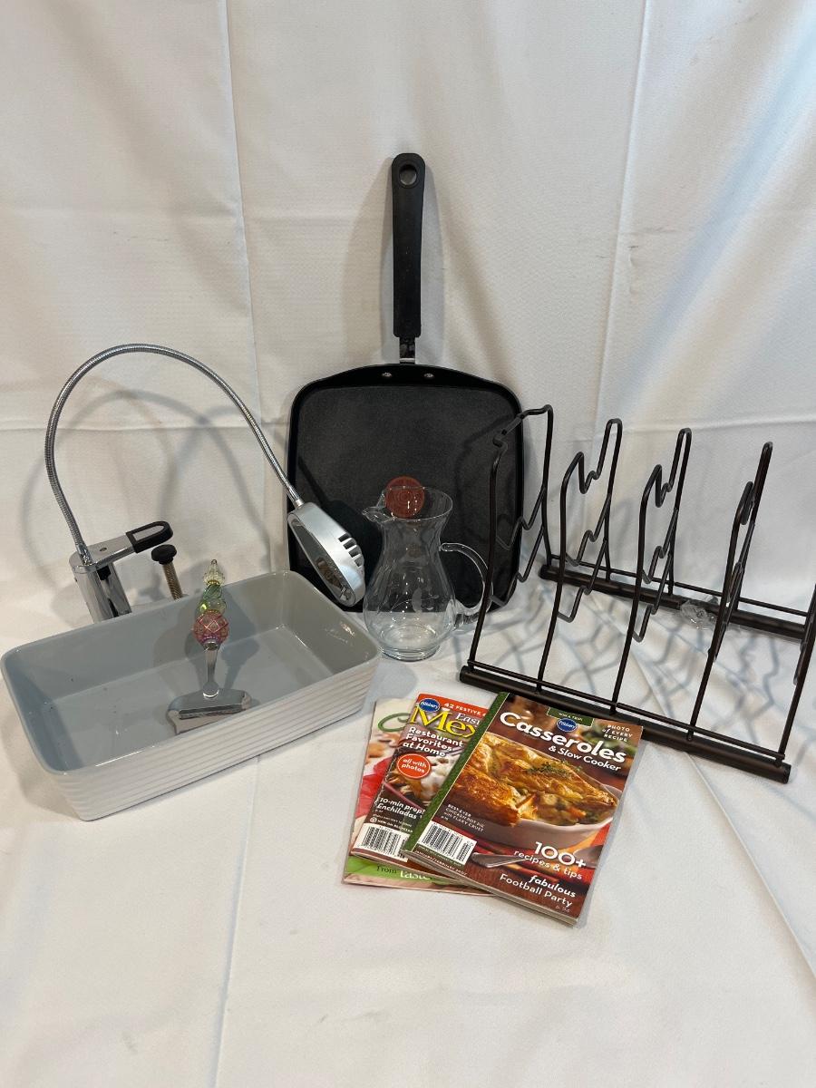 G52- Pan organizer, T-Fal pan, Princess House pitcher, casserole, Grillet
