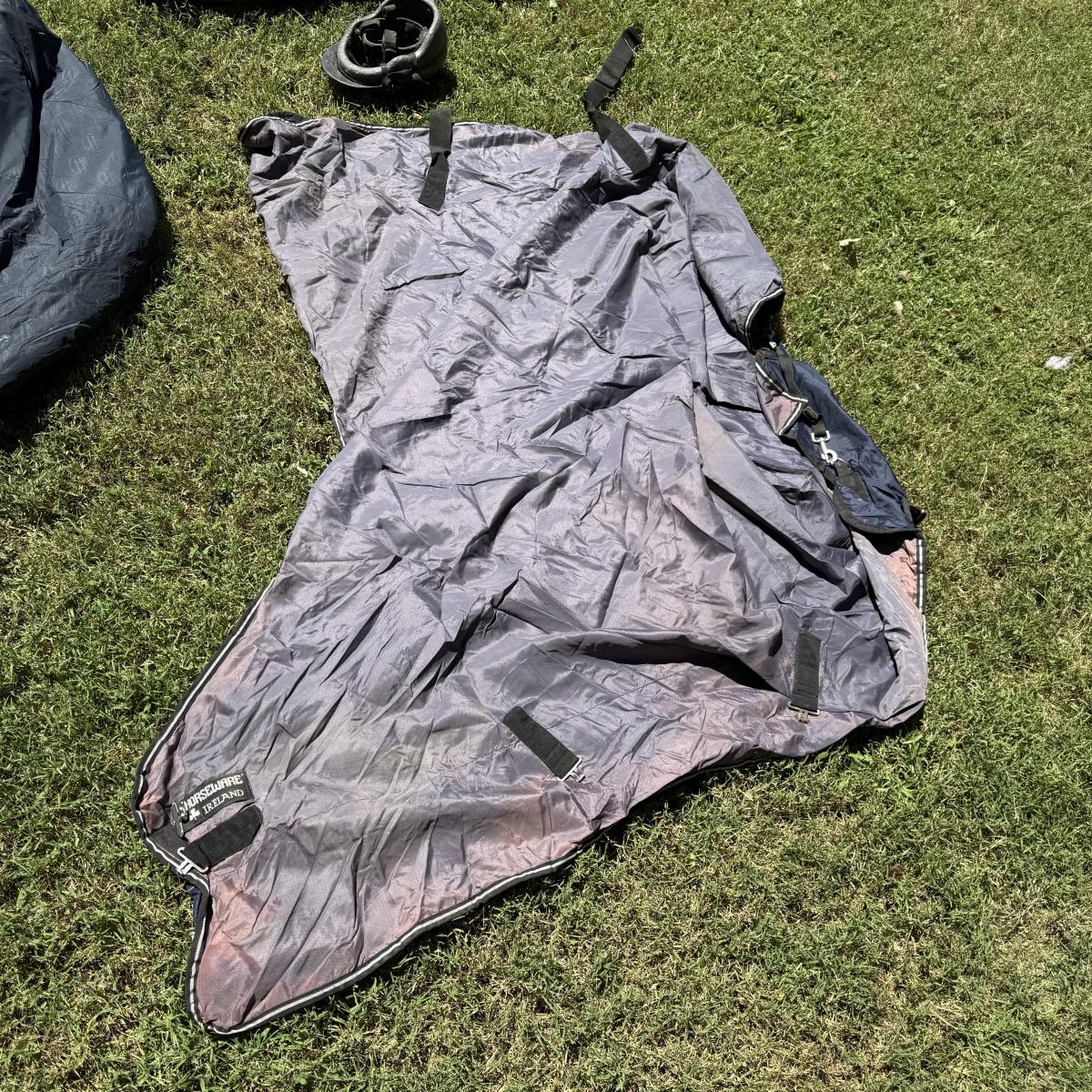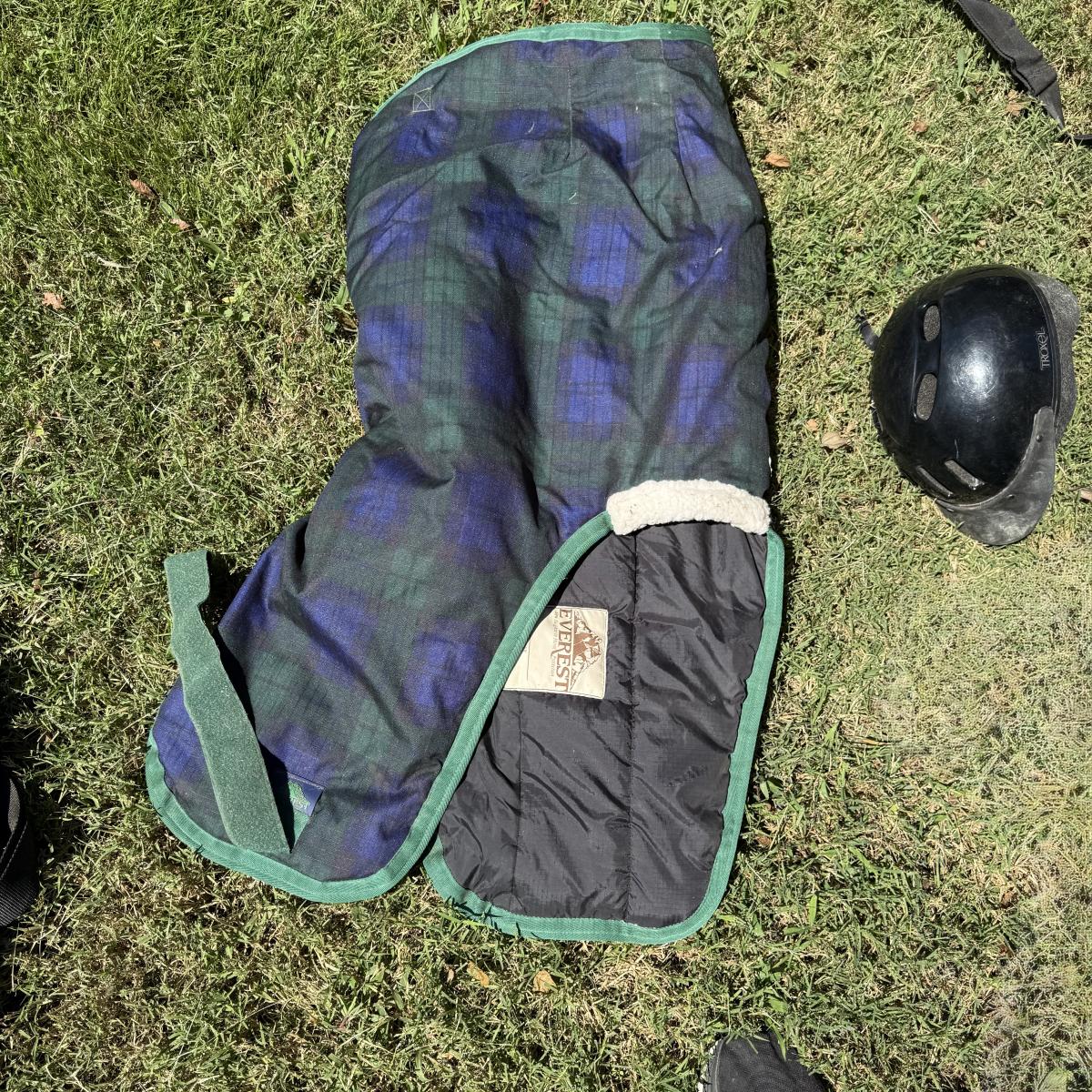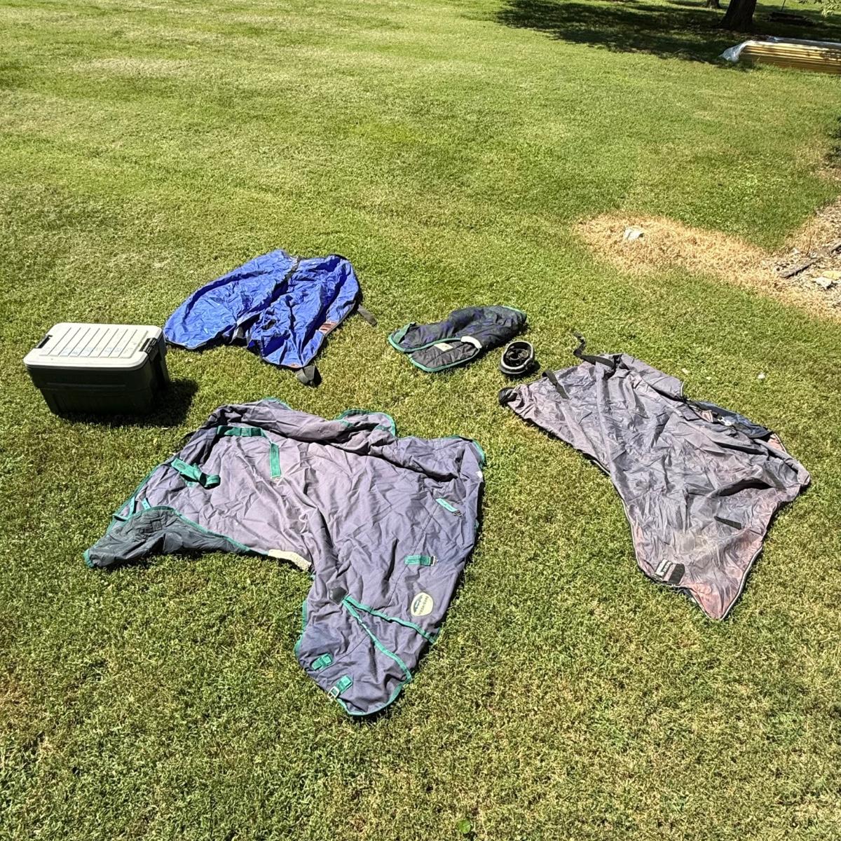 Comes with Weather beeta blankets and other various horse blankets. Comes with one horse rider helmet also comes with action packer Rubbermaid container.