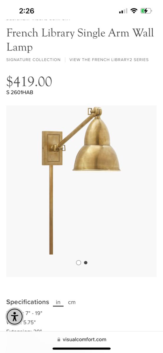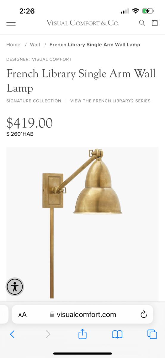 G53- French Library Wall Arm Lamp by Visual Comfort NEW!