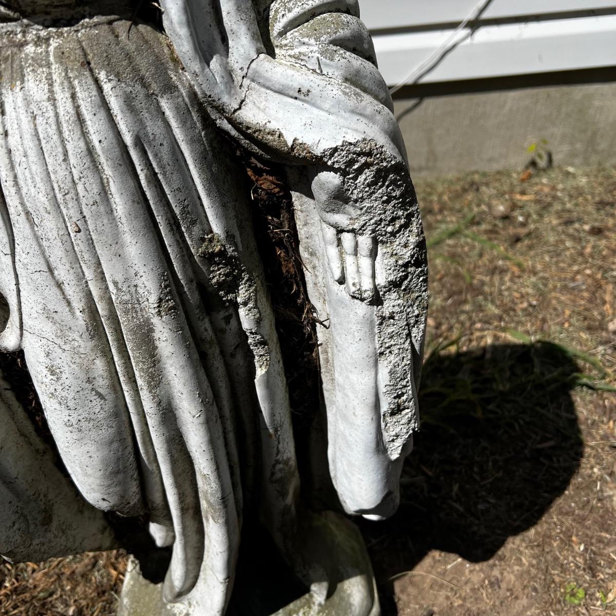 Has some breaks on the front to both hands, heavy statue stands 35”H.