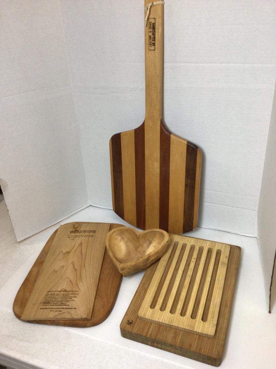 Lot includes, Hand Made Peel by David R. Wolfert, Hand Carved Heart Shaped Bowl, Whole Foods Market Grilling Plank and more