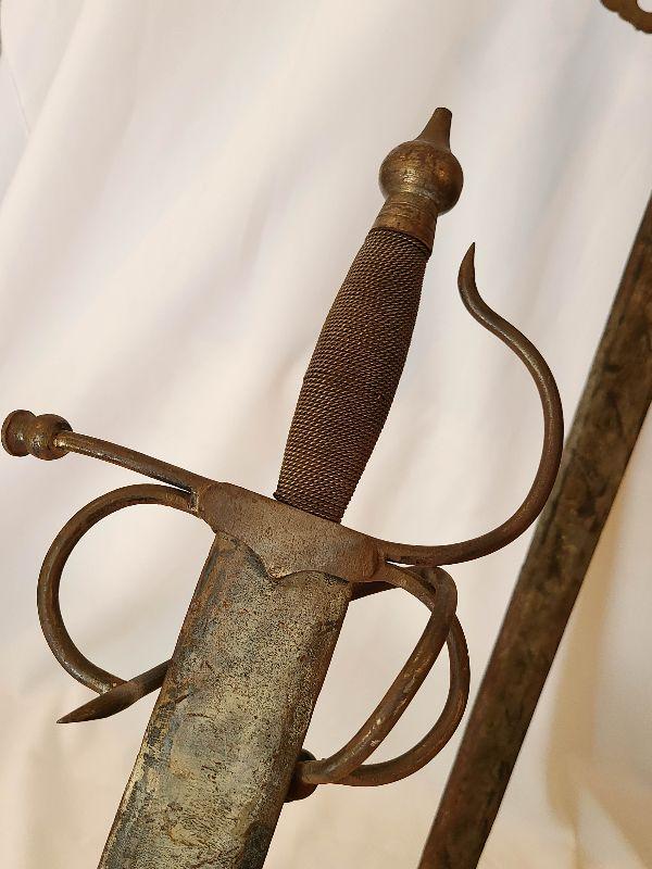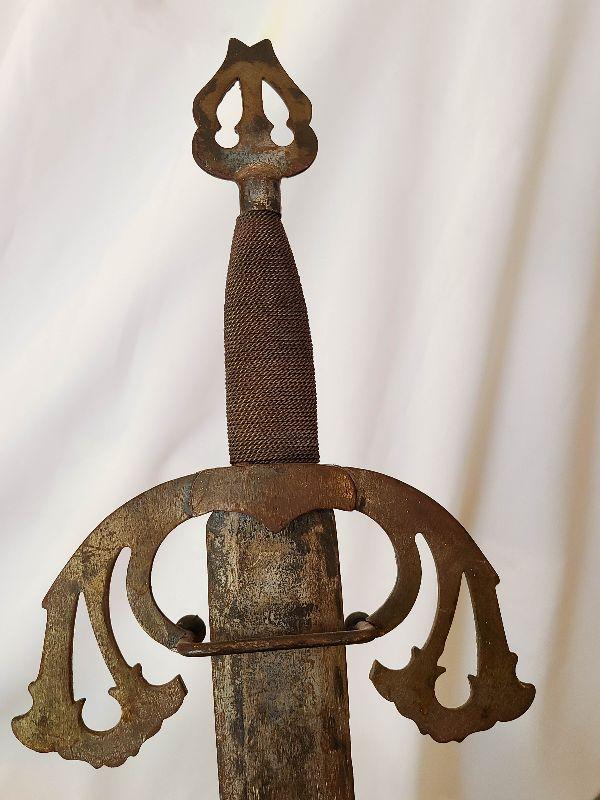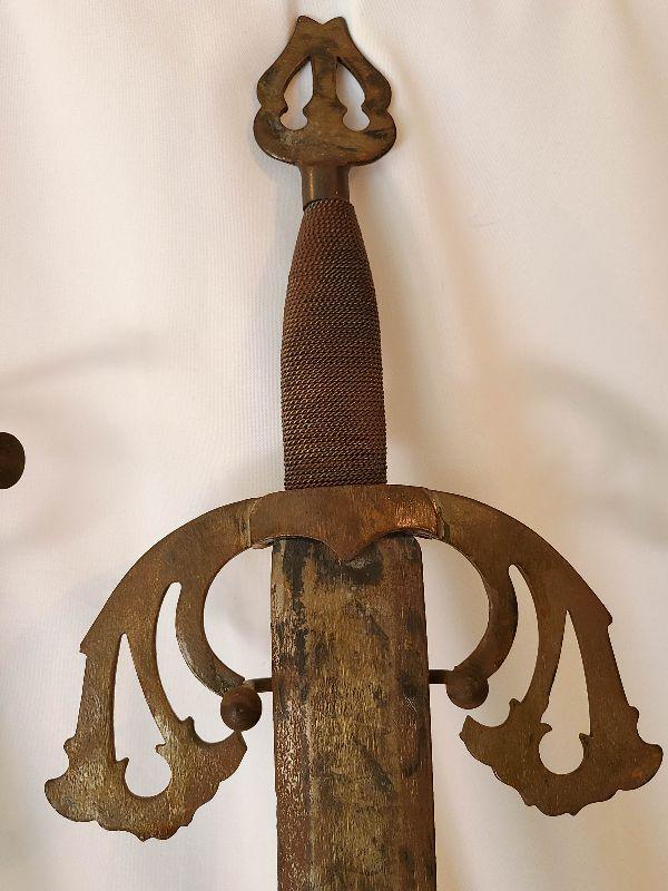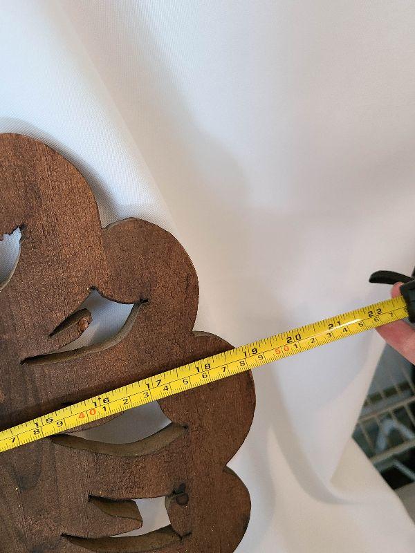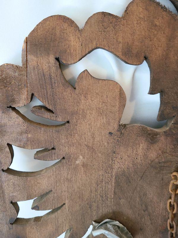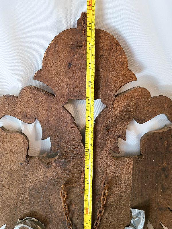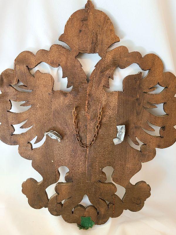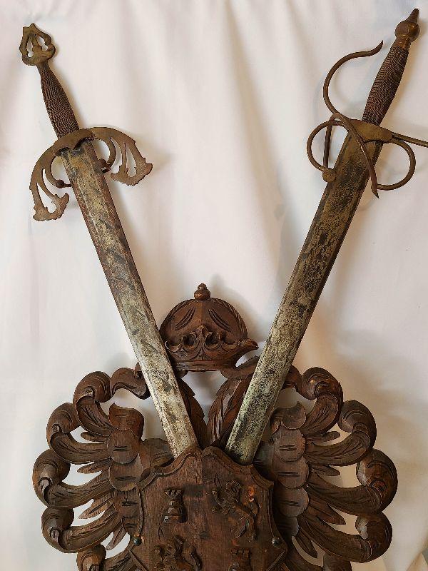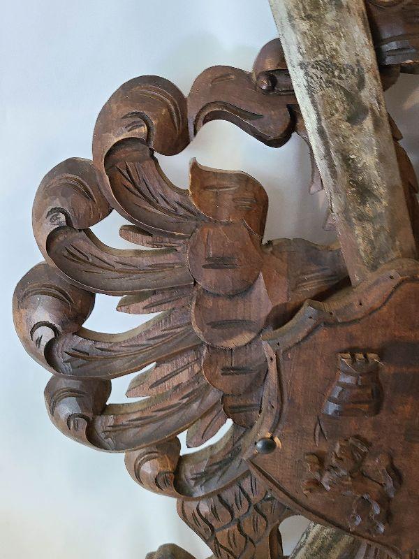 This hung over the clients mantle and pictures do not do it justice! This piece is gorgeous and the swords are heavy and solid. This is a very large wall plaque, hand carved wood details! Please see pics for sizing and condition!