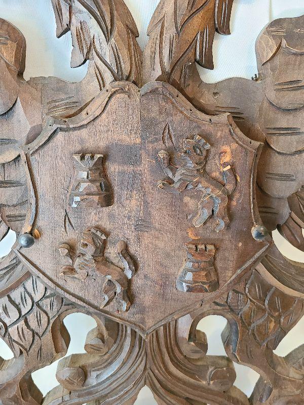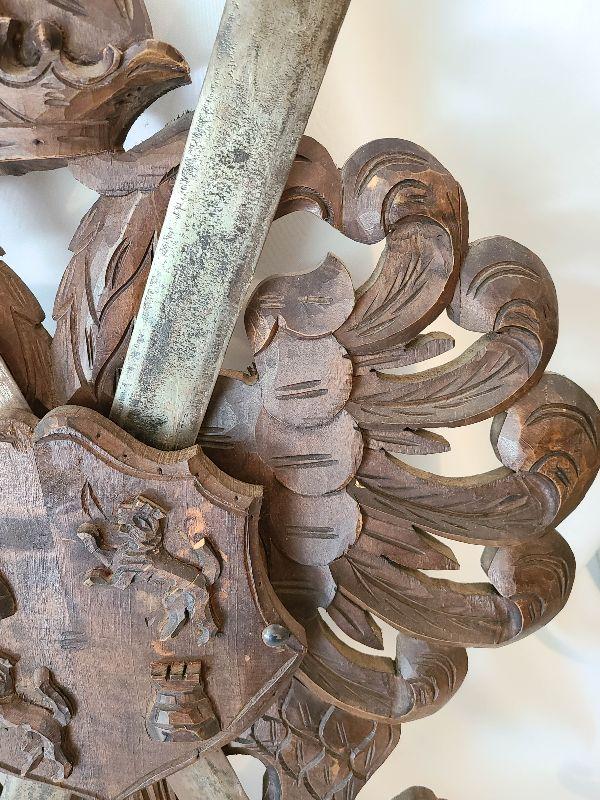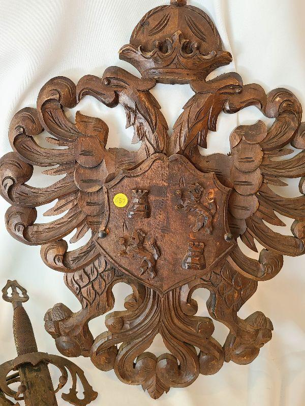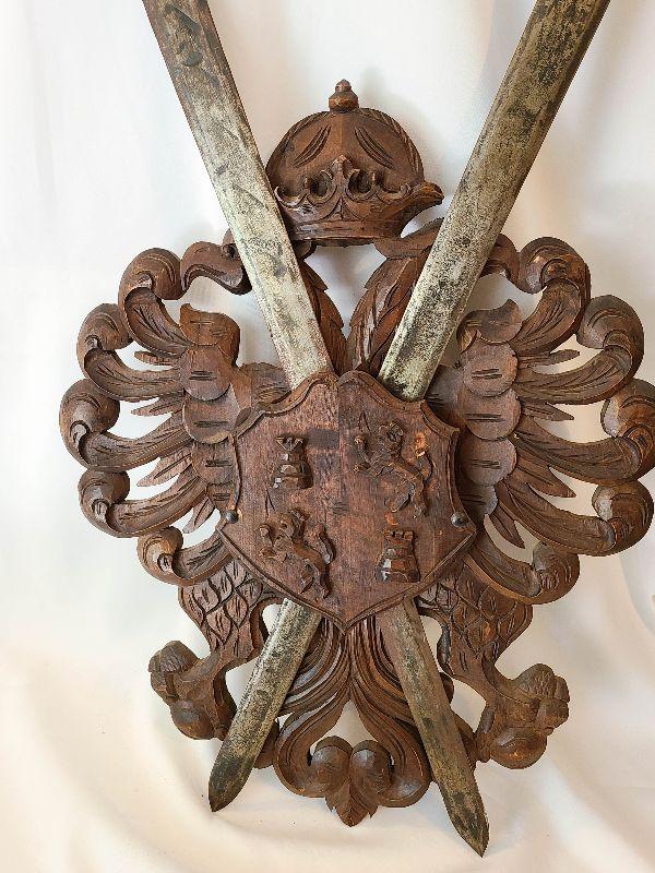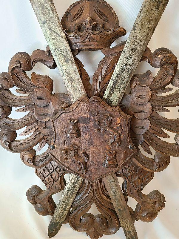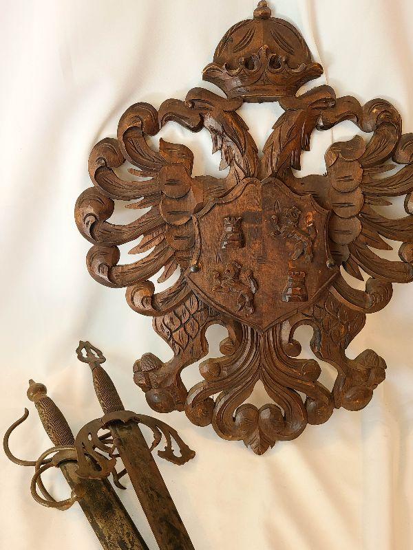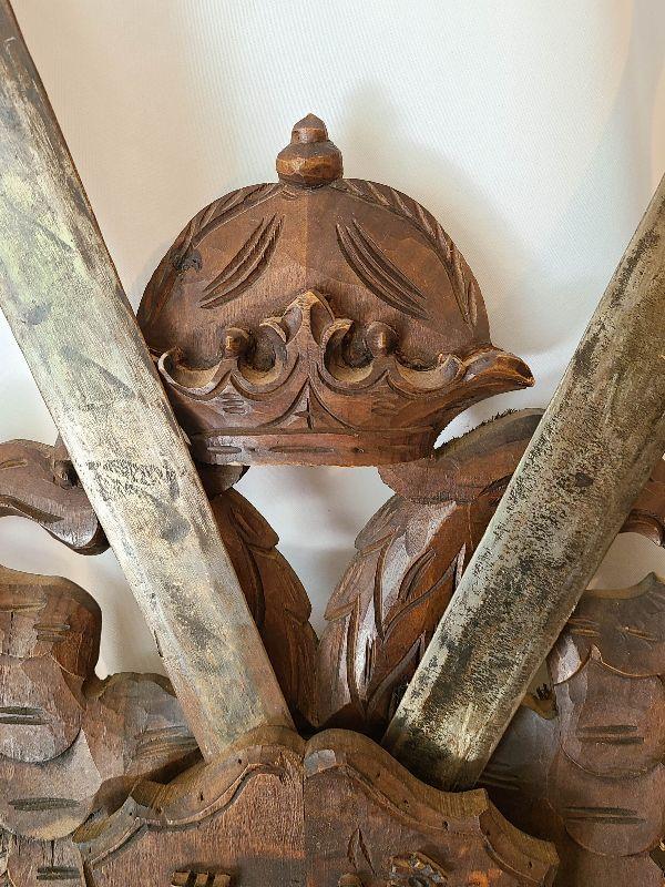 G57: Large Wood Carved Coat of Arms and Swords