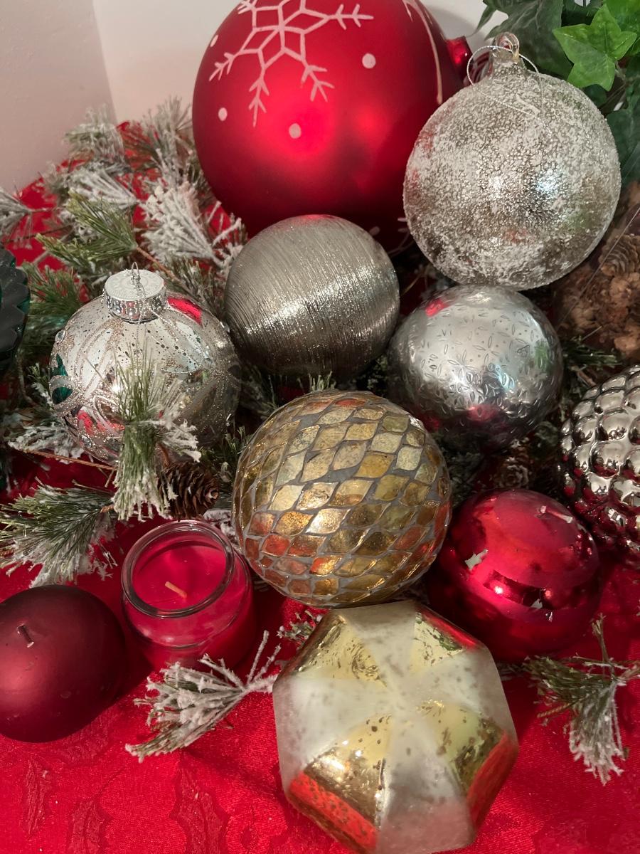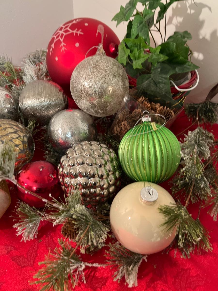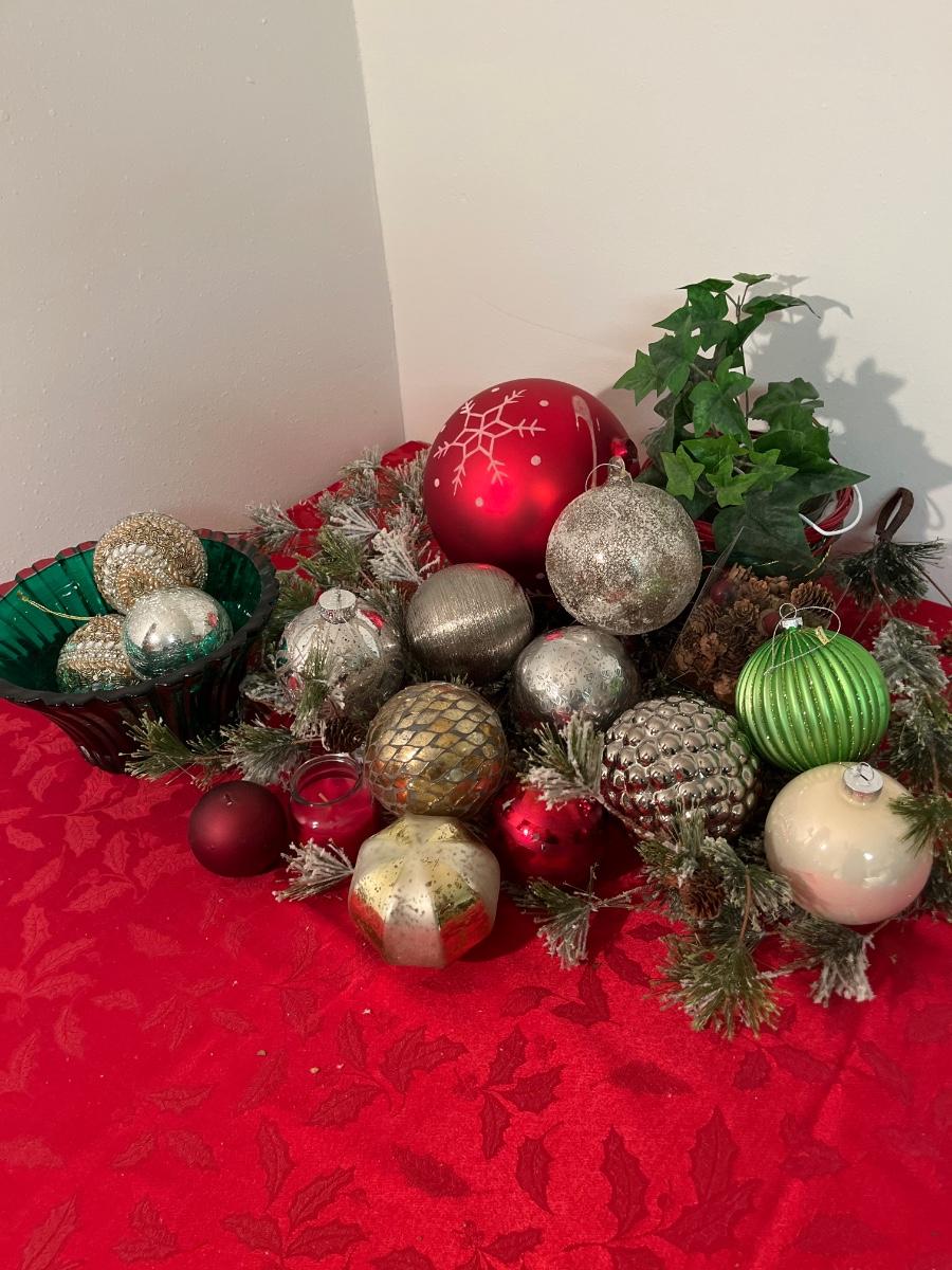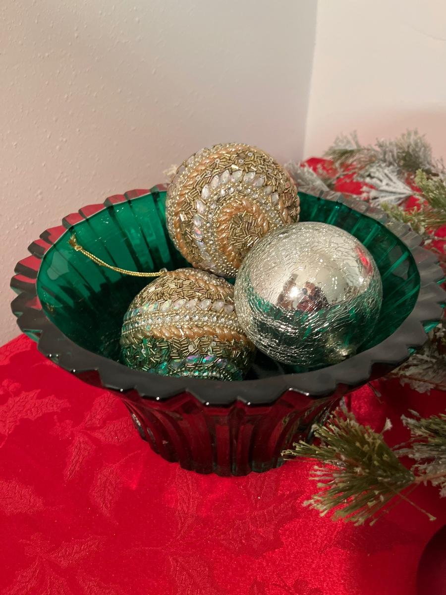 G57-  Large balls, ornaments, green glass bowl & greenery