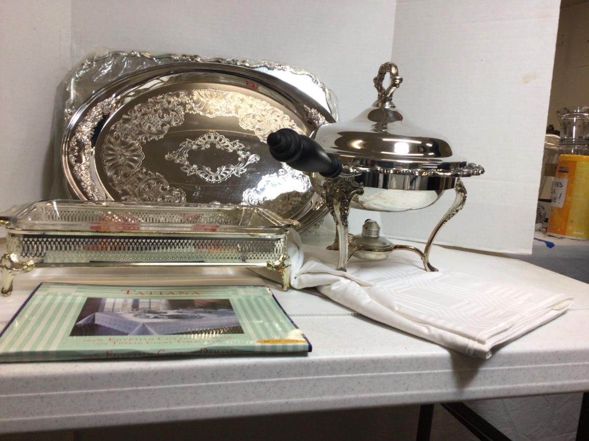 Silver Plate Chafing Dish, Egyptian Cotton Damask Tablecloth & Misc