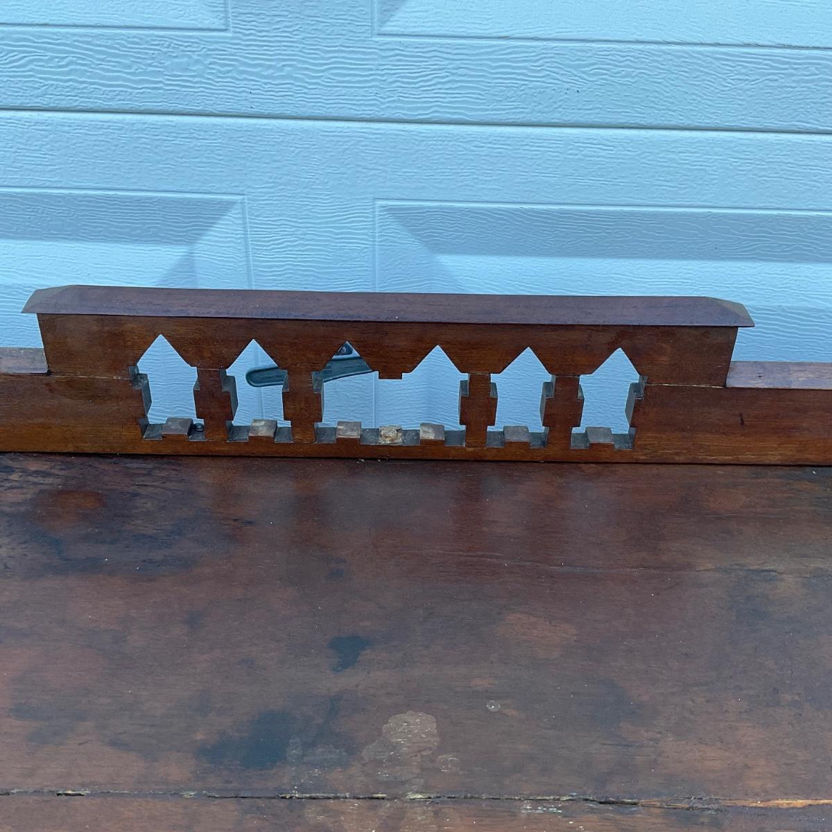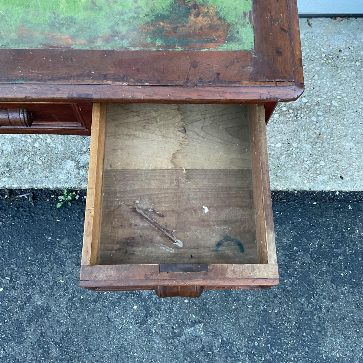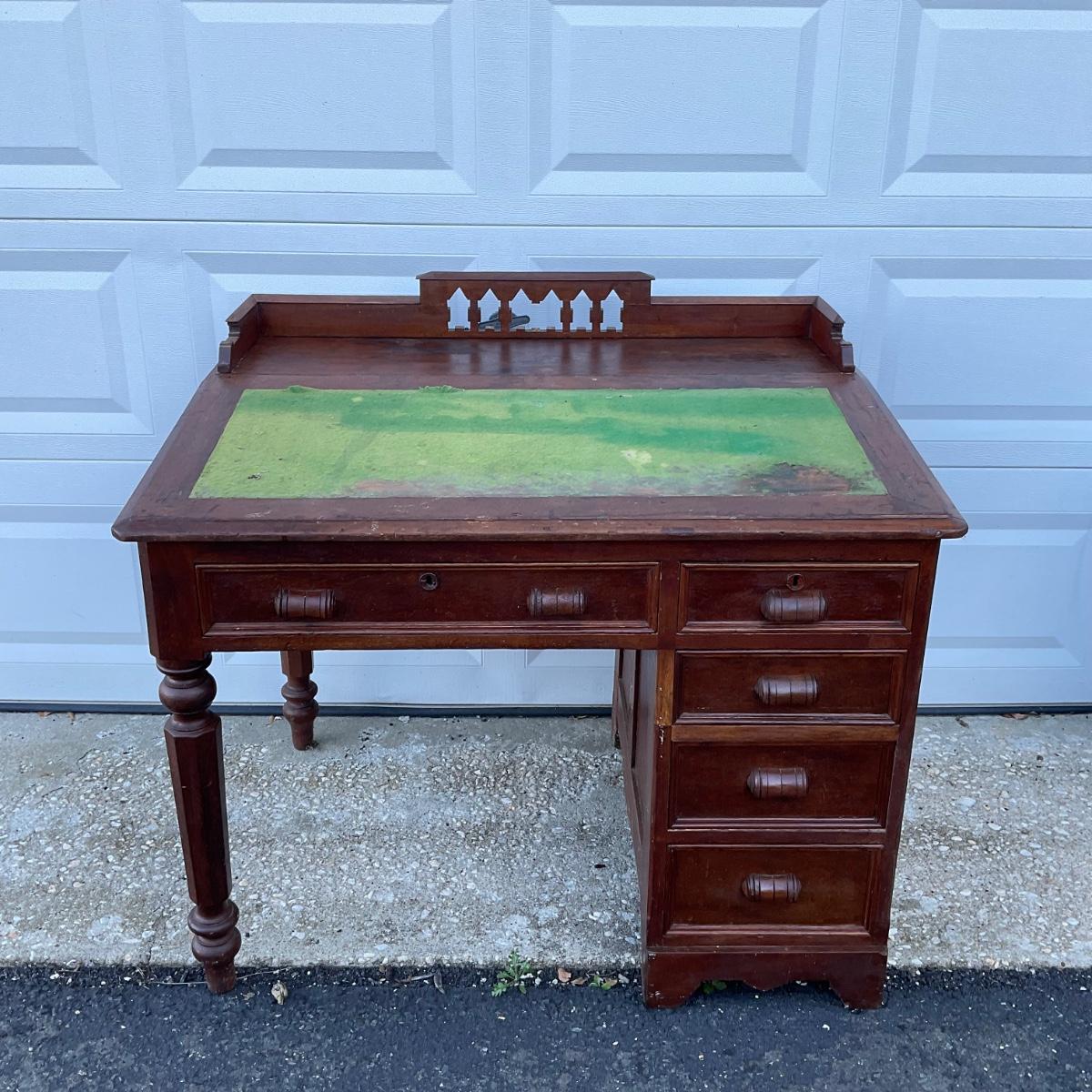 slant top has been screwed shut , green felt is worn , has been repaired on fretwork on top back