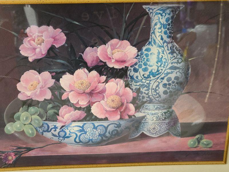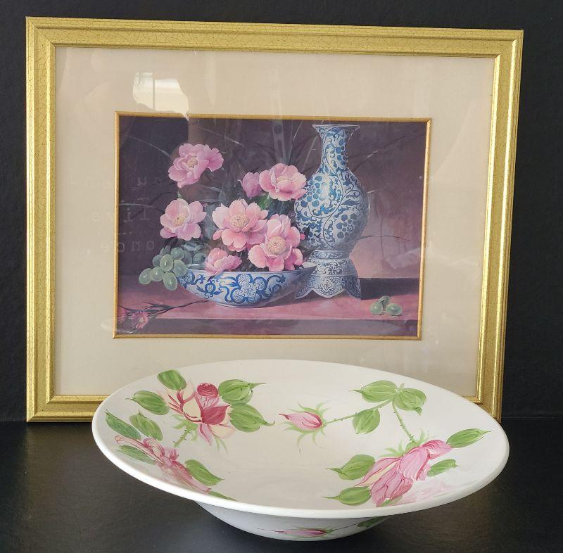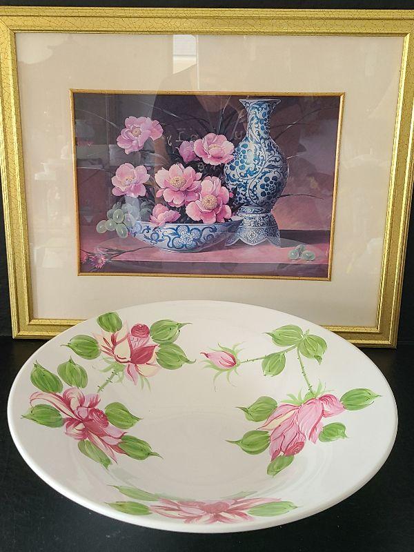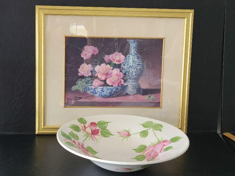Bowl has beautiful floral design. Print has gold frame. 18x22. Please see all pictures for exact contents of the lot, condition of the items, and if measurements if taken. Thank you for looking and have fun bidding.