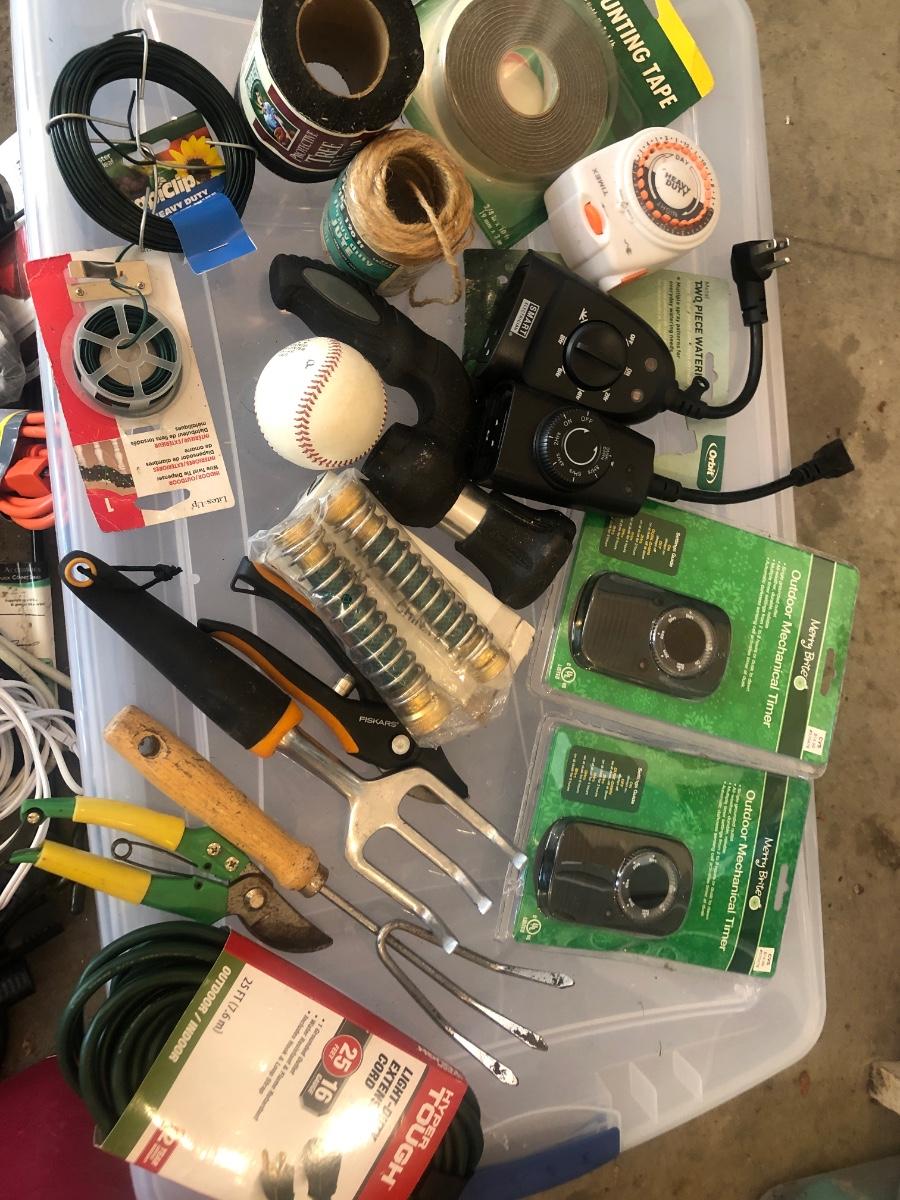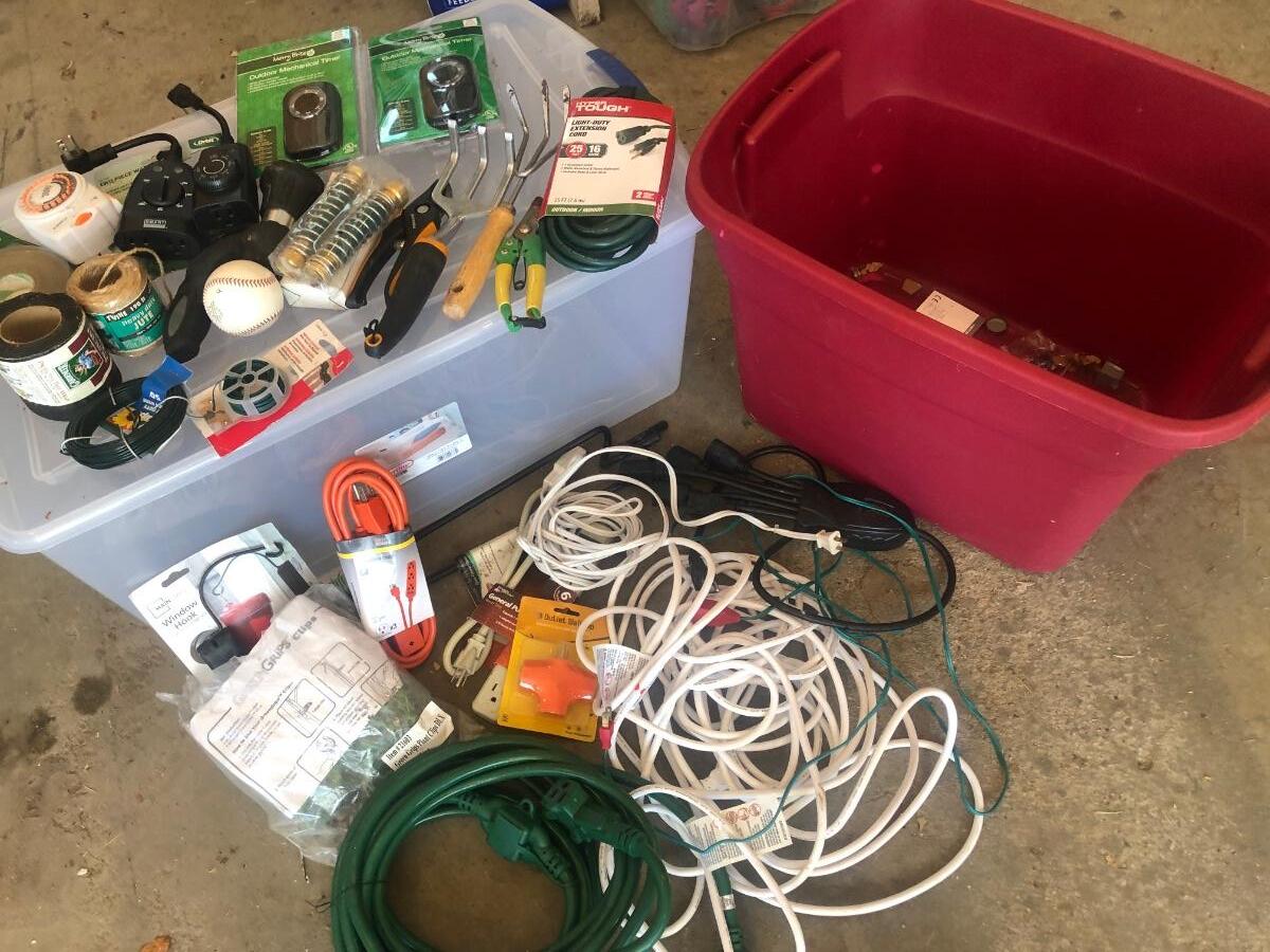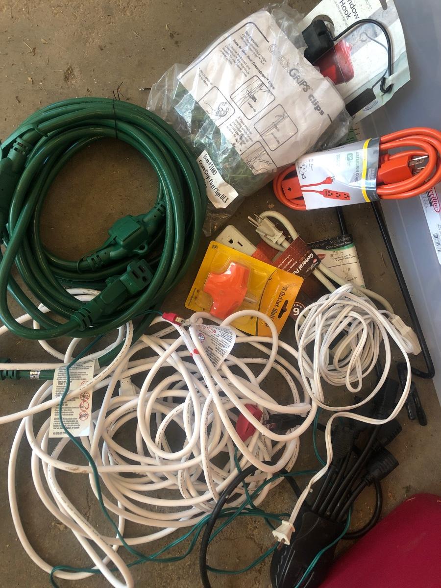 G65- Ext cords, timers, yard items w/tote