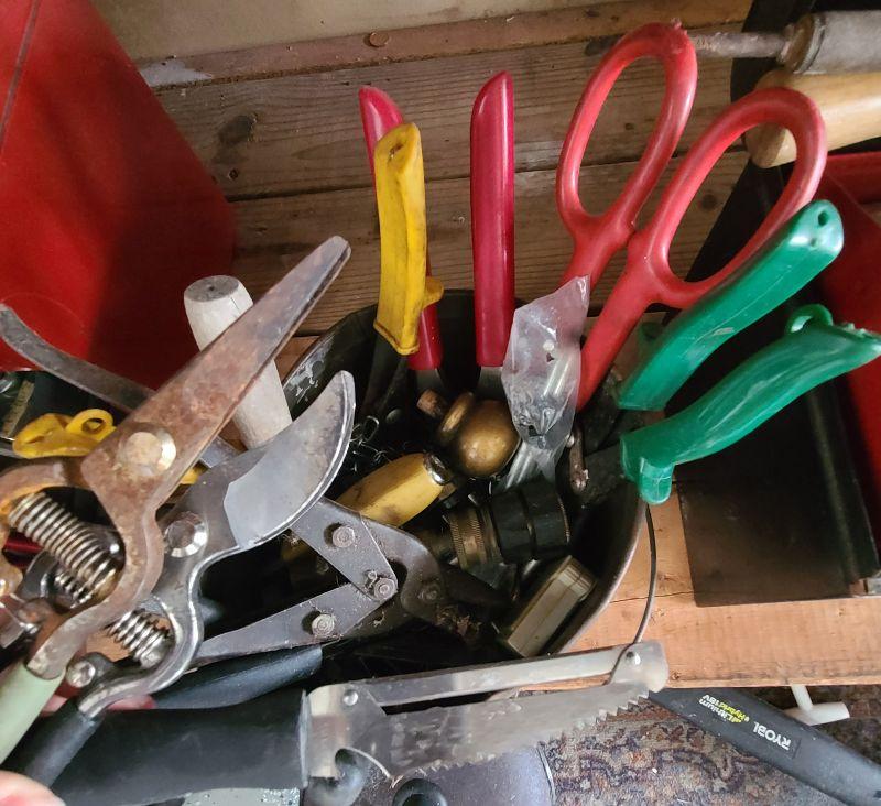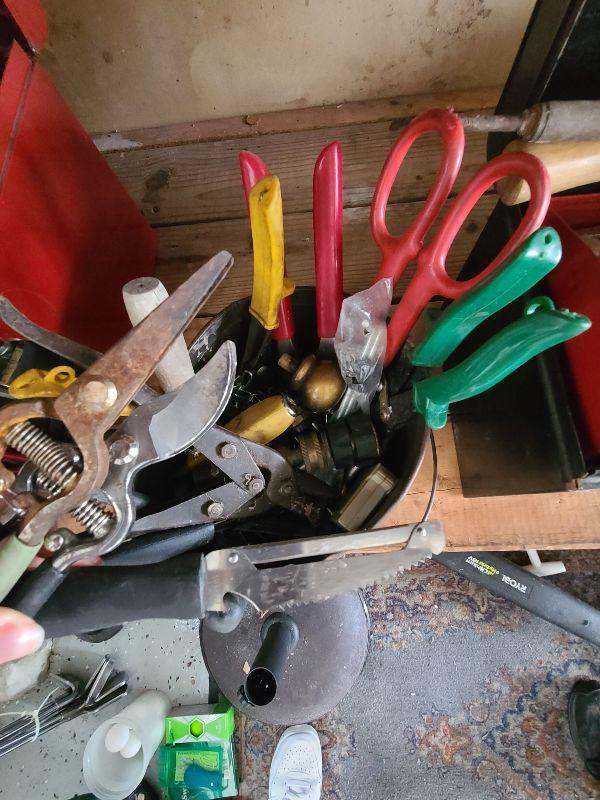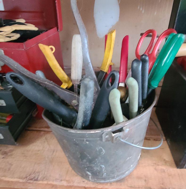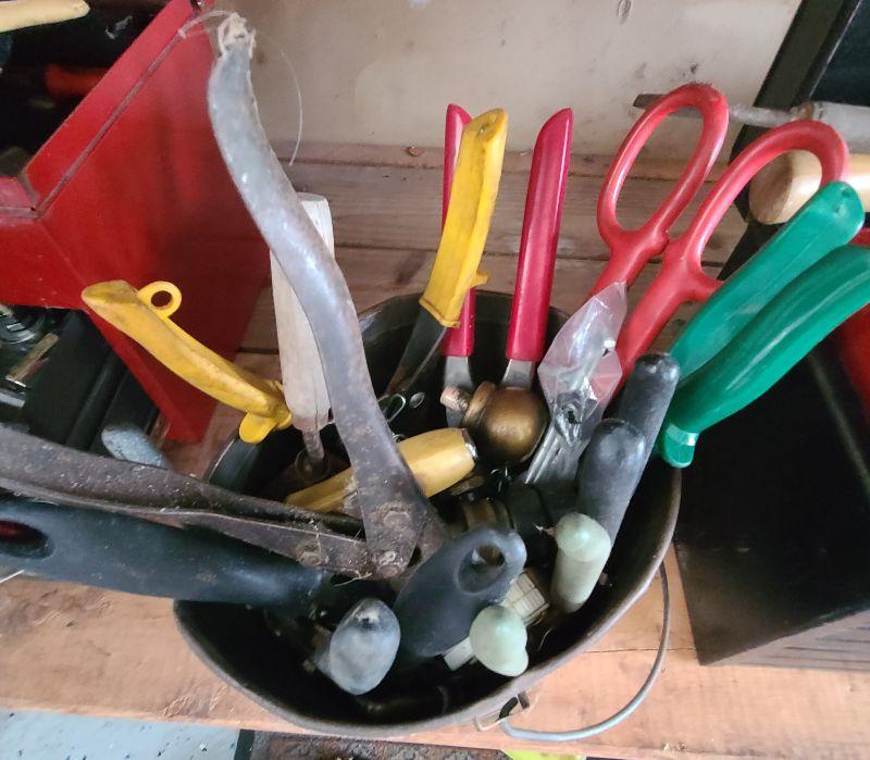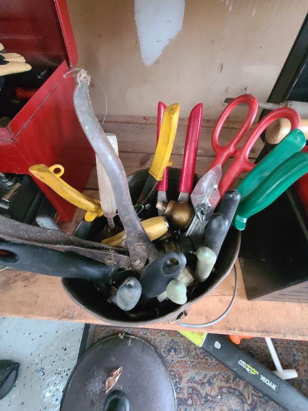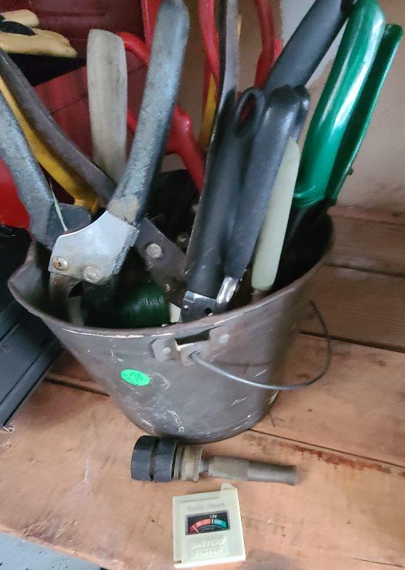 Tool lot, tin bucket, battery tester, pliers, and more miscellaneous tools. Please see all pics for condition of the lot, size of the lot, and measurements