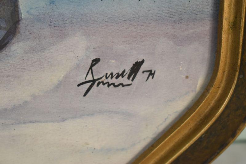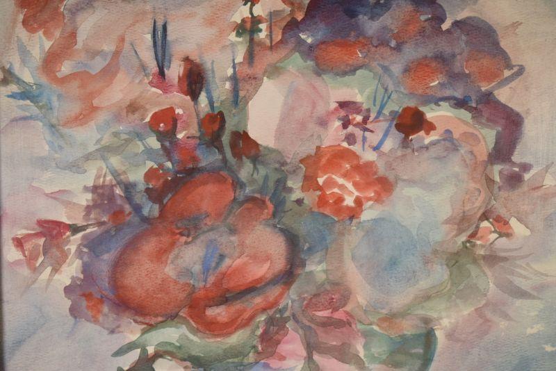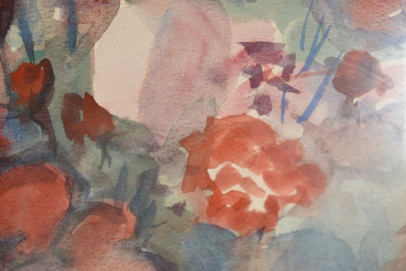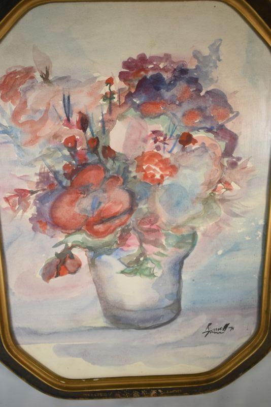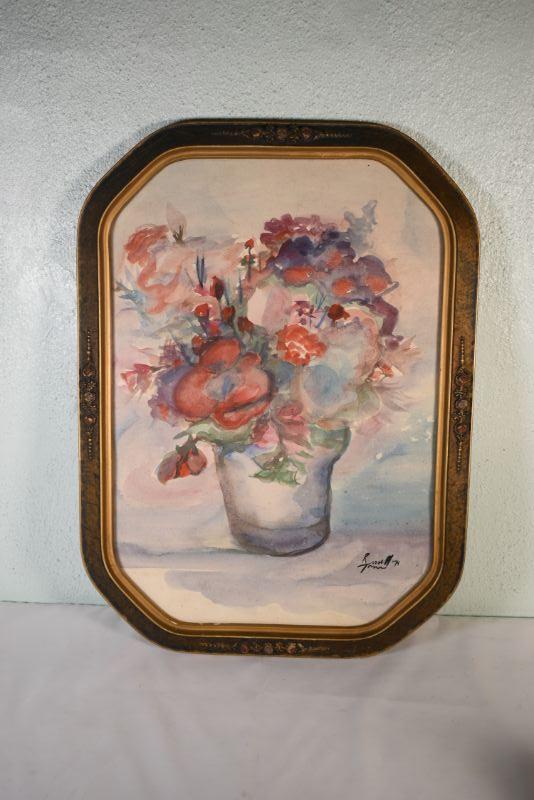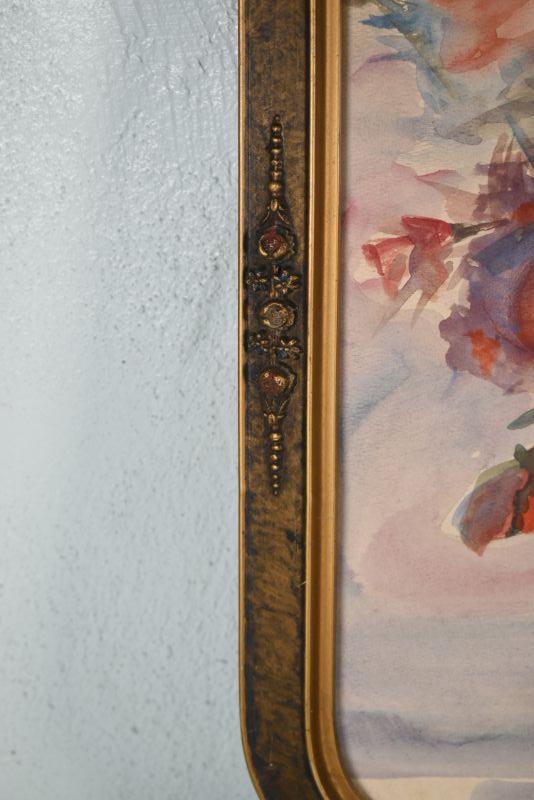 A signed watercolor of flowers in vase. Vintage frame with flower carvings, 23x16.