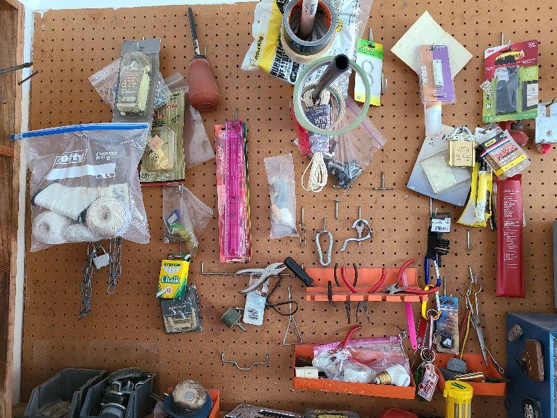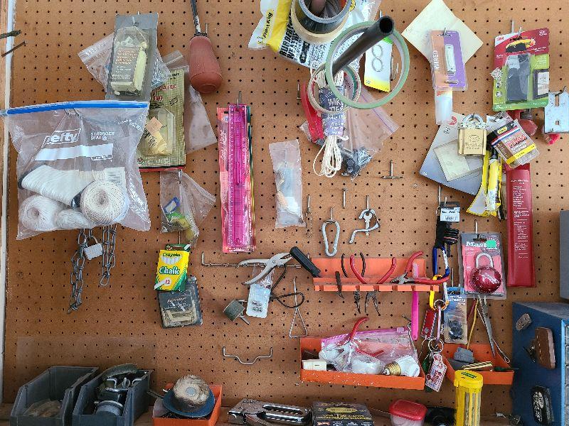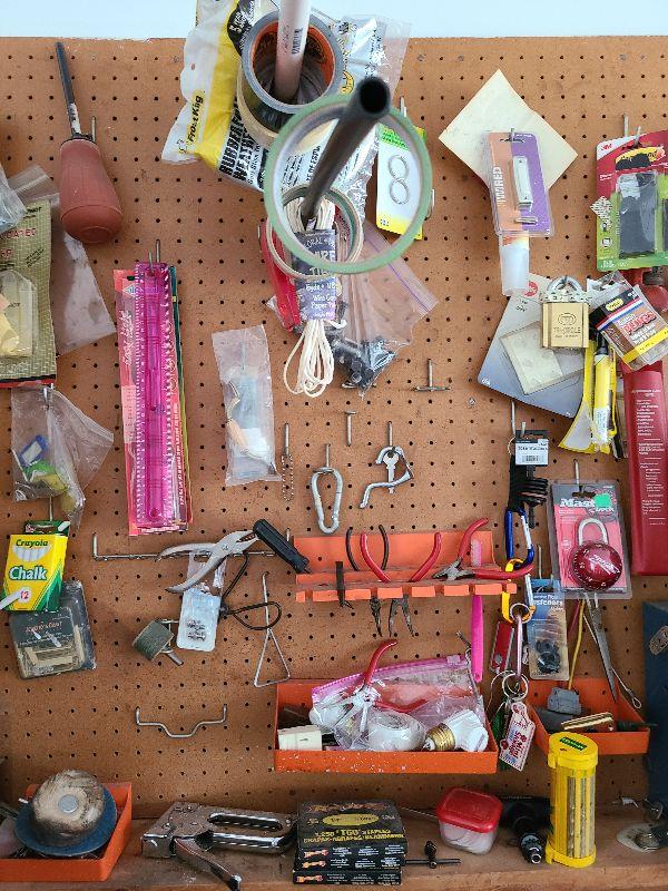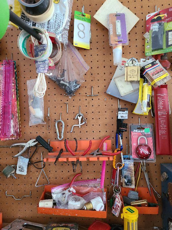 This is for all of the lots on the pegboard in this picture, but the peg board is not included. Please see pics for the exact contents of the lot, the condition of items in the lot, and the measurements if needed. Thank you for looking and have fun bidding.
