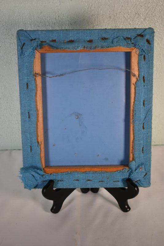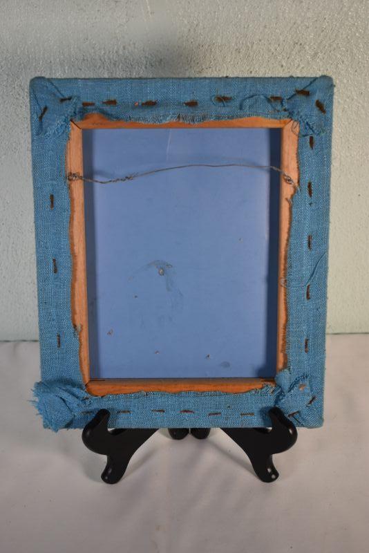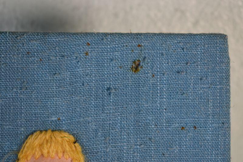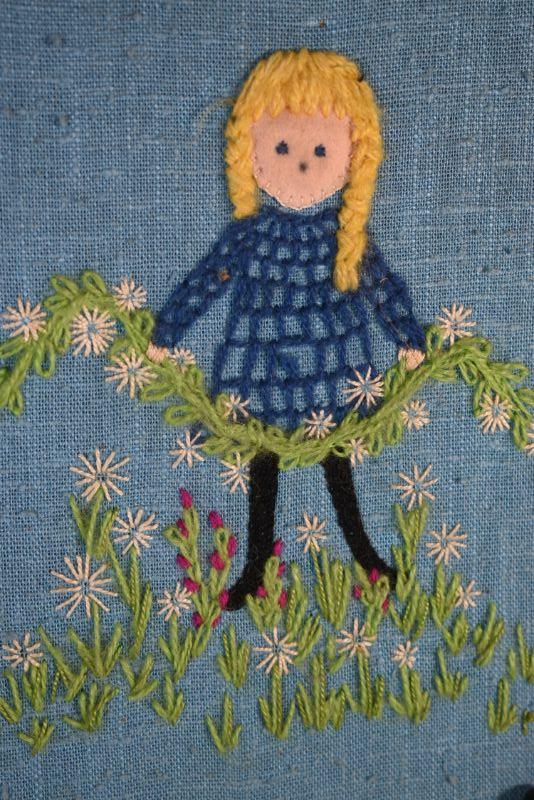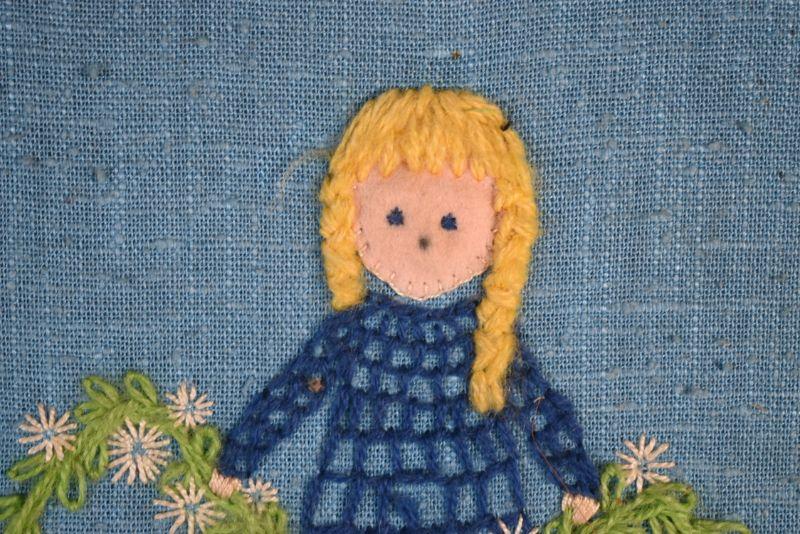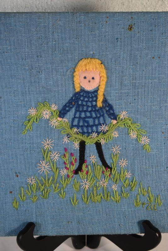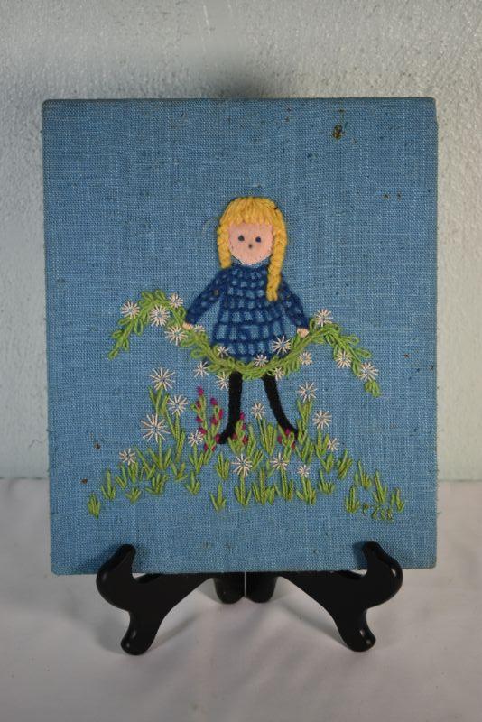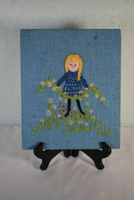 Handcrafted, embroidered, girl with flowers. Some soiling noted. Stretched on frame. 12x10.
