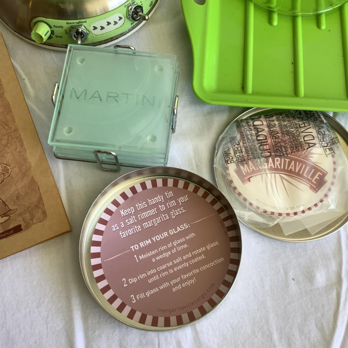 Comes with Green tray , two plastic margarita stems, Salt, coasters and manual