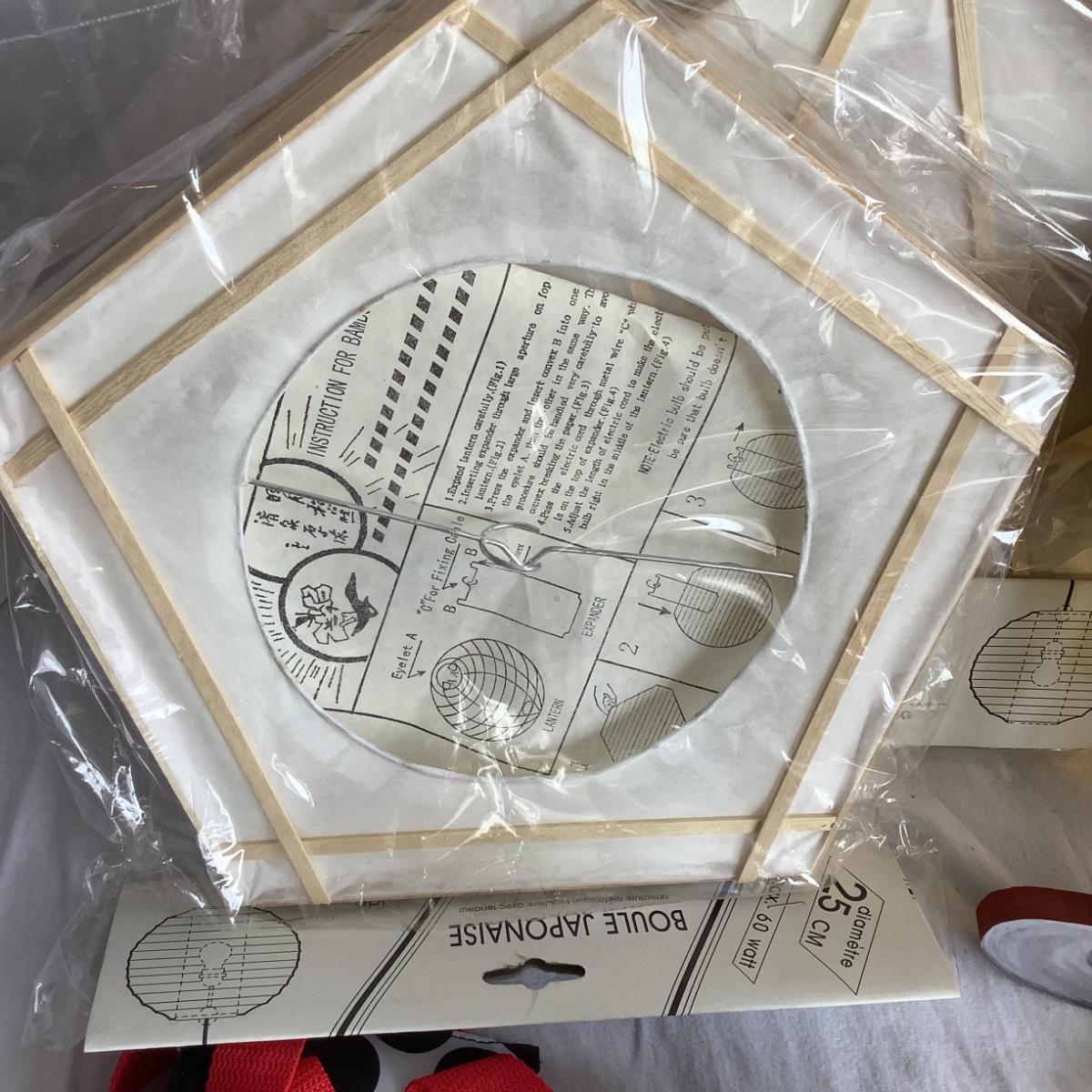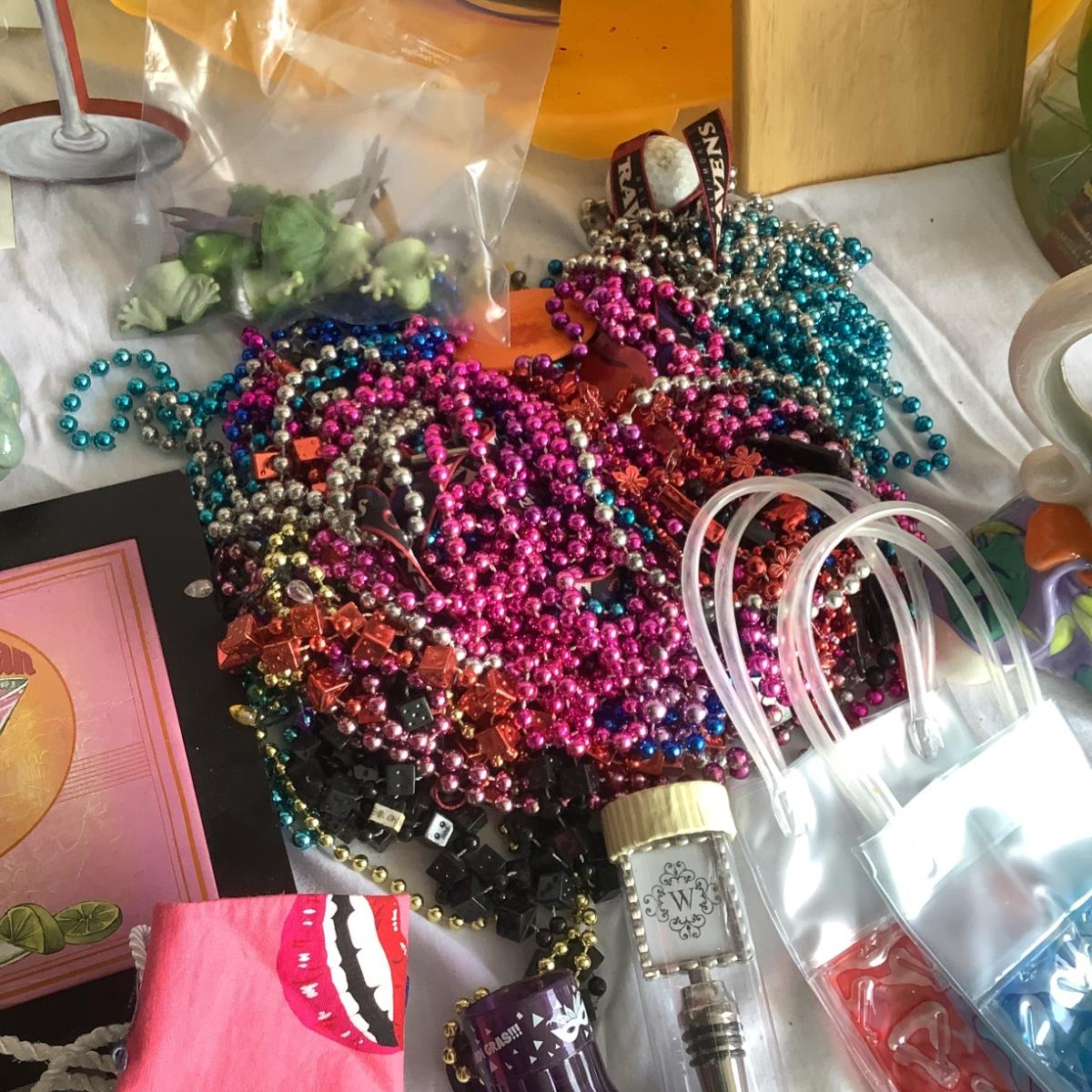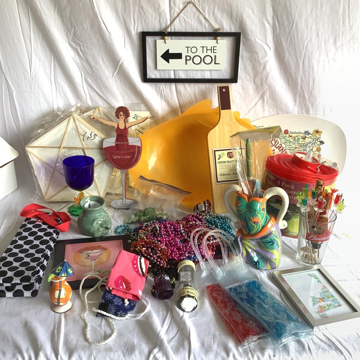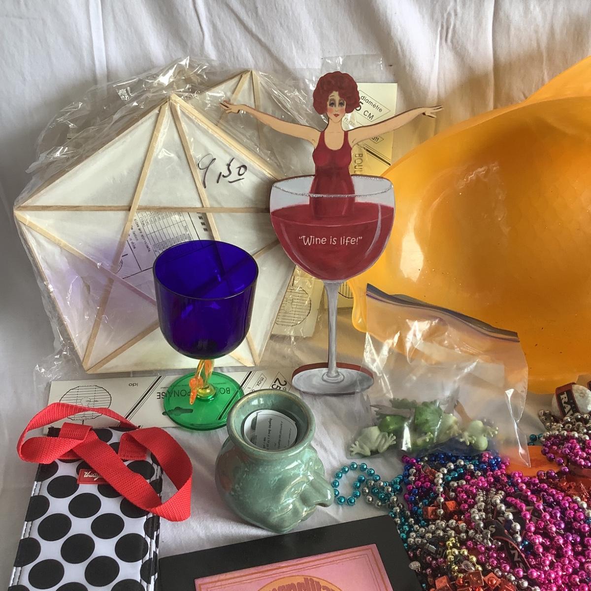 various paper lanterns, drink mixers, wine coolers, corks, assorted beads, fish party bowl, and more