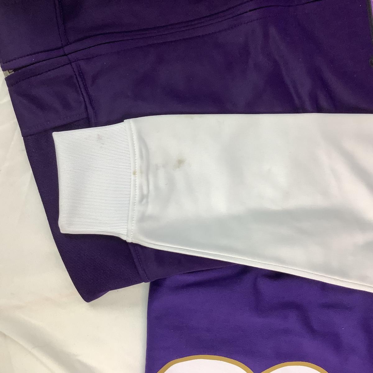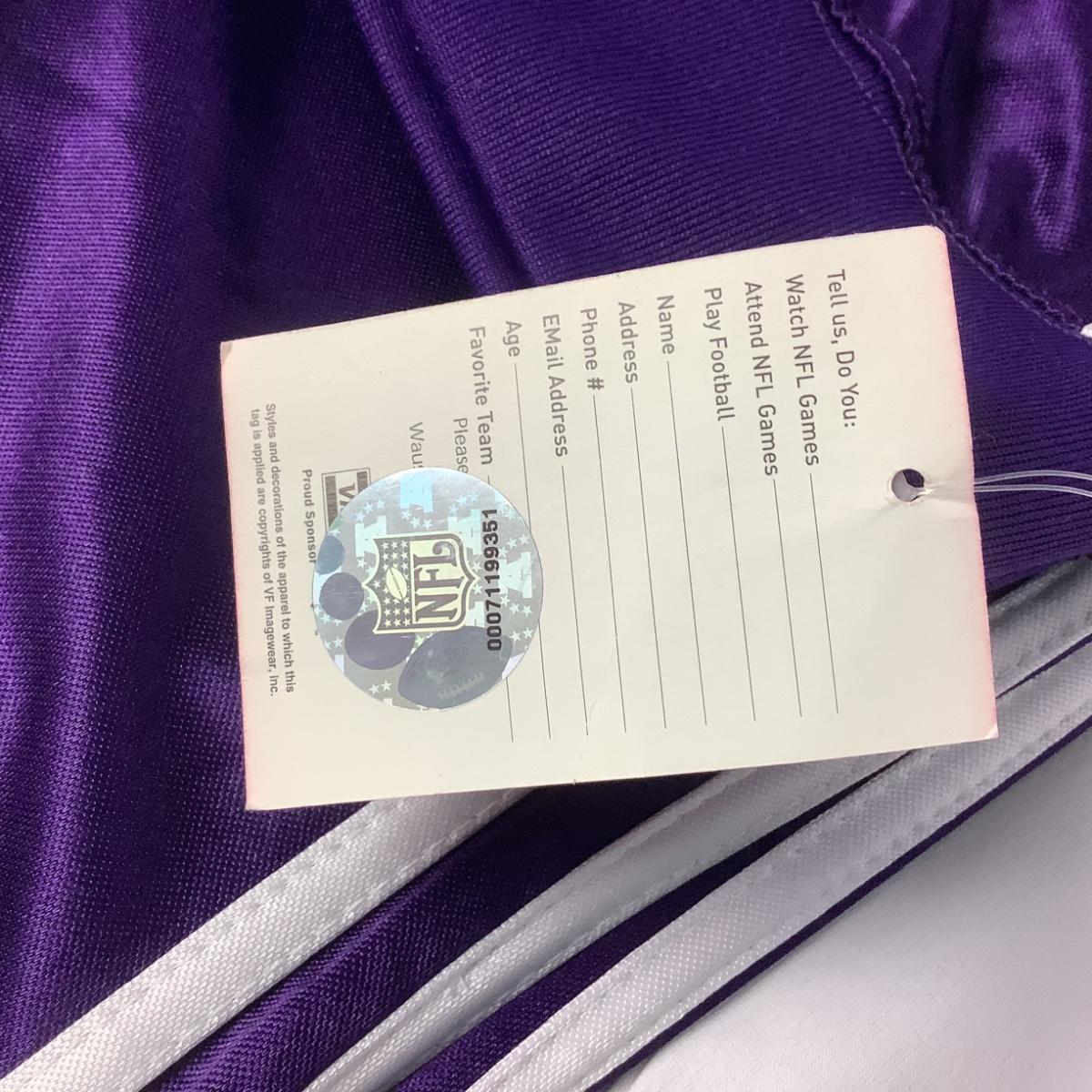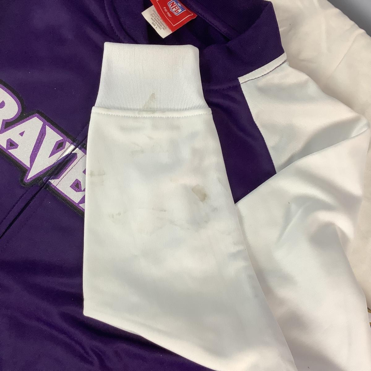 Comes with a front zipper-up with white sleeves women’s size large, ravens jersey number 8 size XL, authentic NFL ravens purple athletic-style pants size medium, and a ravens knit winter hat.