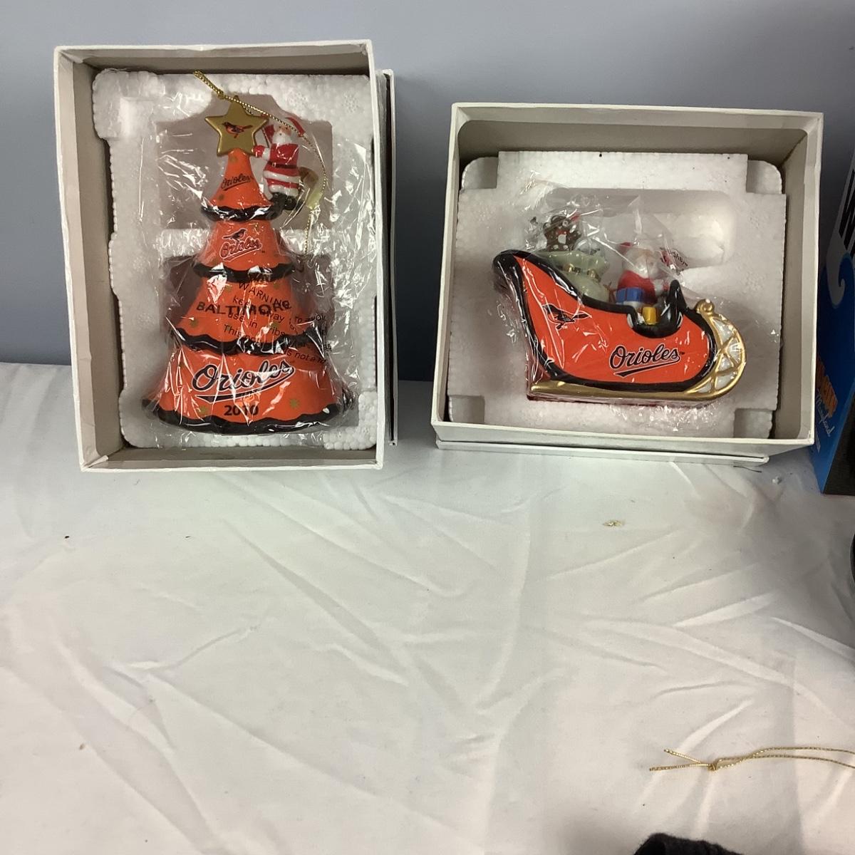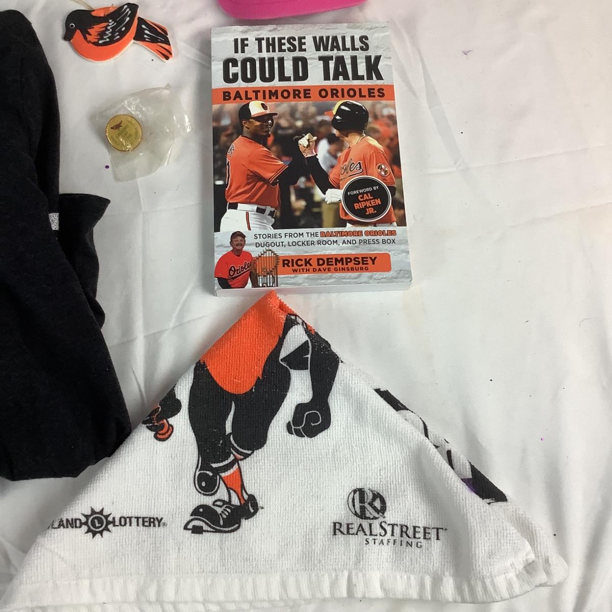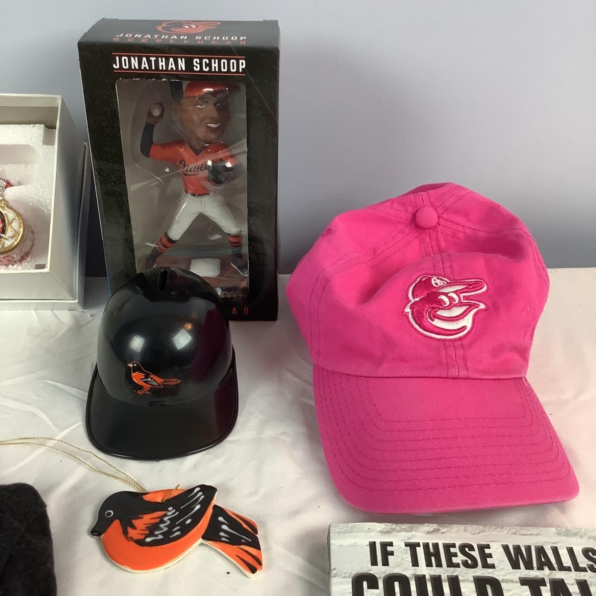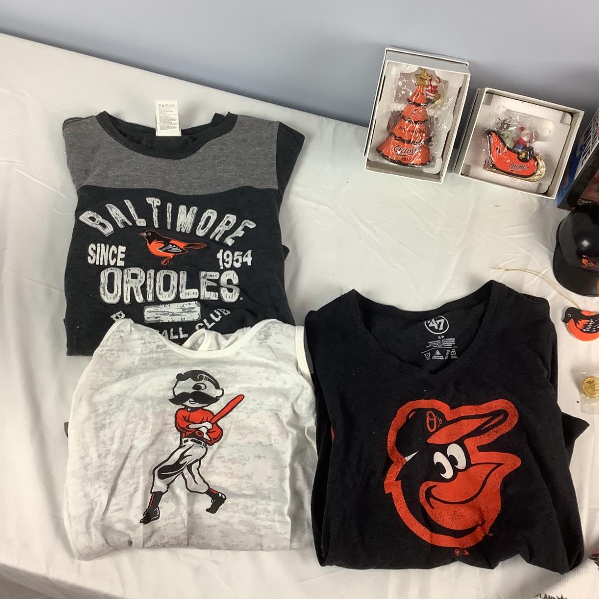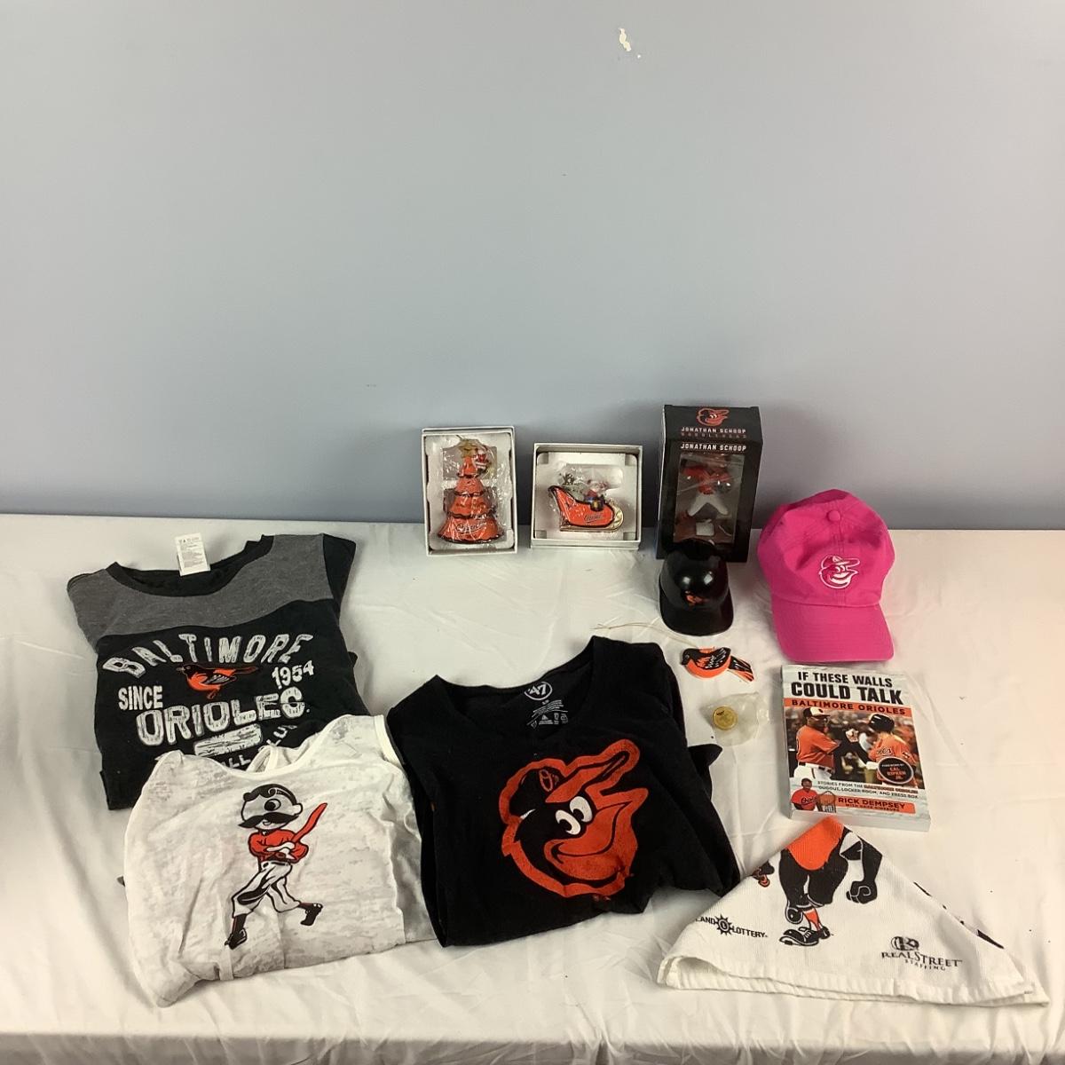 This set includes 2 black t-shirts(size womens small), 1 white womens (tank top size womens small), Pink orioles hat, black coin bank, Johnathan Schoop Bobblehead in box, 2 orioles ornaments, one orioles flat bird ornament, one small orioles pin badge, if these walls could talk paper back book, and a orioles white rag.