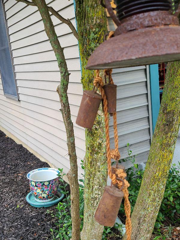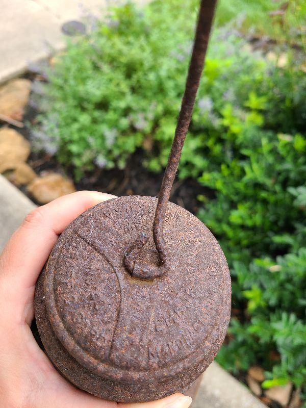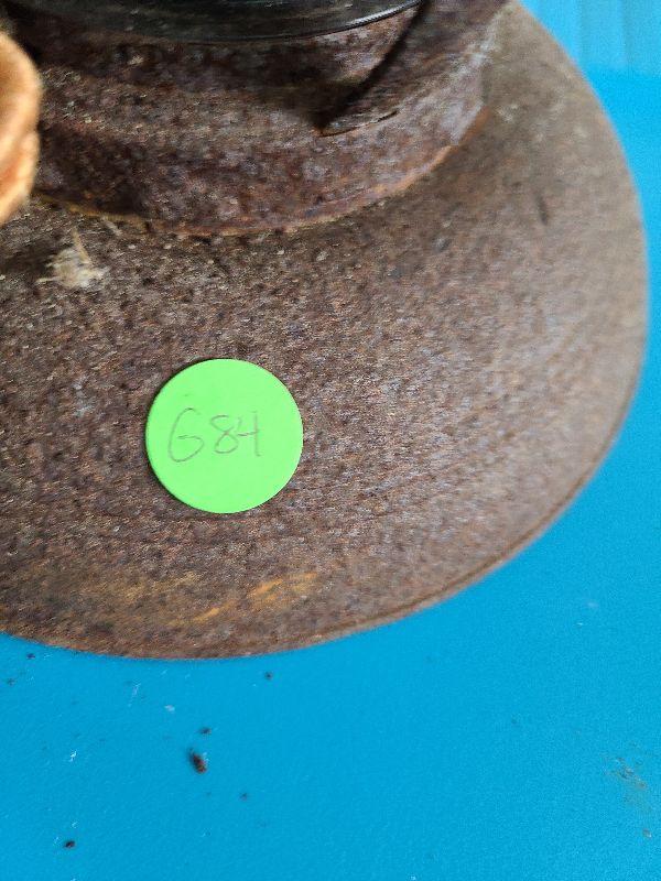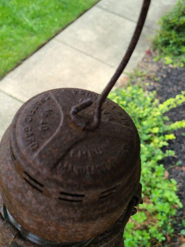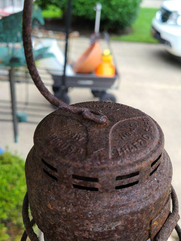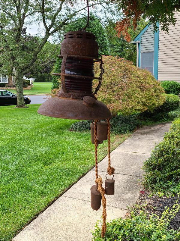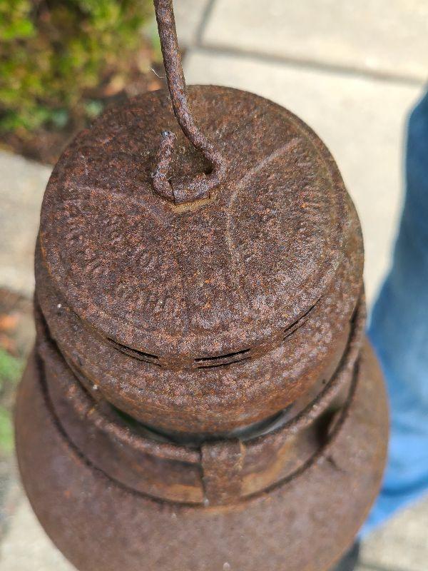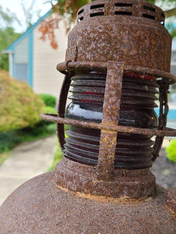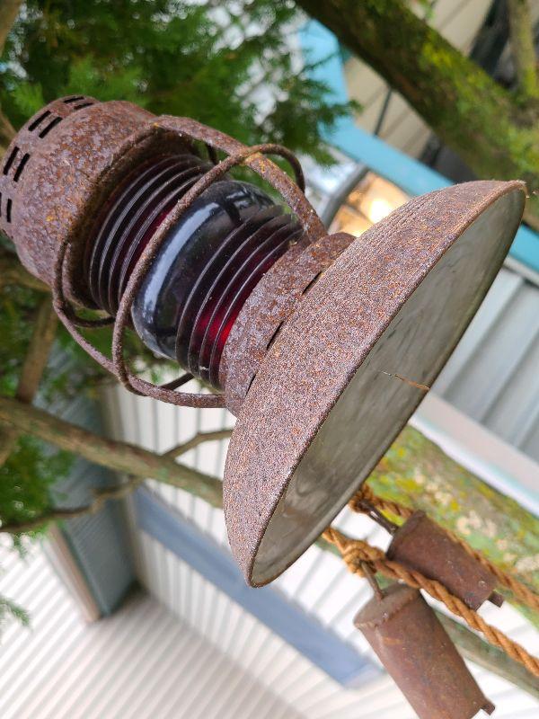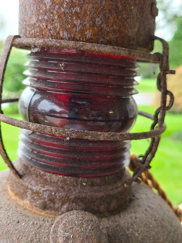 This is a very cool old lantern. It is rusted and has been used as yard art. The original thick red glass globe is intact. Lantern is 8 inches tall without handle. Please see all pics for the condition. Thank you for looking and have fun bidding.