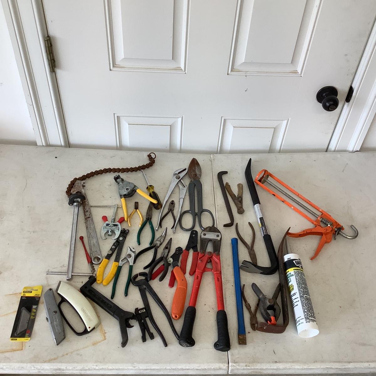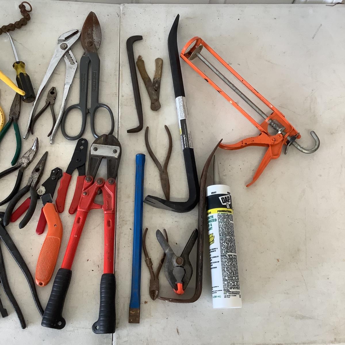 G887 Lot of Assorted Tools , Crowbars, Culk Gun, Metal Cutter,Bolt Cutters and more