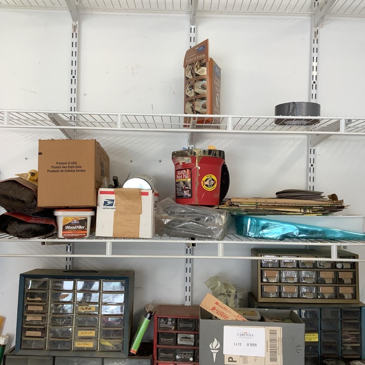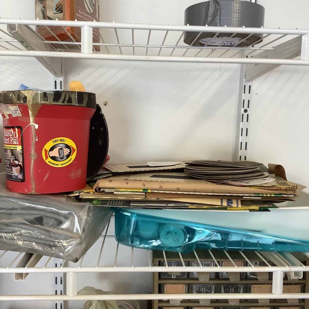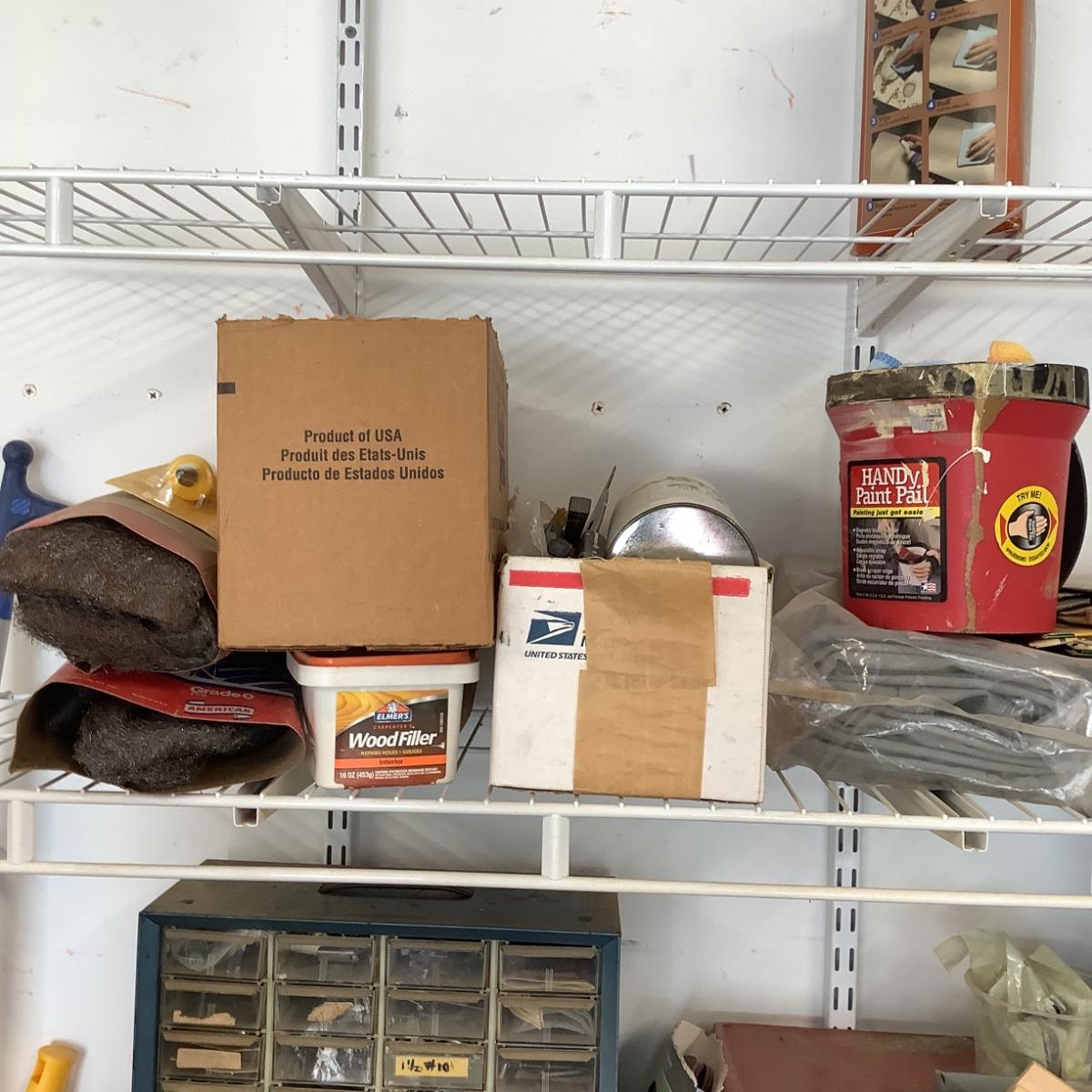 various sand paper, paint trays, paint pail, steel wool, wood filler, painting drop cloth