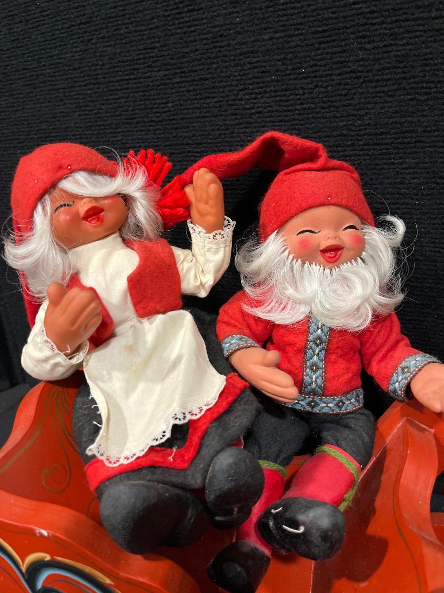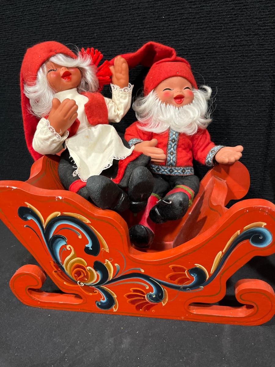 G91- Rosemaled wood sleigh & reindeer with 2 Norwegian dolls