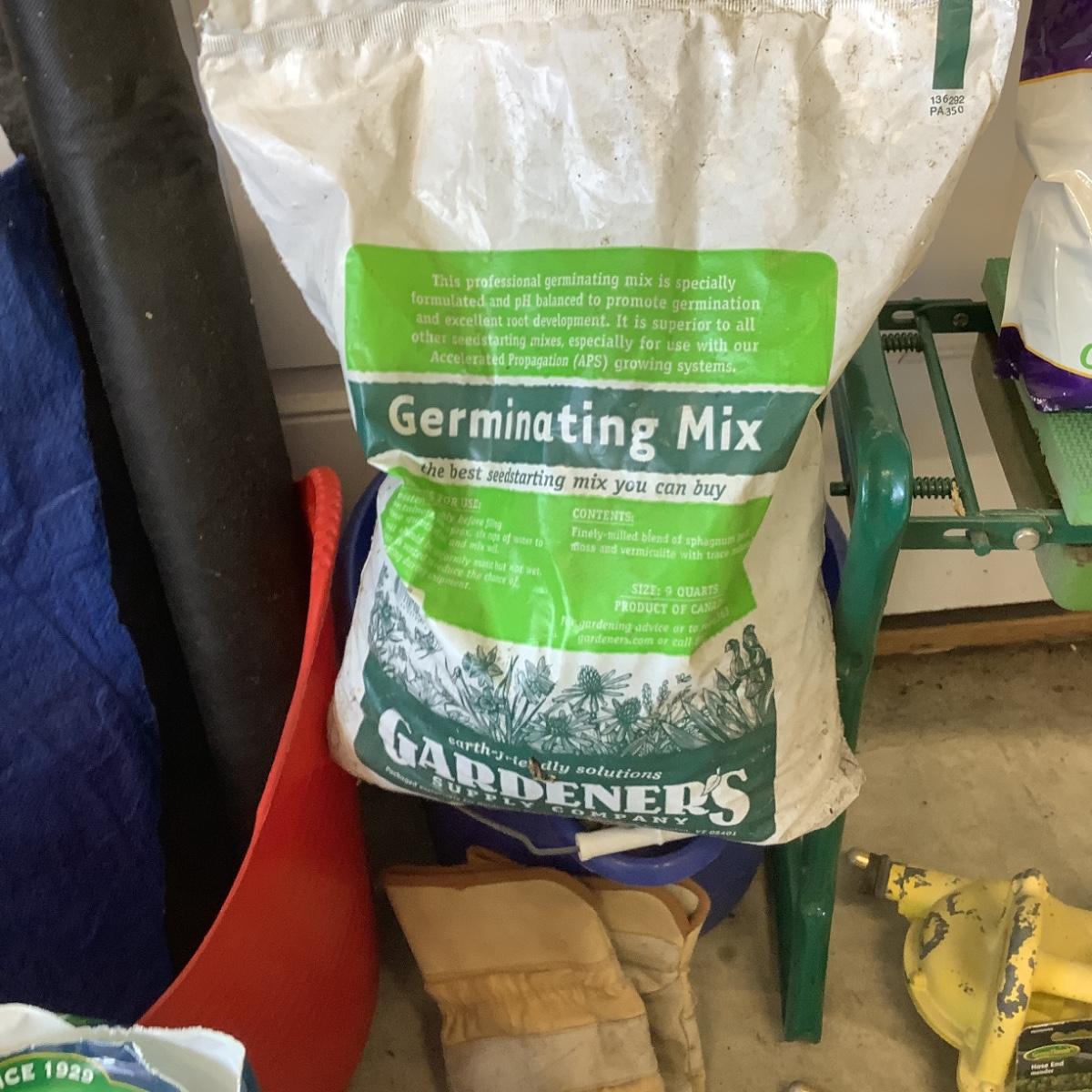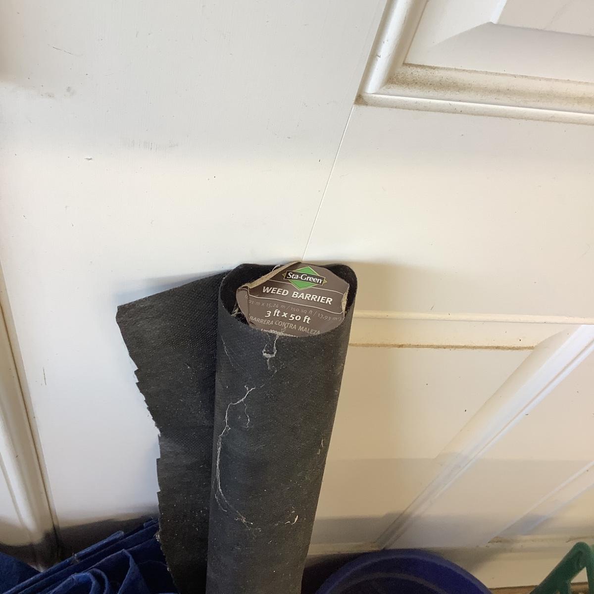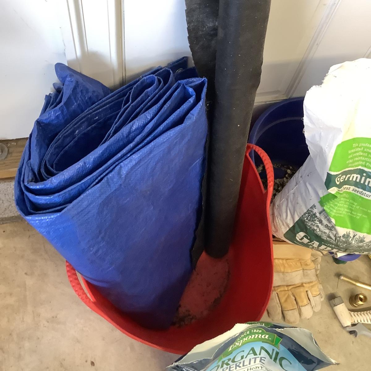 Blue tarp , weed barrier, germ mix, bone meal and, grass seed, garden bench, liquid fence, sprinkler, gloves, garden hose sprayer, and 4 ways hose adapter