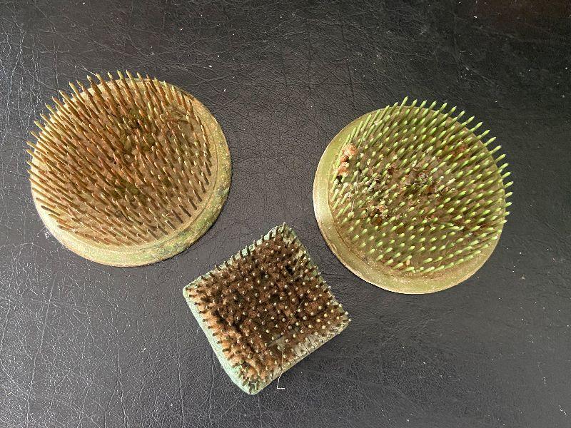 G95: Antique Metal Spiked Floral Frogs and Arrangements