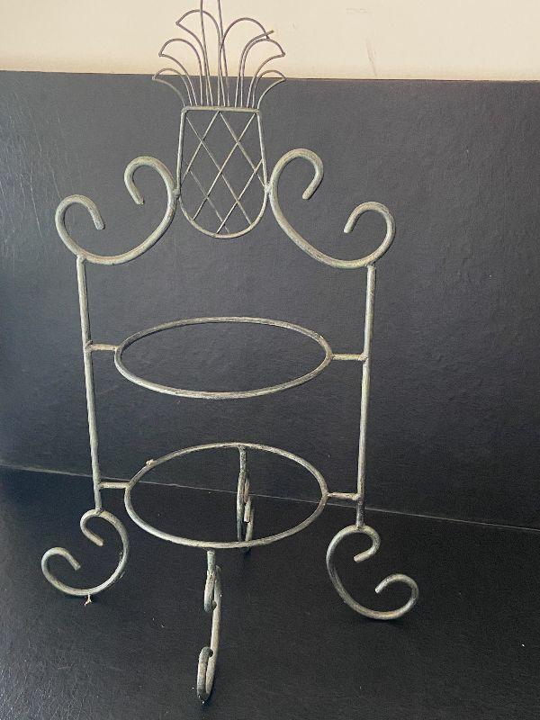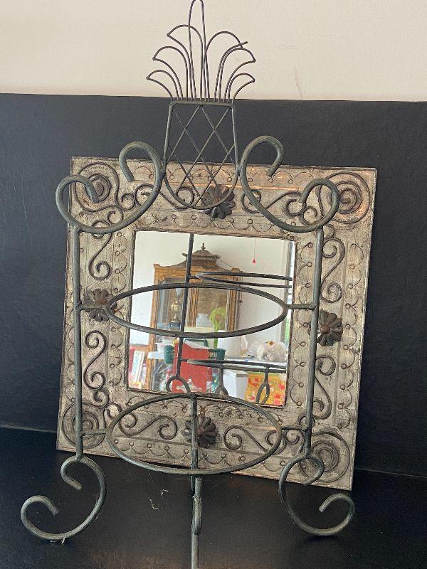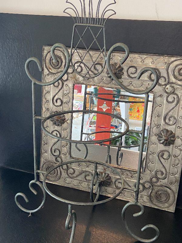 Fun tin mirror with etched designs, does show some wear on the back. Also included is a solid metal plate caddy with pineapple top, This does not come with plates, but can be used with any design of your choosing. Please see pics for condition of the items and sizes. Thank you for looking and have fun bidding.