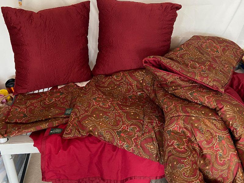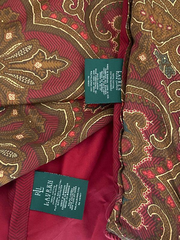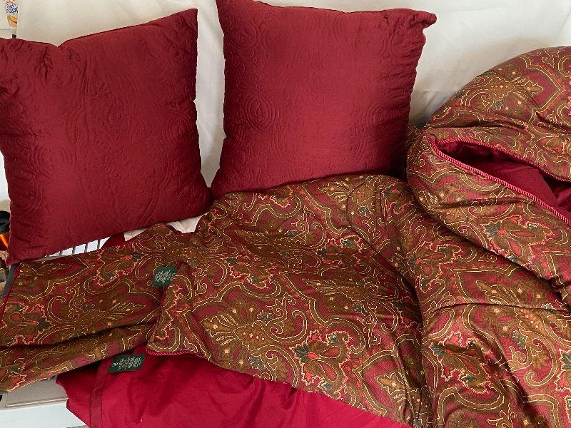 King Size Comforter by Ralph Lauren, Bed Skirt, Sham and 2 pillows. Please see pics for content of the lot. Will need to be cleaned, was kept in zippered plastic bag, but has been stored, could use a refresh. Thank you for looking and have fun bidding.