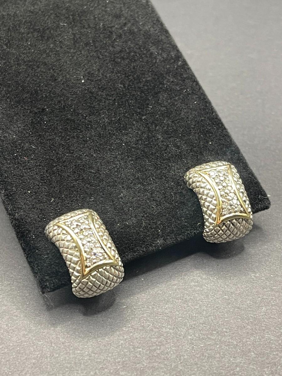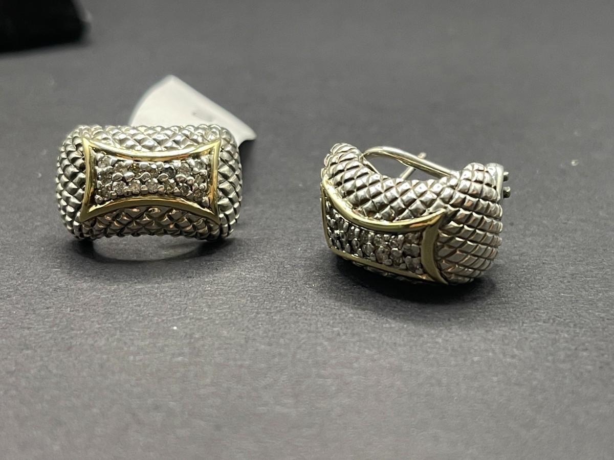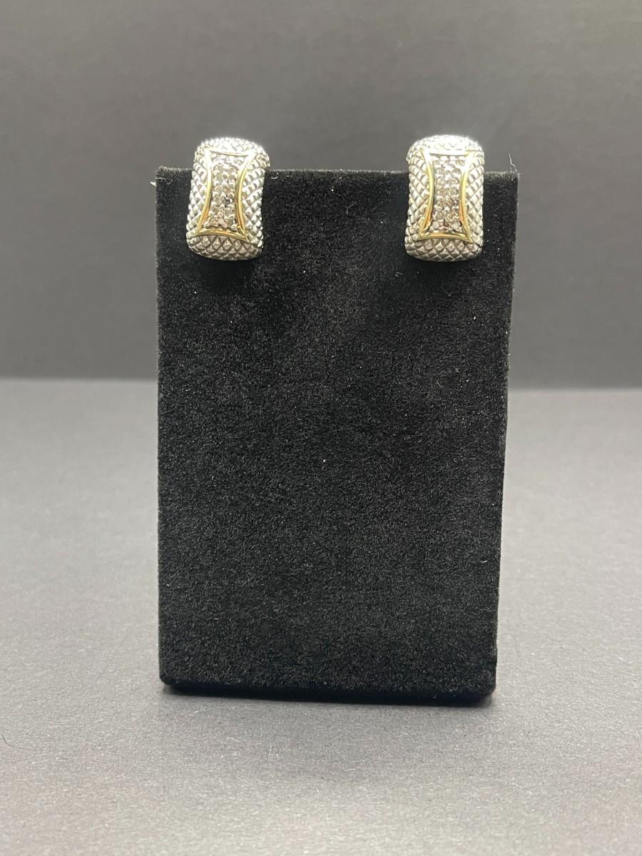 Gabrielle Bruni diamond drop earings set in sterling silver with 14K gold accents. Marked 925 and 14K. Diamonds are J-MI 3
