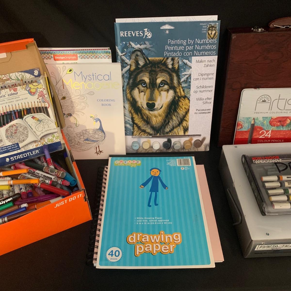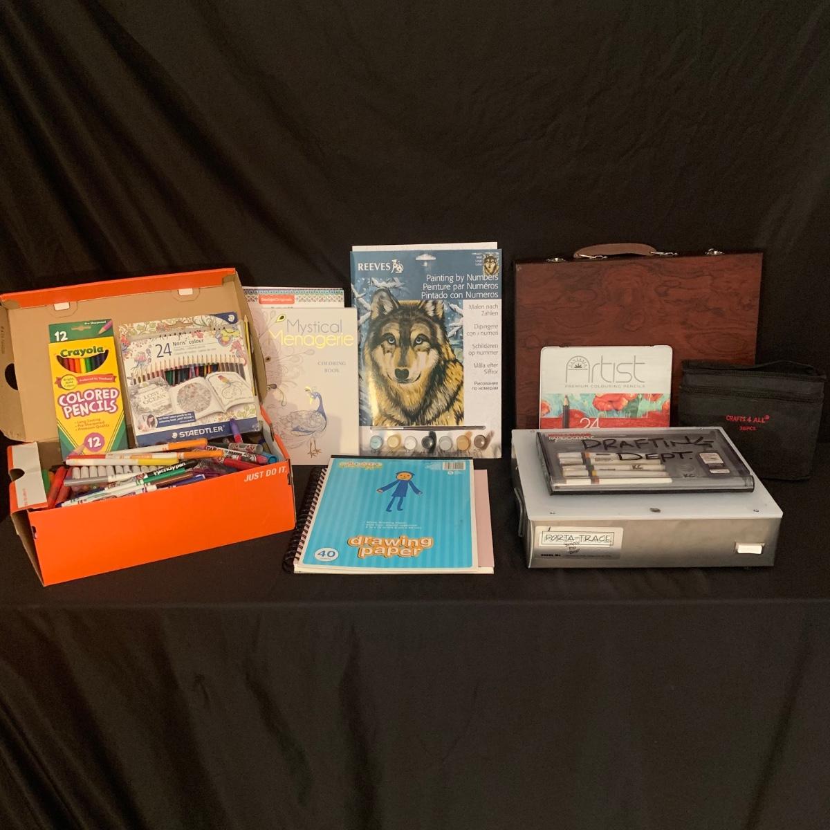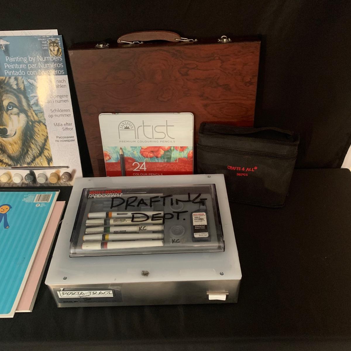 Incredible art lot includes six coloring books, Staedtler colored pencils, Artist Premium colored pencils, Paint by Numbers book, Gagne Porta-trace Lightbox, 36 Crafts 4 All fabric markers, wooden box with pastels and paints, shoe box of assorted markers, Koh-I-noor Rapidograph markers with ink, and more.