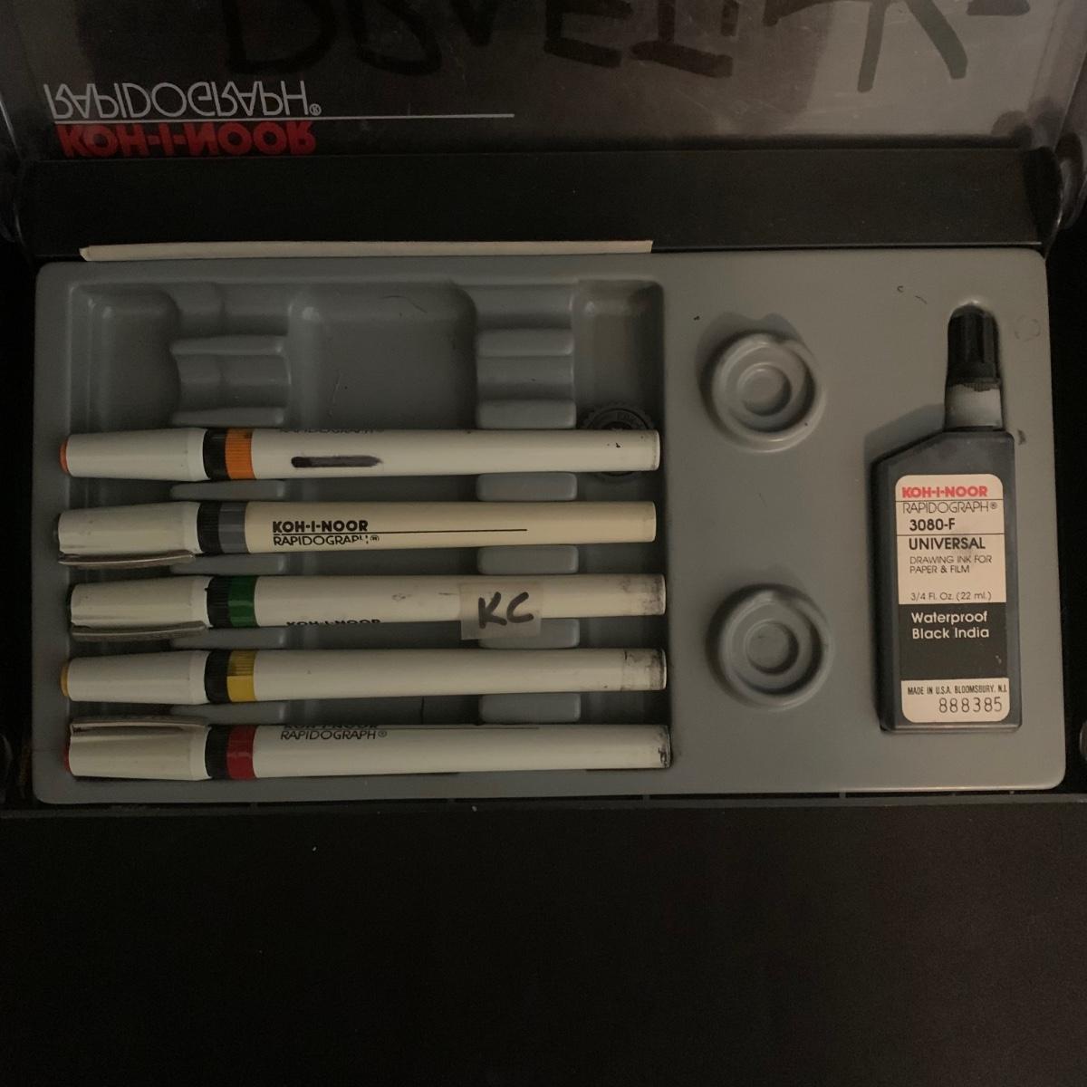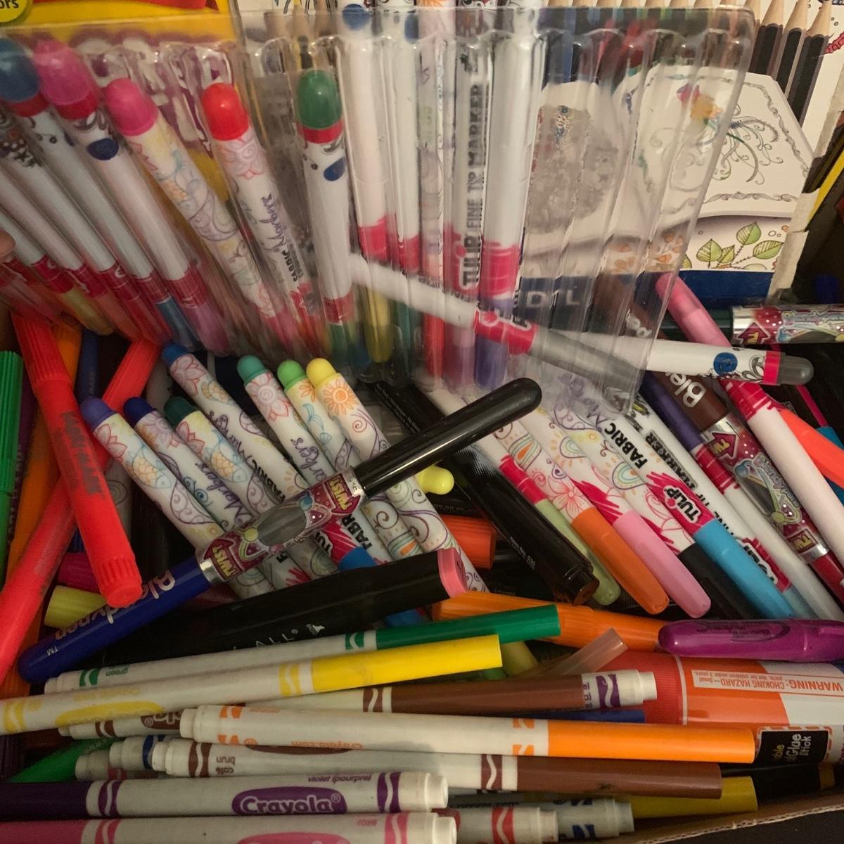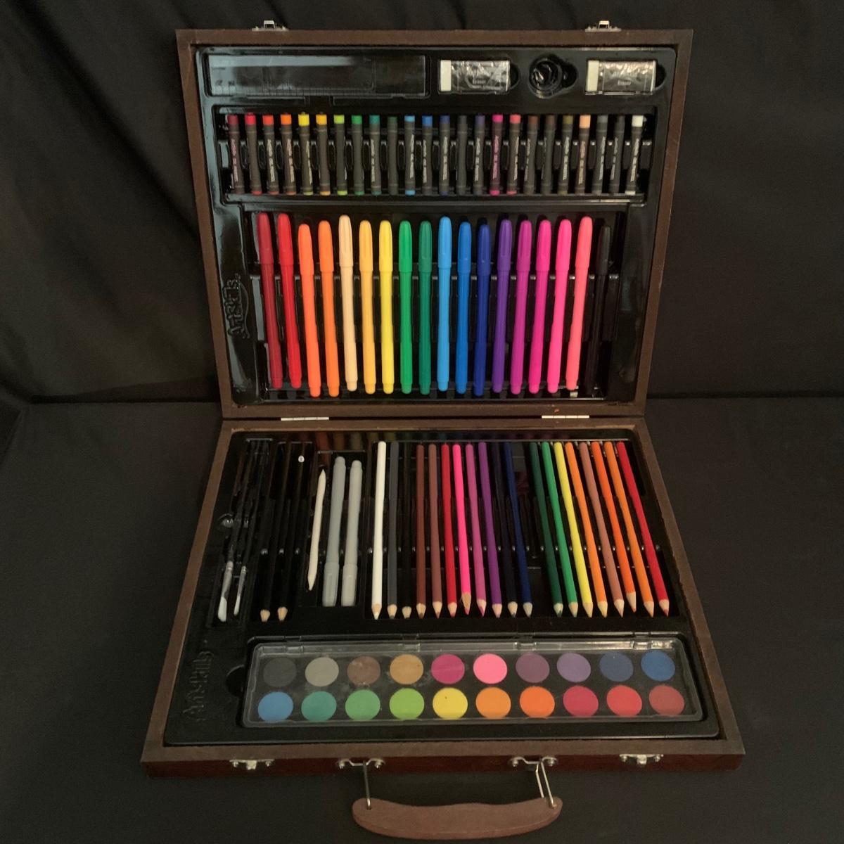 Incredible art lot includes six coloring books, Staedtler colored pencils, Artist Premium colored pencils, Paint by Numbers book, Gagne Porta-trace Lightbox, 36 Crafts 4 All fabric markers, wooden box with pastels and paints, shoe box of assorted markers, Koh-I-noor Rapidograph markers with ink, and more.