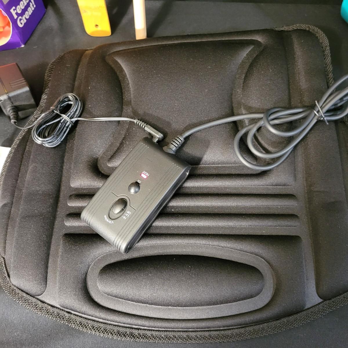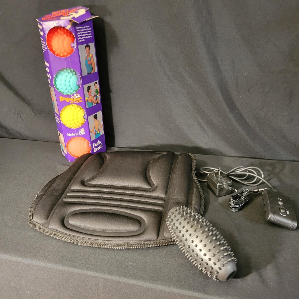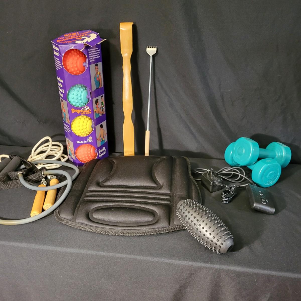 A collection of self care equipment in good condition with no notable damage. Included is a Blueridge heated cushion that was tested and works. A Gaiam foot roller that is battery powered and untested. Also included are a pair of 3lb weights, Goosebumps massaging balls, two back scratches, a power band with handles and a jump rope. Heated seat pad measures approximately 15.5" x 15" x 2" Shipping available