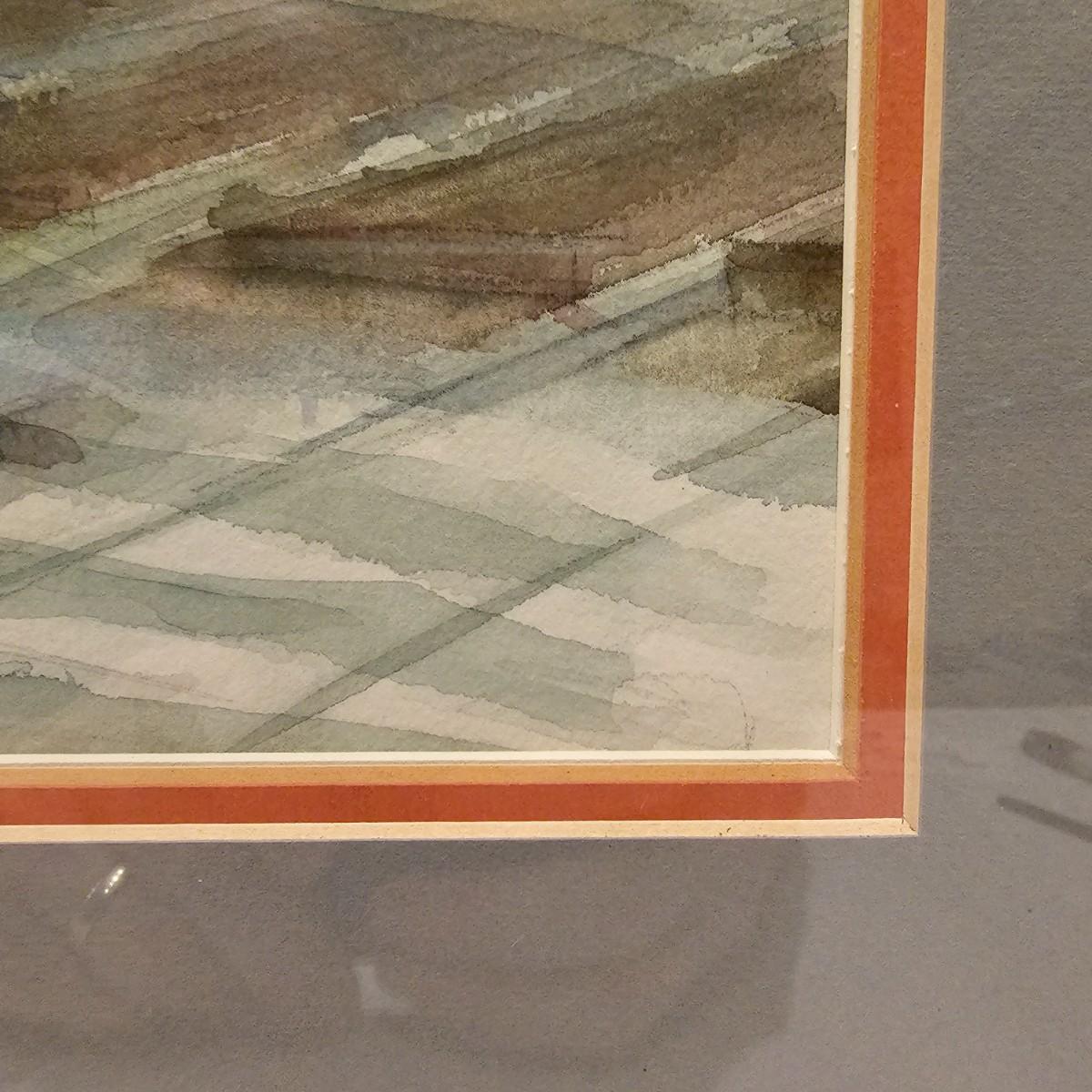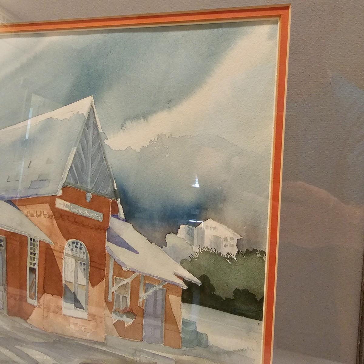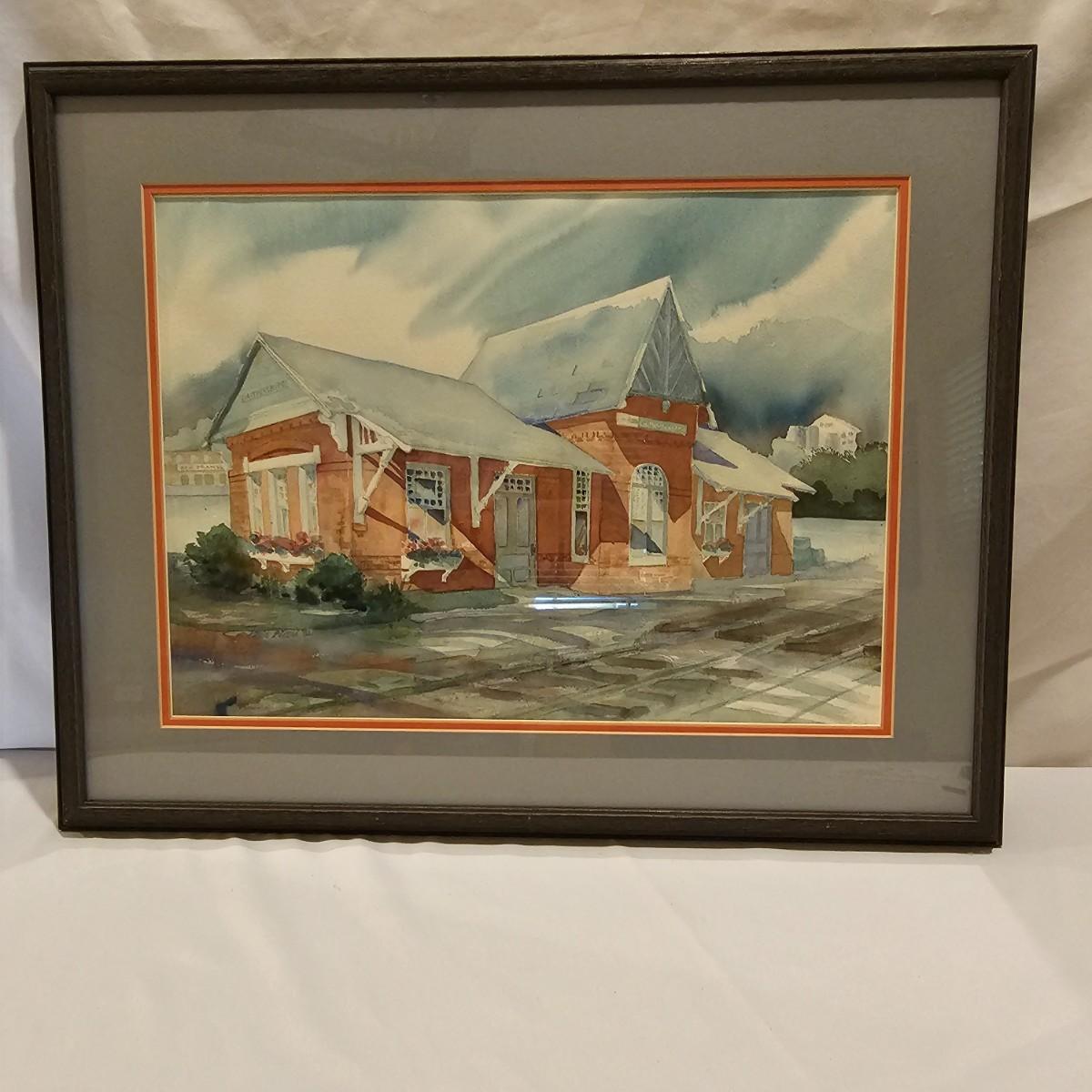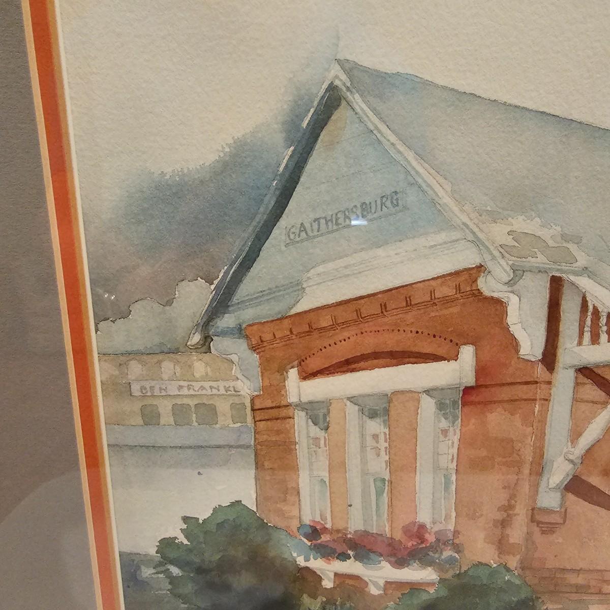 An original watercolor of the Gaithersburg, Maryland train depot by artist Kathie Blozan. Signed and dated. Wood frame with glass, art measures 27.5" x 1.5" x 22"H. See photos for details. Shipping available. Shipping art can be costly. We suggest contacting our preferred local shipping provider, Postage Express, with dimensions and getting an estimate before bidding: (828) 670-5501 or postageexpress@yahoo.com.