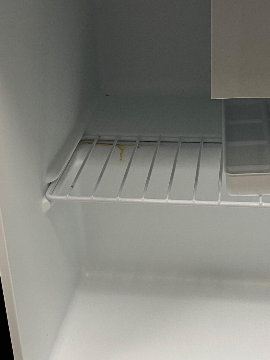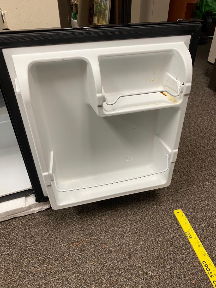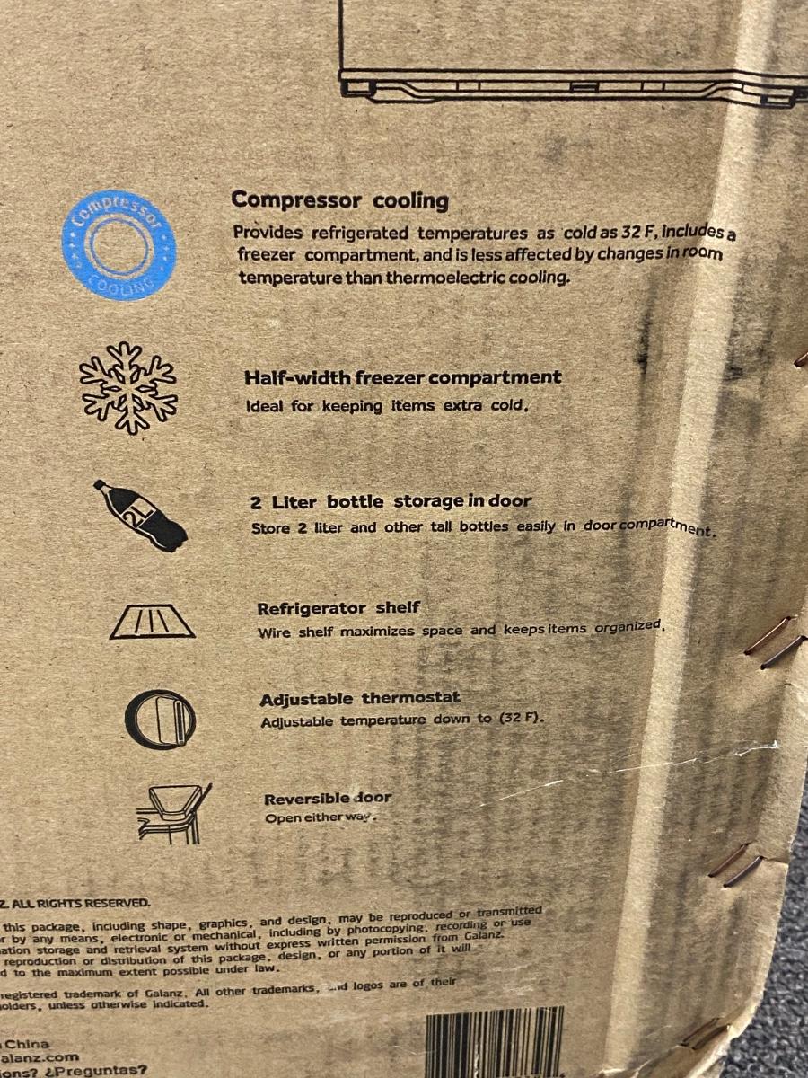 Galanz 1.7cu ft mini fridge. Small freezer spot inside, can hold a two-liter bottle in door. In original box, opened. Plugged in and it seems to work. Unsure if it was actually ever used. There are some spots inside, but the white plastic looks very clean other than those spots.